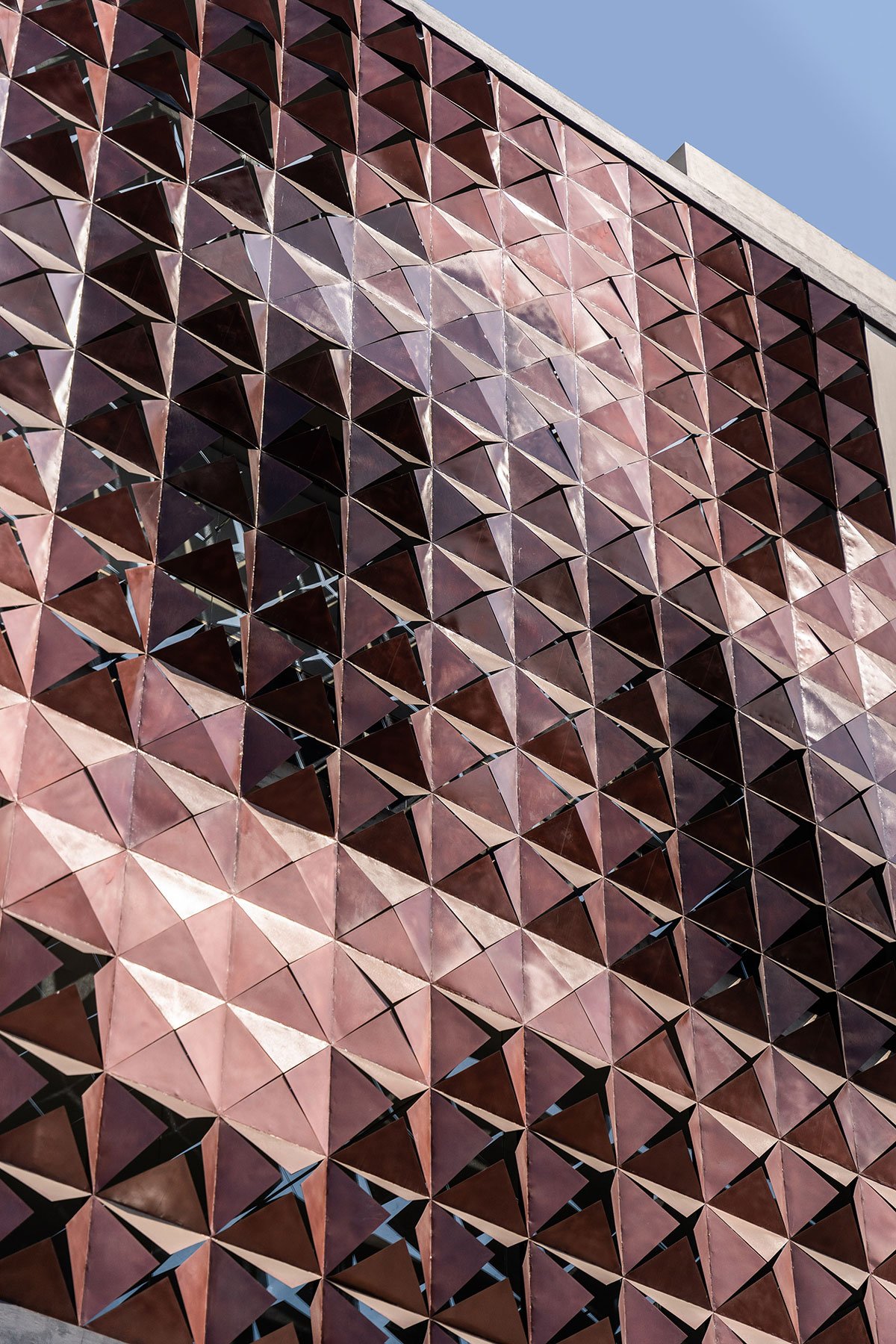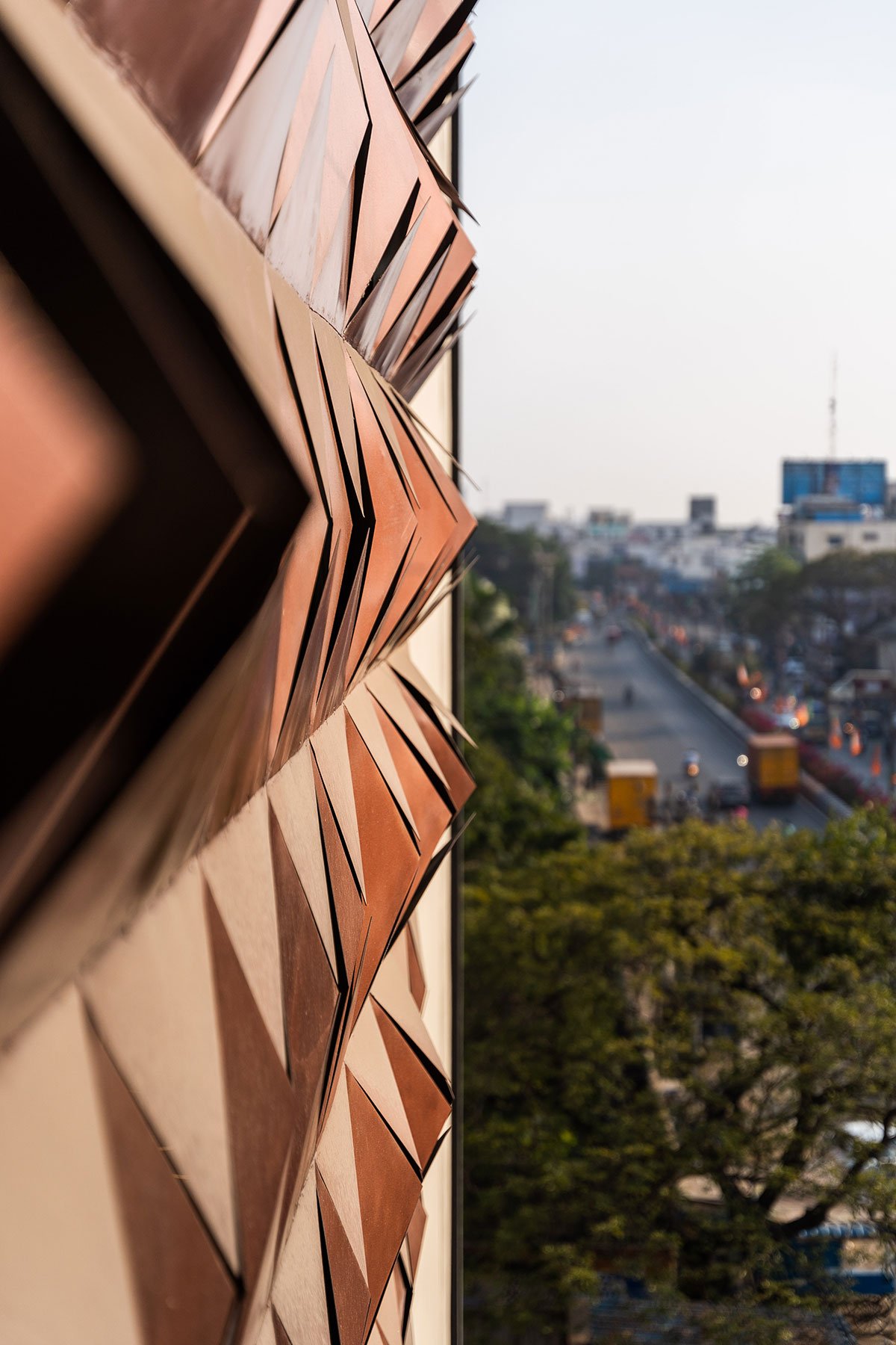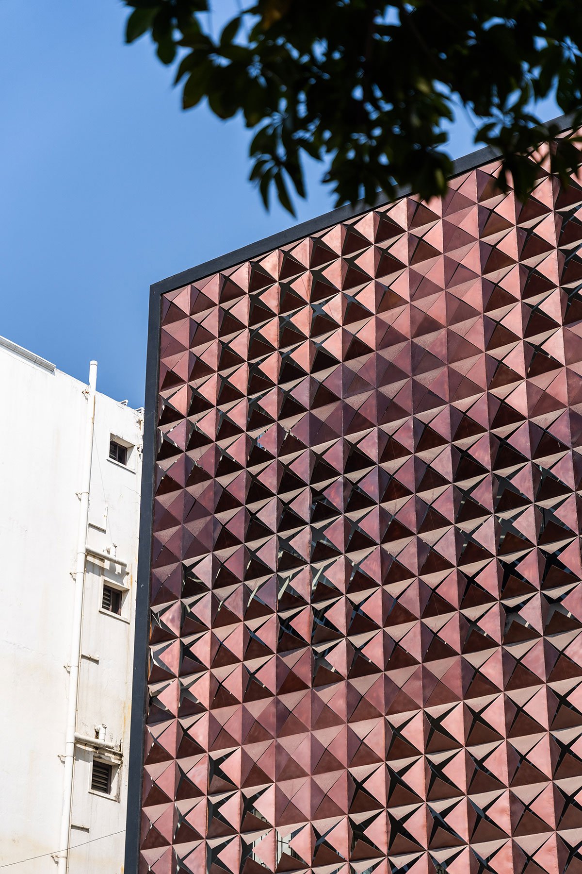 The aperture of these panels varies from 15 degrees to 45 degrees. The larger the degree of aperture, the more the light it allows and vice versa. The panels are finished in metallic copper paint. The façade looks dynamic with the constant change in sunlight and shadow thereby seeking the attention of passers-by. Additionally, these panels system helps to reduce the amount of glare and heat gain, creating a pleasant working environment.