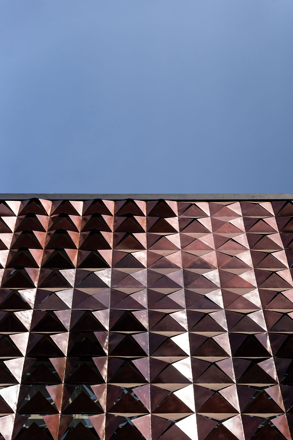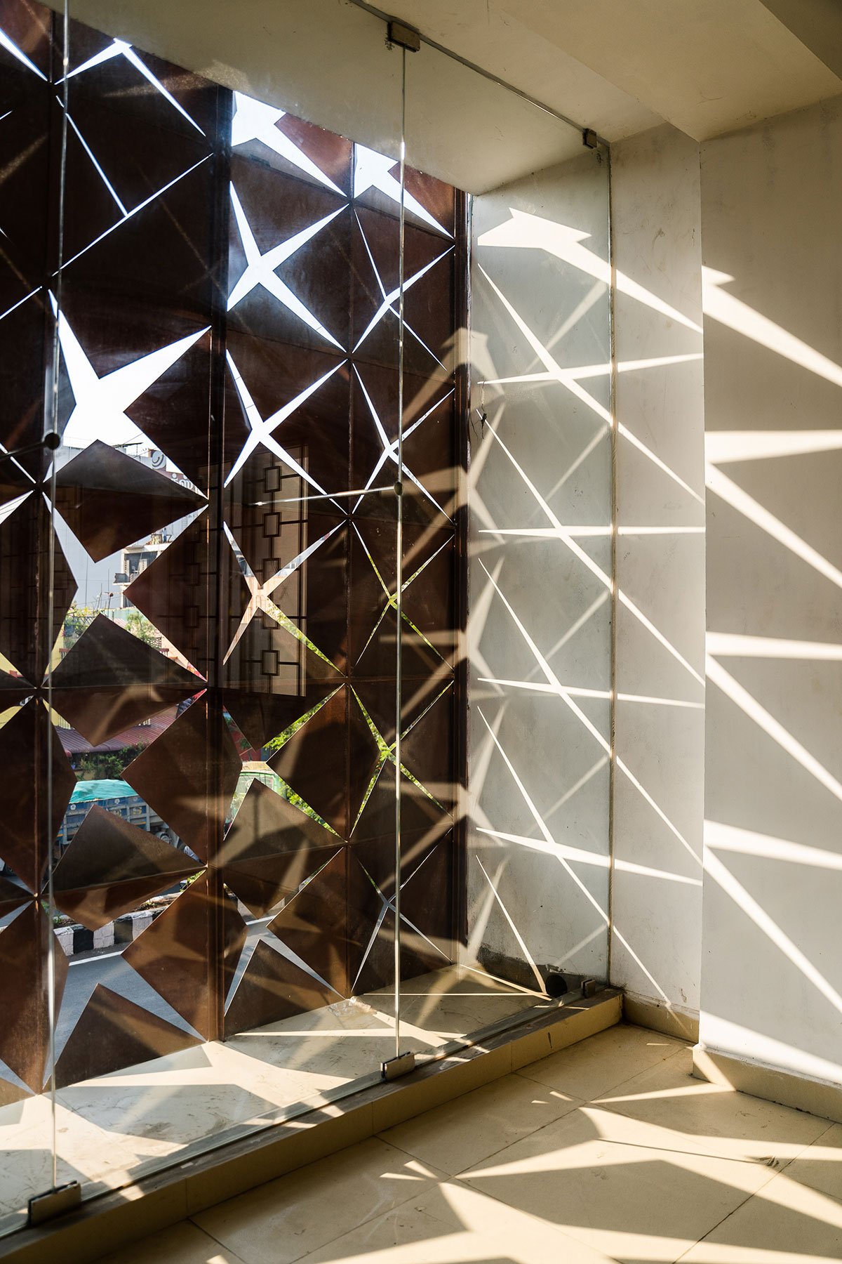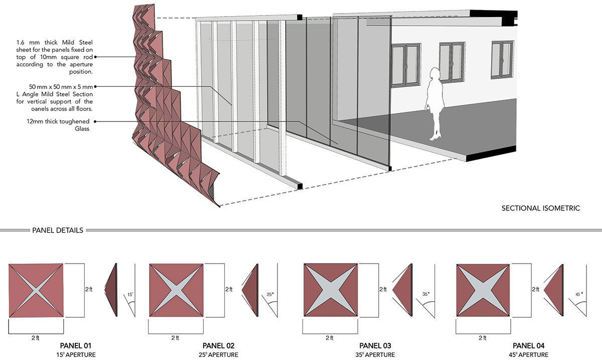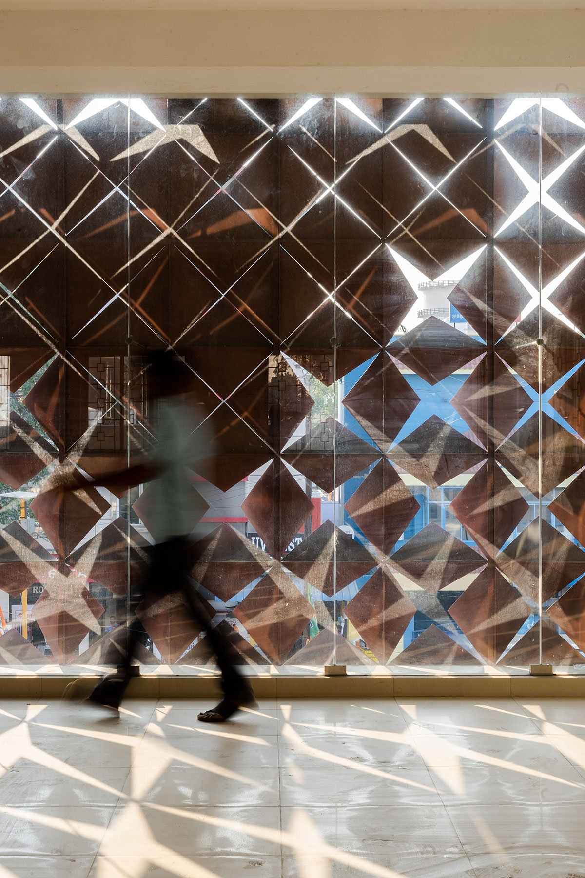The aperture of these panels varies from 15 degrees to 45 degrees. The larger the degree of aperture, the more the light it allows and vice versa. The panels are finished in metallic copper paint. The façade looks dynamic with the constant change in sunlight and shadow thereby seeking the attention of passers-by. Additionally, these panels system helps to reduce the amount of glare and heat gain, creating a pleasant working environment.