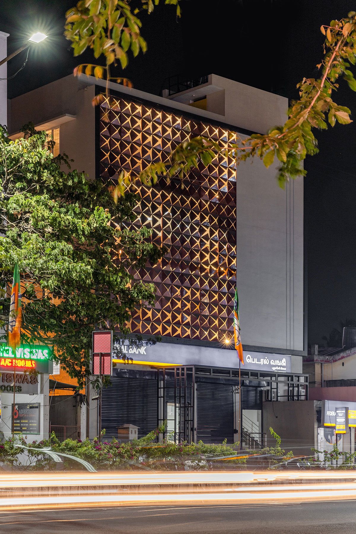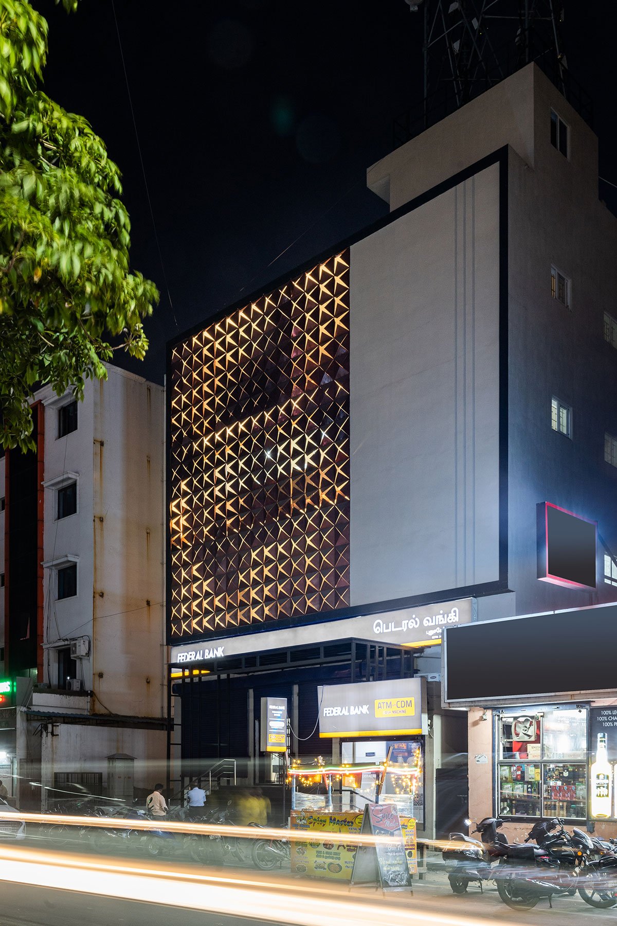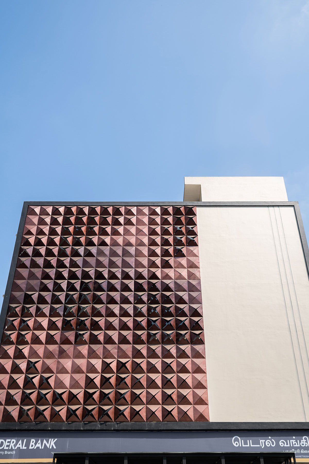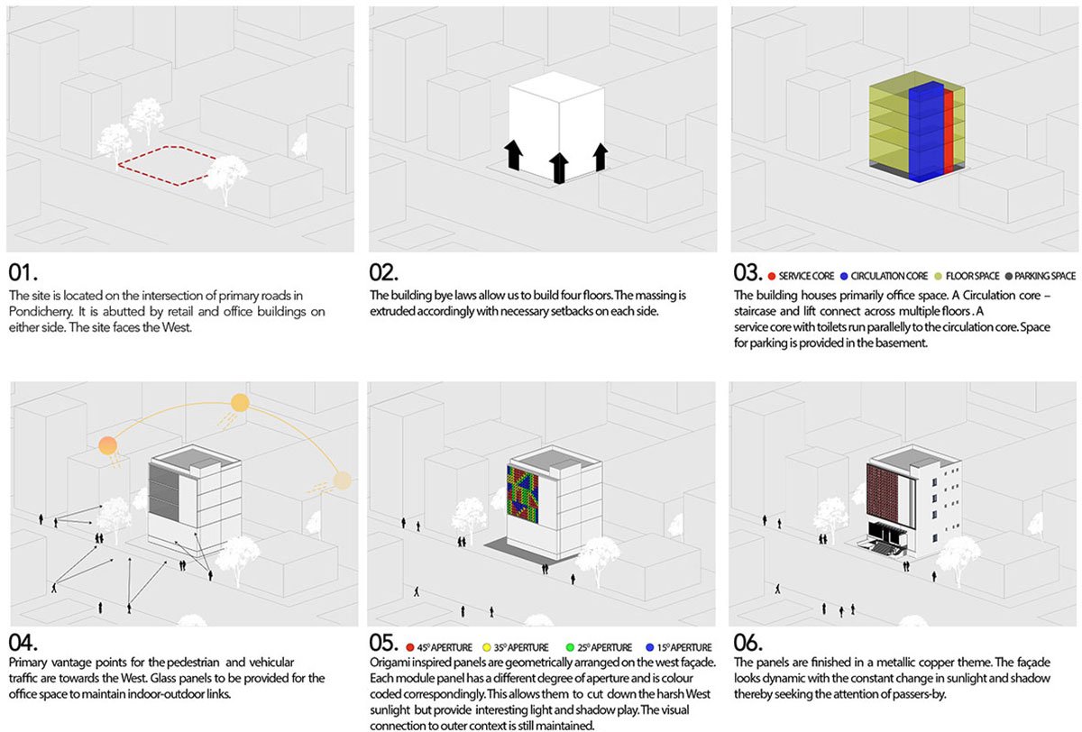 [Text as submitted by architect] The site is located on the intersection of primary arterial roads in Pondicherry. It is abutted by retail and office buildings on either side. The site faces the West hence careful design considerations were to be made to allow the natural light but block the heat from the sun. The principal intent was to design a façade that catches the vehicular and pedestrians’ attention and thereby creating an identity for the building.