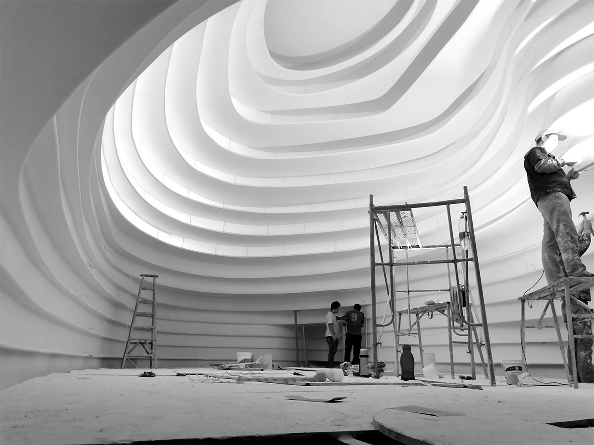 The wormhole is constructed of a structural frame made of galvanized steel studs that are welded on-site after a deliberate layout placement is done by projecting curves onto a grid. Fiber-cement backer board is then used to line the frame, and precast GRC panels made specifically for each curvature are installed. From a secondary steel frame bolted into the floor slab above, steel cables hang rings of molded GRC panels on the upper portion of the wormhole shell. Frosted strips of bent acrylic are then slotted in between the suspended panels to create translucent face panels.