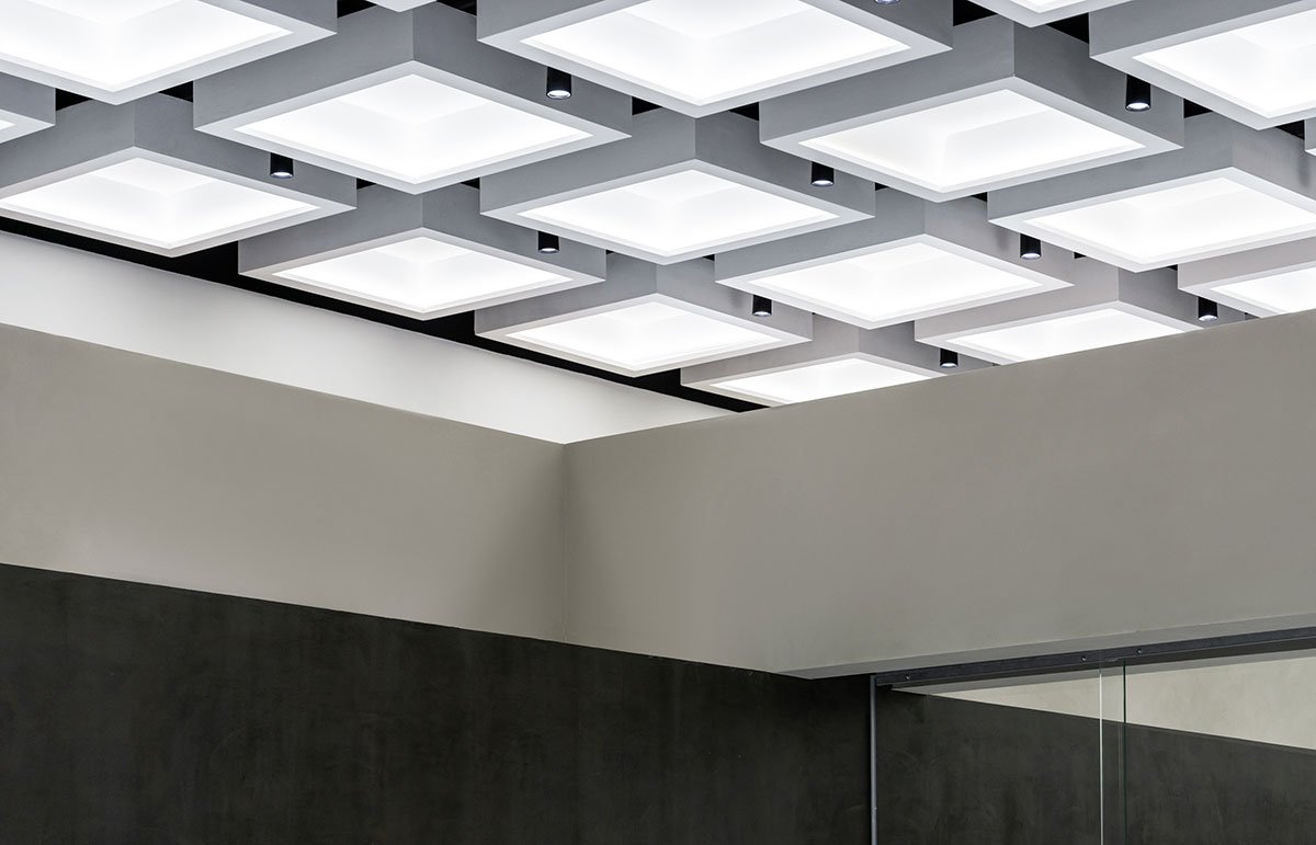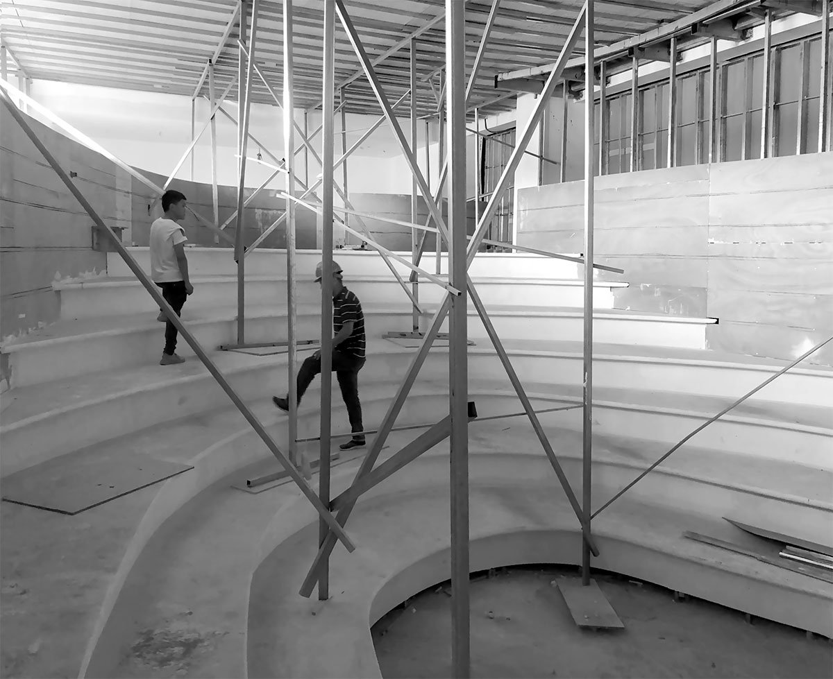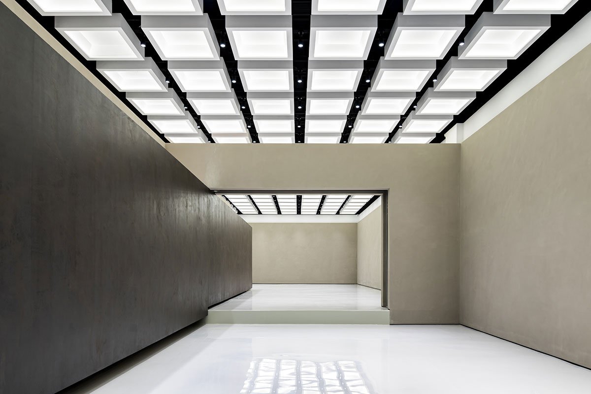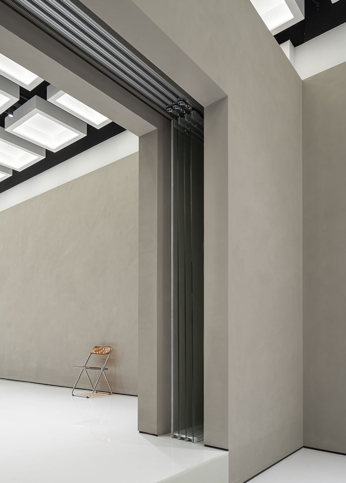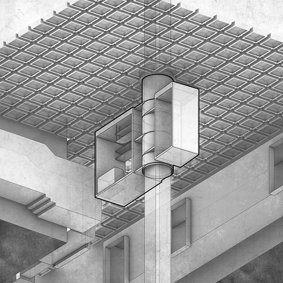 On both ends of the central wormhole, there are gallery spaces for agile programming needs. Unlike the wormhole, the galleries act as an anchor to the familiar, layering the latent and the seemingly banal. The grid present in the coffered ceiling is symbolic of a shared consciousness. It is measured and standardized, the existence of the grid is a calculated act of topography. The walls of the galleries are plastered by hand, whereas the floors are made of polished epoxy. The rotating partition in the west gallery is used to configure spatial divisions, creating changing boundaries based on programming needs and occasion. The rotating partition is equipped with electrical sockets and a hidden water inlet to function as a bar or a coffee stand during events. The gallery spaces can be subdivided by automatic glass partitions that are hidden in a pocket wall. The pocket wall is built to be a half wall, so the coffered ceiling is allowed to extend beyond.