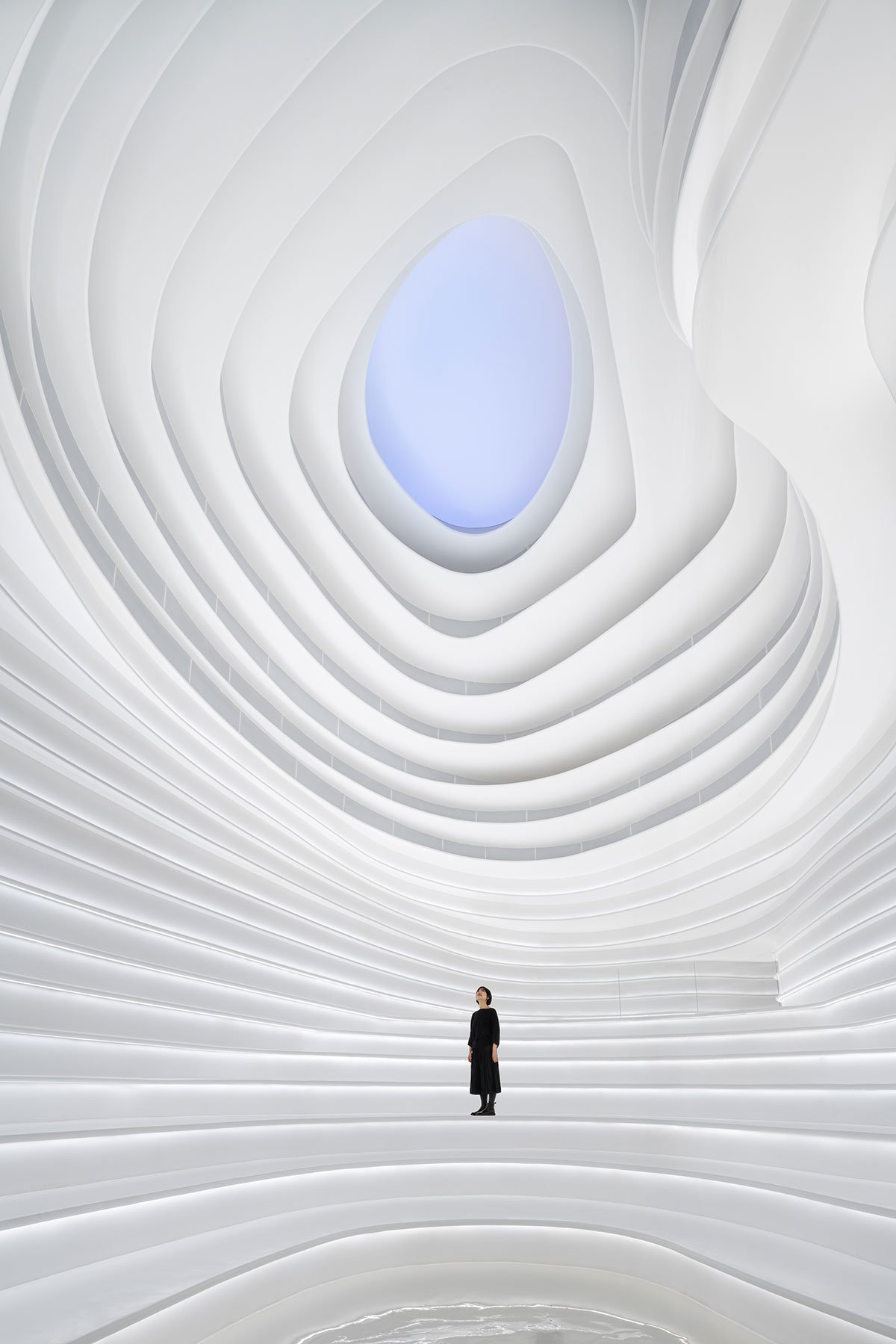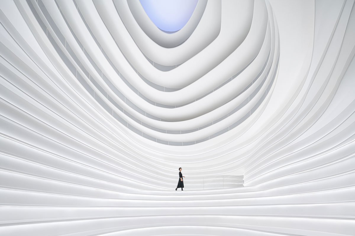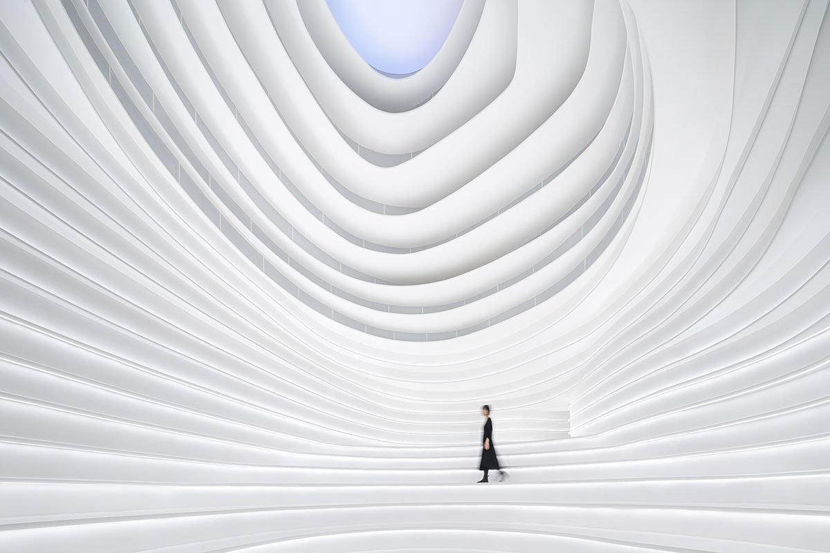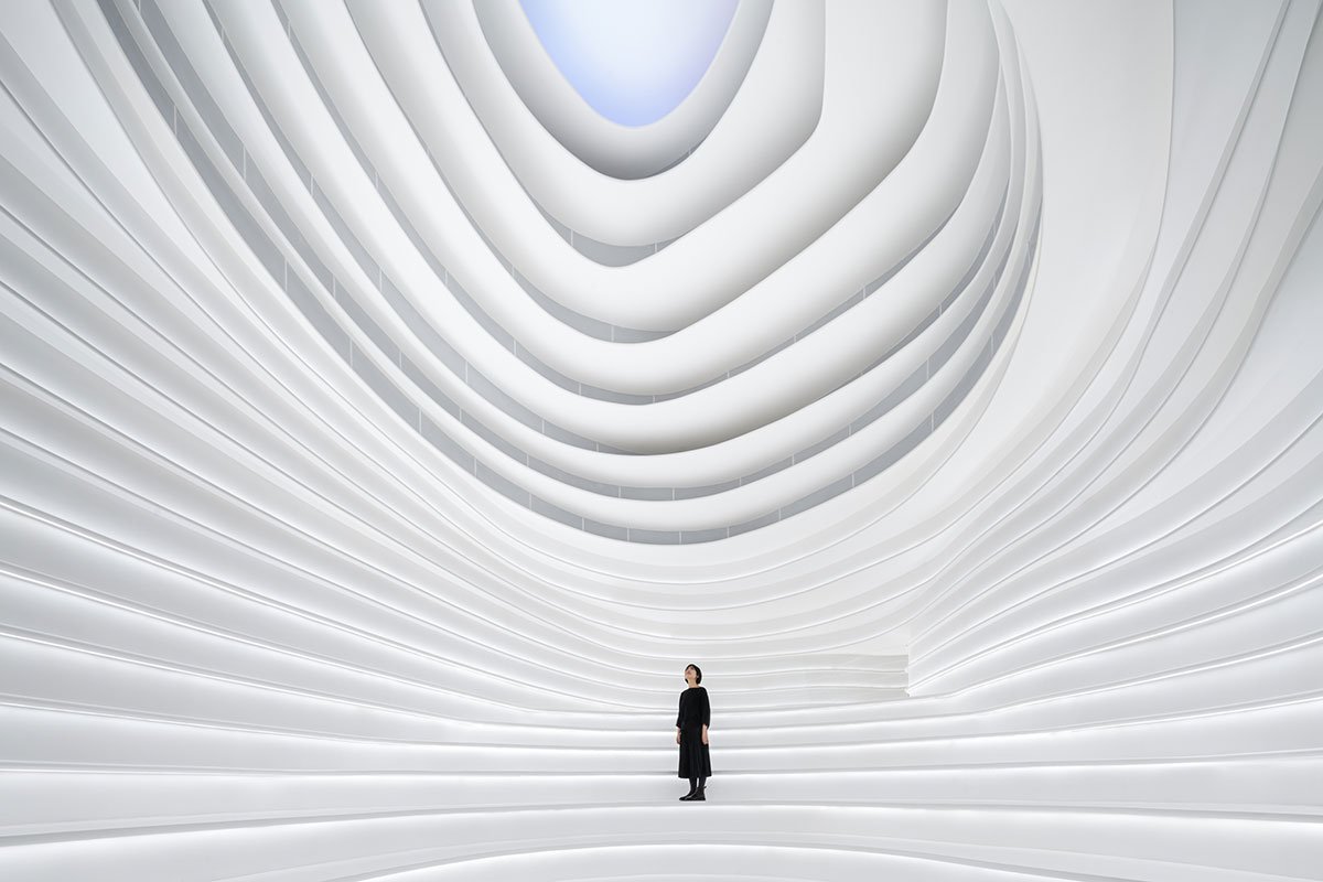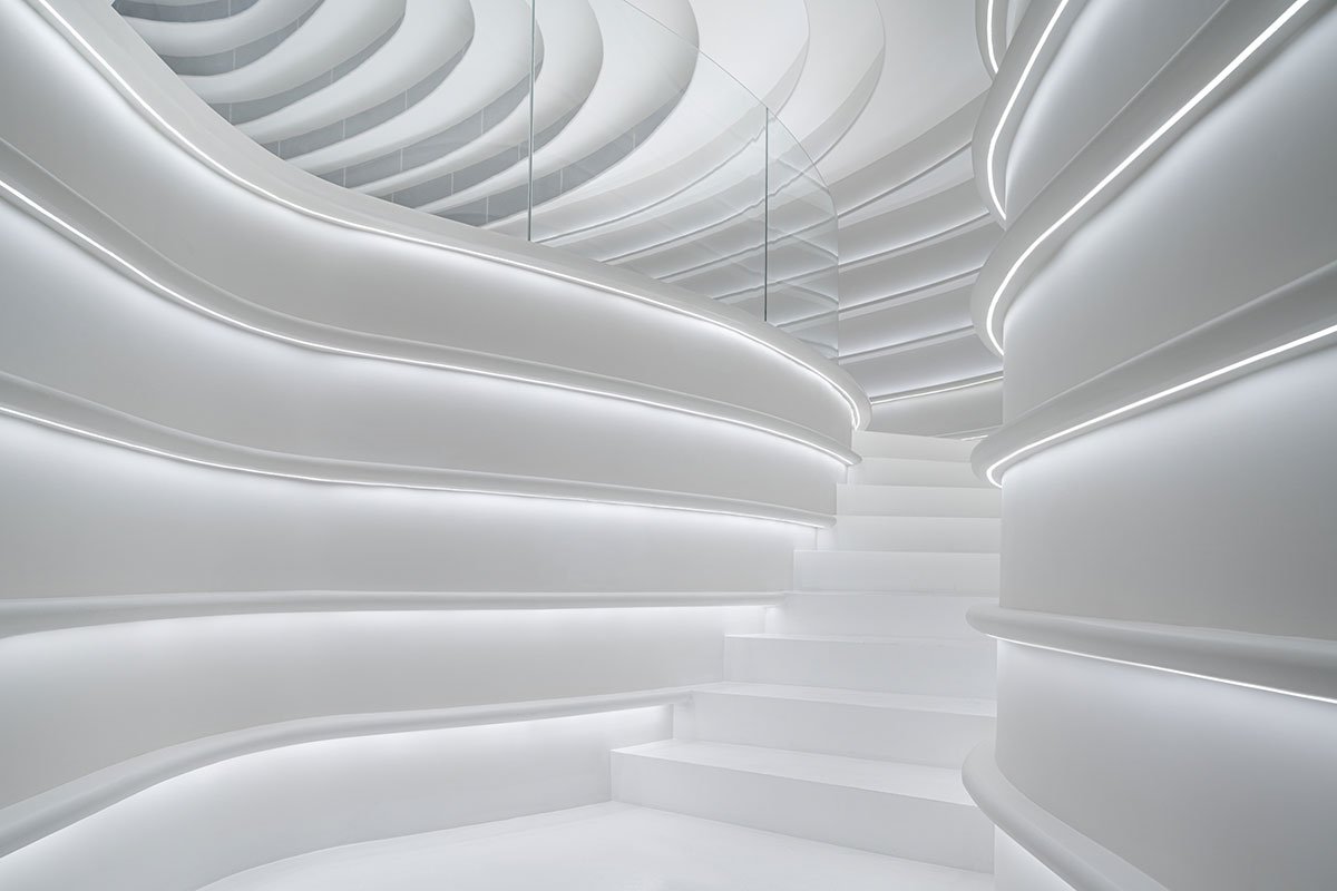 In 2022: Golong Wormhole, there are three interdependent and interconnected gallery spaces. The wormhole, an immersive space tying all galleries together, is the focal point of the exhibition. As the only part of the exhibition space that is not rectilinear, the sinuous elements extend and undulate from the foot of the shell-like installation to the very top, blurring the traditional definitions of what constitutes a room. The space is imbued with motion and speed, possibly submerging some unseemly visitors in an uneasy sensation that challenges the known and unknown about wormholes in our galaxy. The wormhole is interpreted as a sculpture that encompasses the viewer, enhancing their awareness and provoking their senses about light, form, and scale. It invites the viewer to be suspended in a reality in which the viewer takes on the role of an intrusive explorer, actively trying to measure and interpret. During events, the wormhole comfortably seats around 60 people on the steps. On days without events, the wormhole is a space where employees would come to contemplate and unwind.