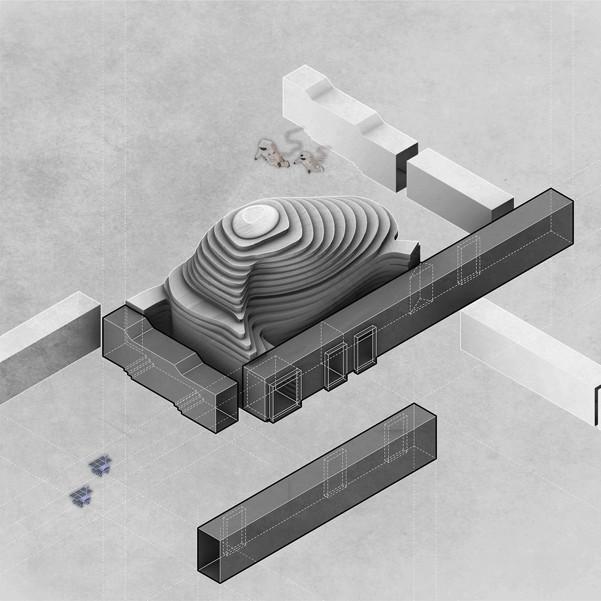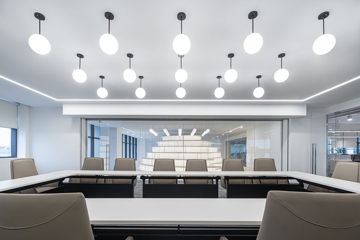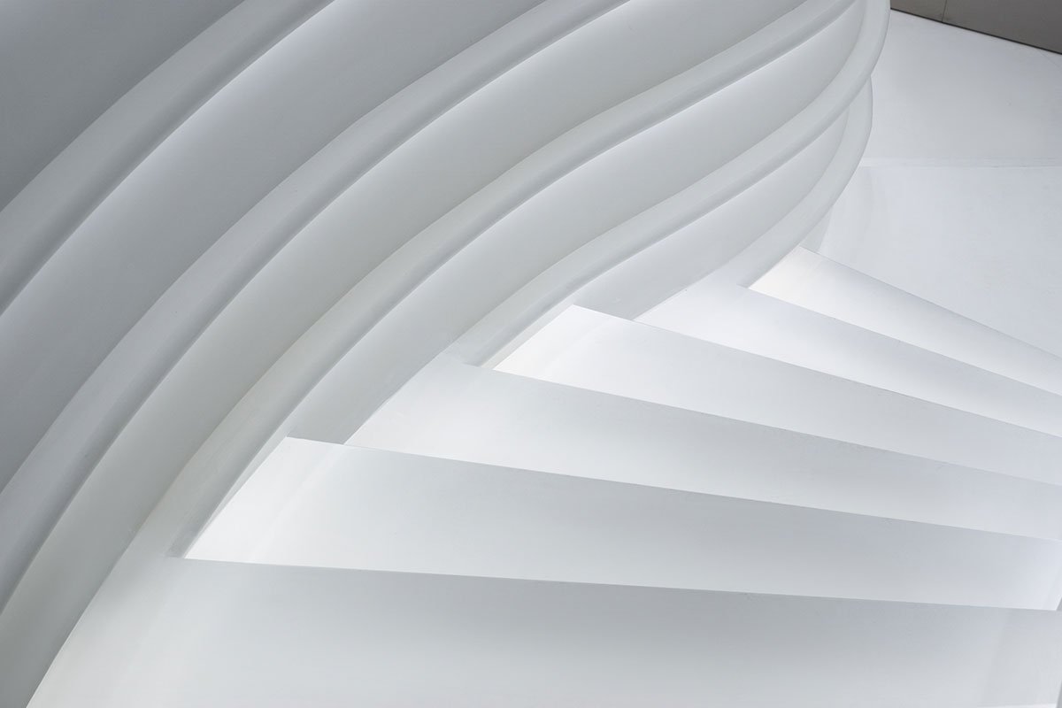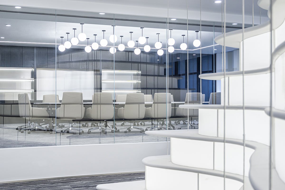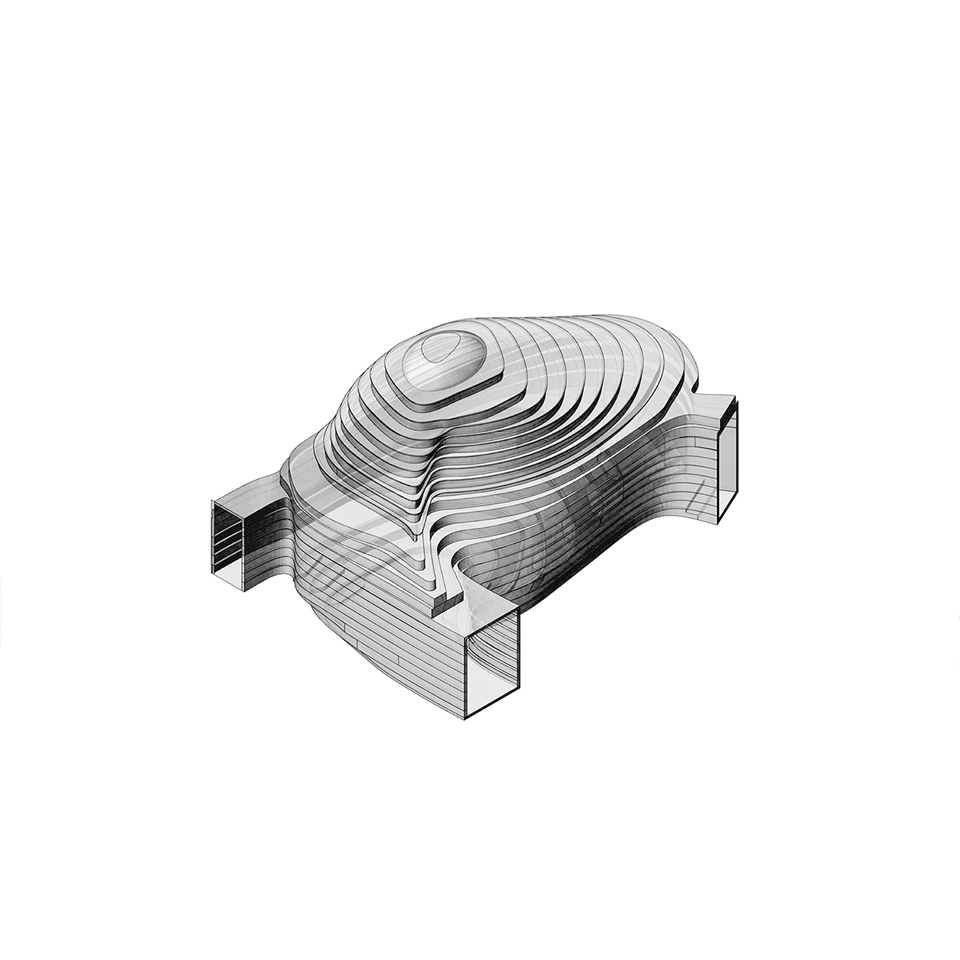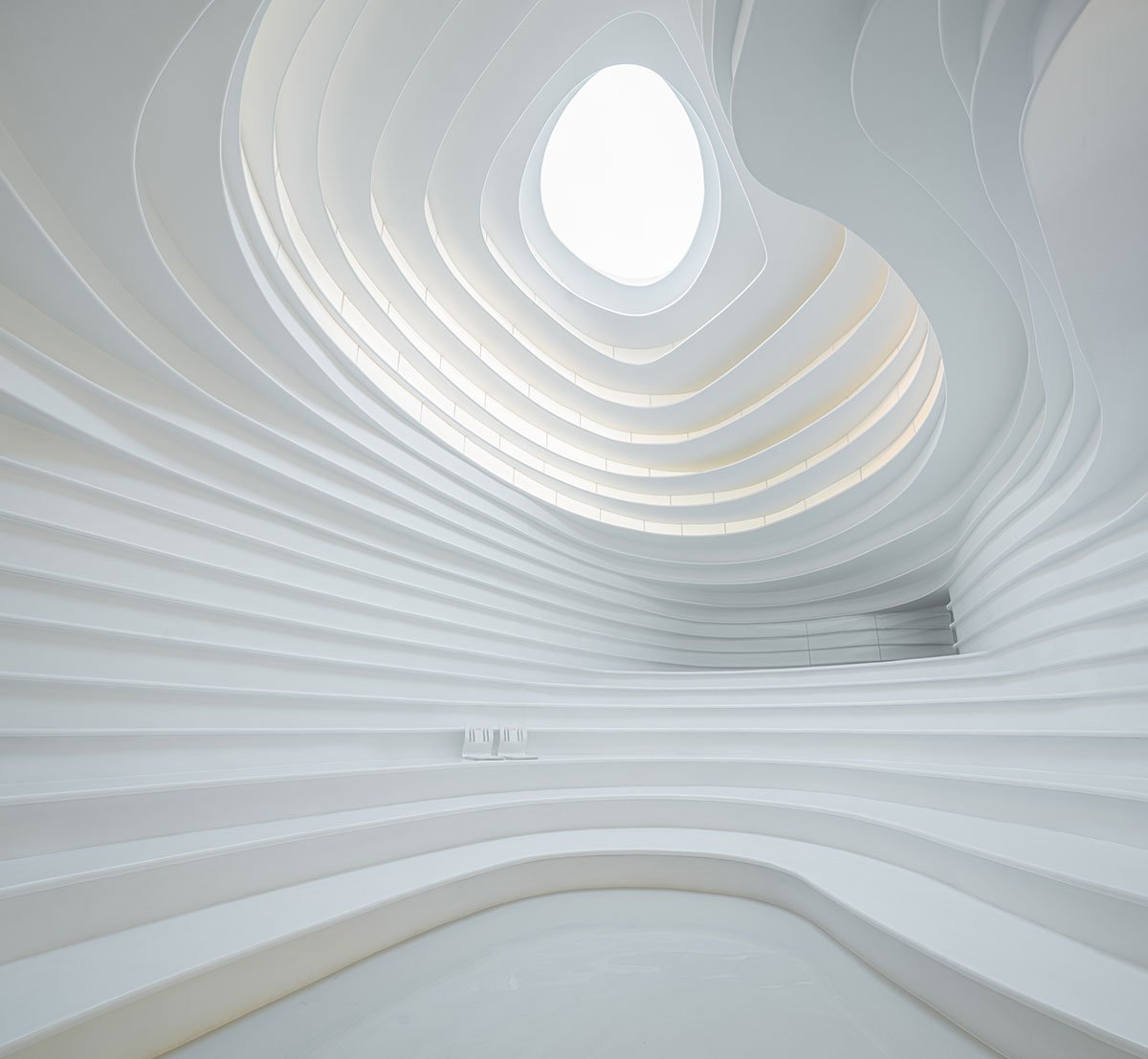 In 2022: Golong Wormhole, there are three interdependent and interconnected gallery spaces. The wormhole, an immersive space tying all galleries together, is the focal point of the exhibition. As the only part of the exhibition space that is not rectilinear, the sinuous elements extend and undulate from the foot of the shell-like installation to the very top, blurring the traditional definitions of what constitutes a room. The space is imbued with motion and speed, possibly submerging some unseemly visitors in an uneasy sensation that challenges the known and unknown about wormholes in our galaxy. The wormhole is interpreted as a sculpture that encompasses the viewer, enhancing their awareness and provoking their senses about light, form, and scale. It invites the viewer to be suspended in a reality in which the viewer takes on the role of an intrusive explorer, actively trying to measure and interpret. During events, the wormhole comfortably seats around 60 people on the steps. On days without events, the wormhole is a space where employees would come to contemplate and unwind.