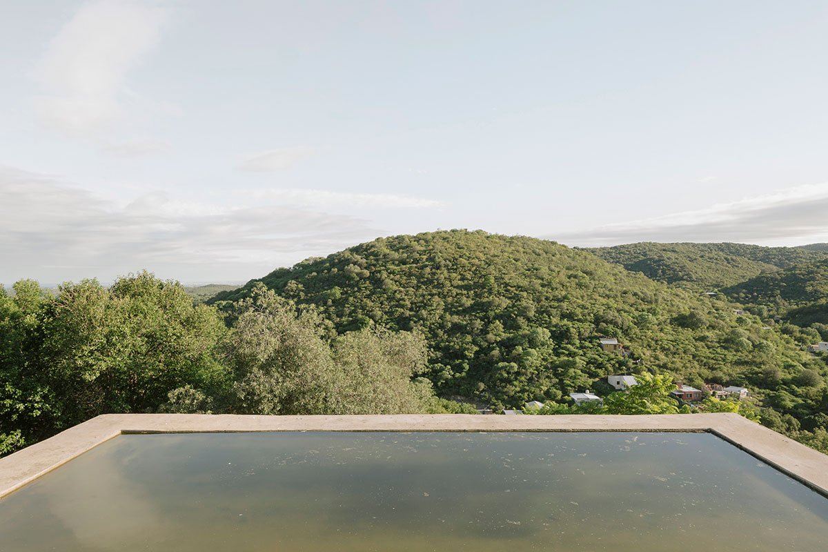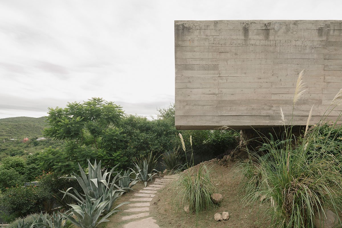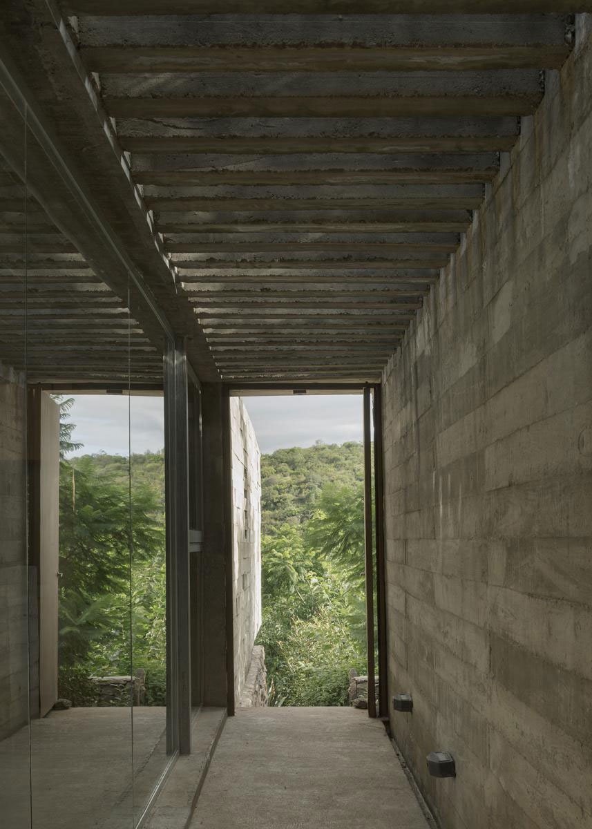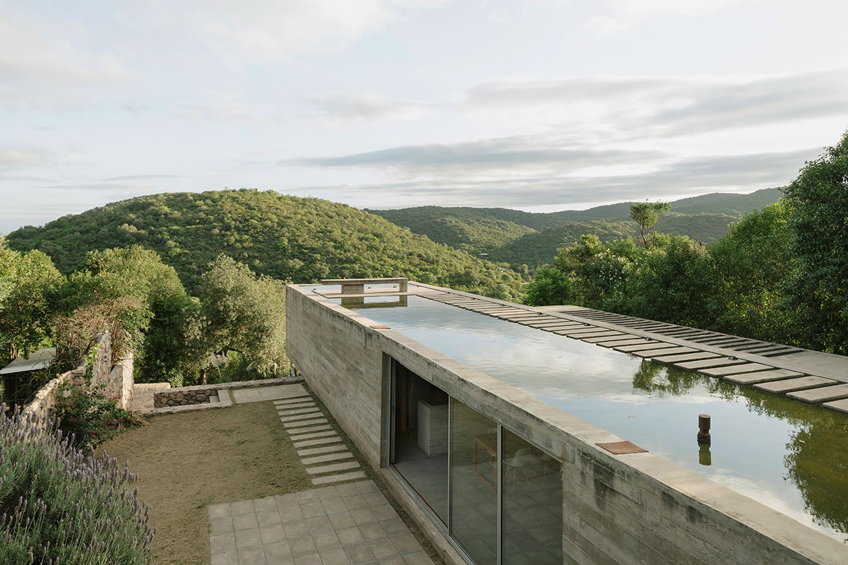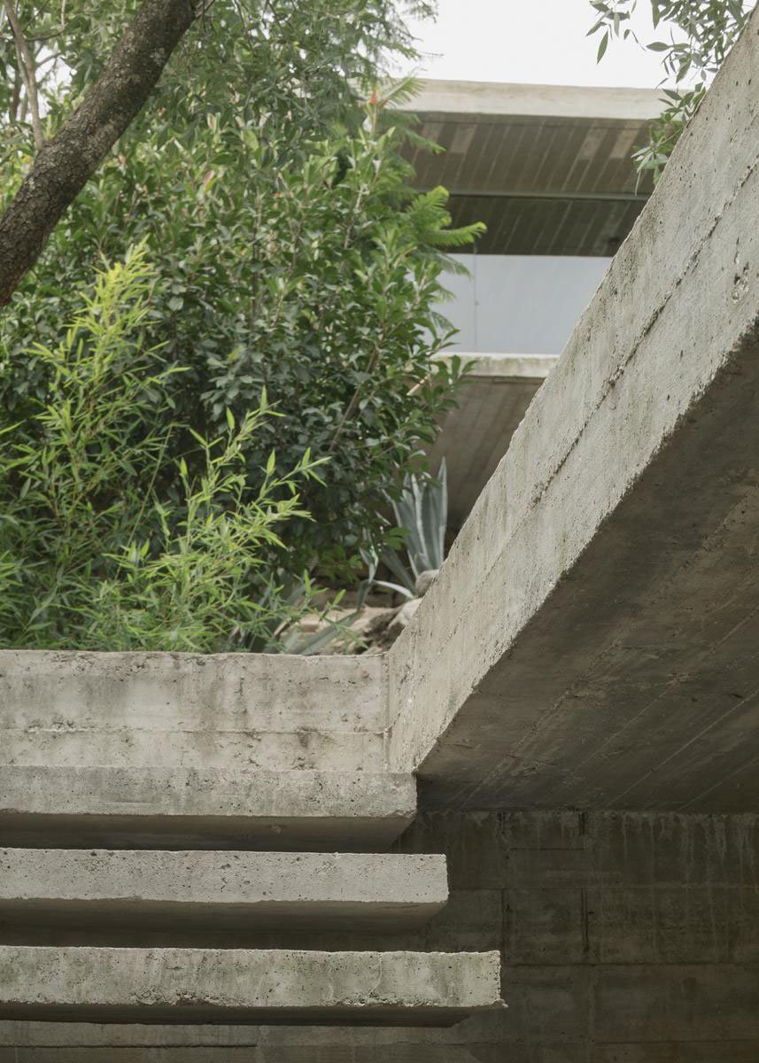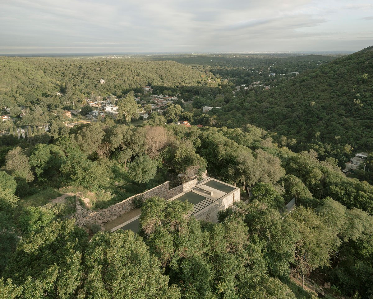 The house has two entrances: the daily entrance is at the lower part of the lot, and the main entrance is at the upper part. The street level is above the roof, which acts as a large square/viewpoint of reception, from where an impressive view of the mountains and the city of Cordoba can be appreciated. This reinforced concrete roof is flooded, resolving the materiality of the plaza, providing thermal and energy balance in the interior at low cost, and contributing to the natural environment.