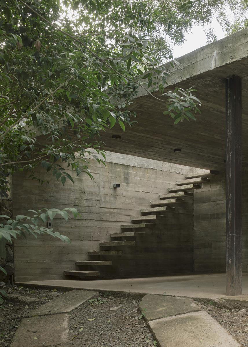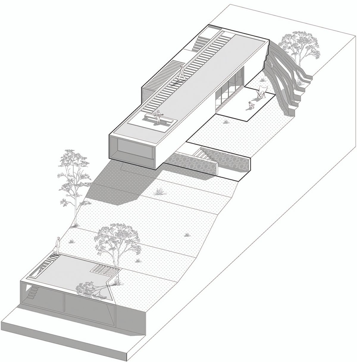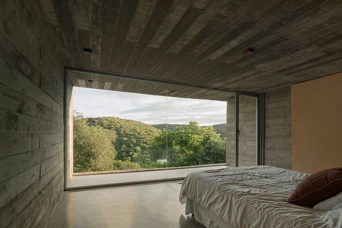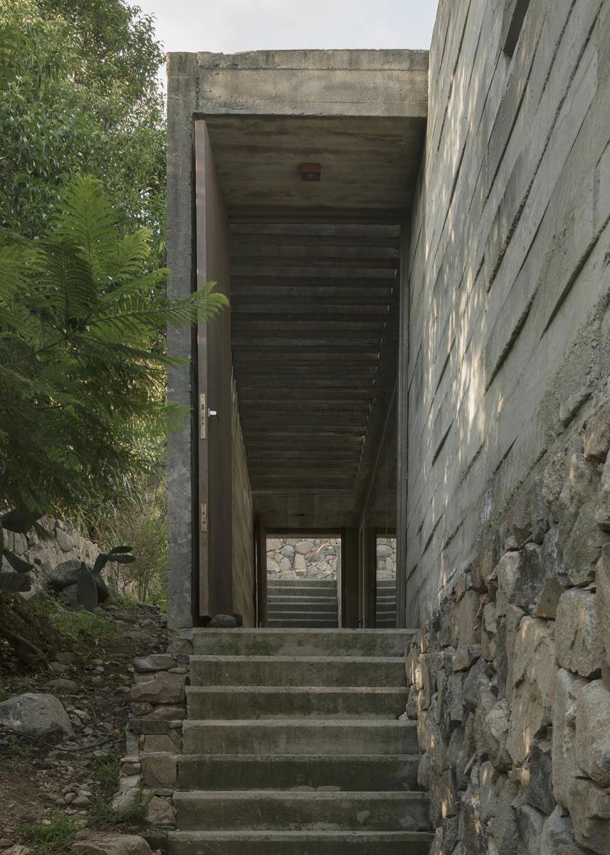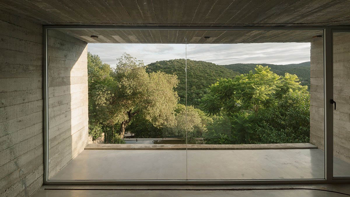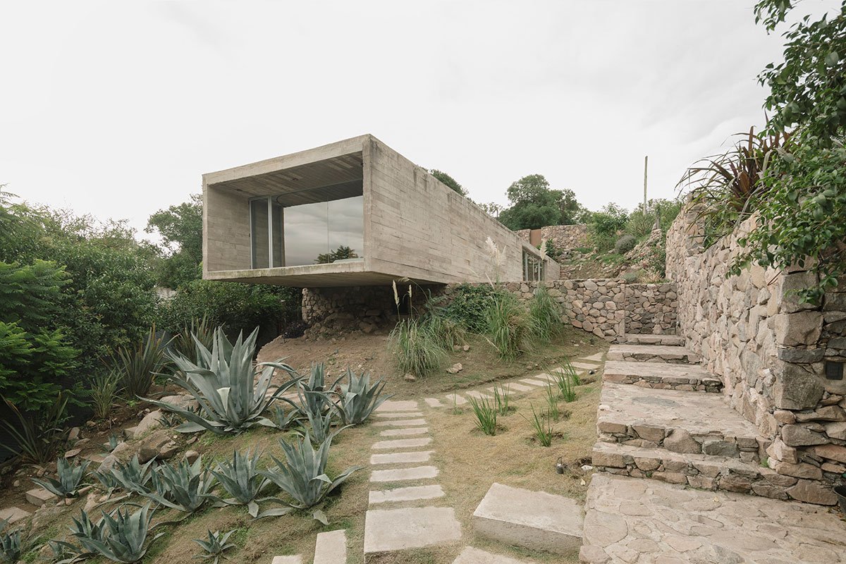 The house has two entrances: the daily entrance is at the lower part of the lot, and the main entrance is at the upper part. The street level is above the roof, which acts as a large square/viewpoint of reception, from where an impressive view of the mountains and the city of Cordoba can be appreciated. This reinforced concrete roof is flooded, resolving the materiality of the plaza, providing thermal and energy balance in the interior at low cost, and contributing to the natural environment.