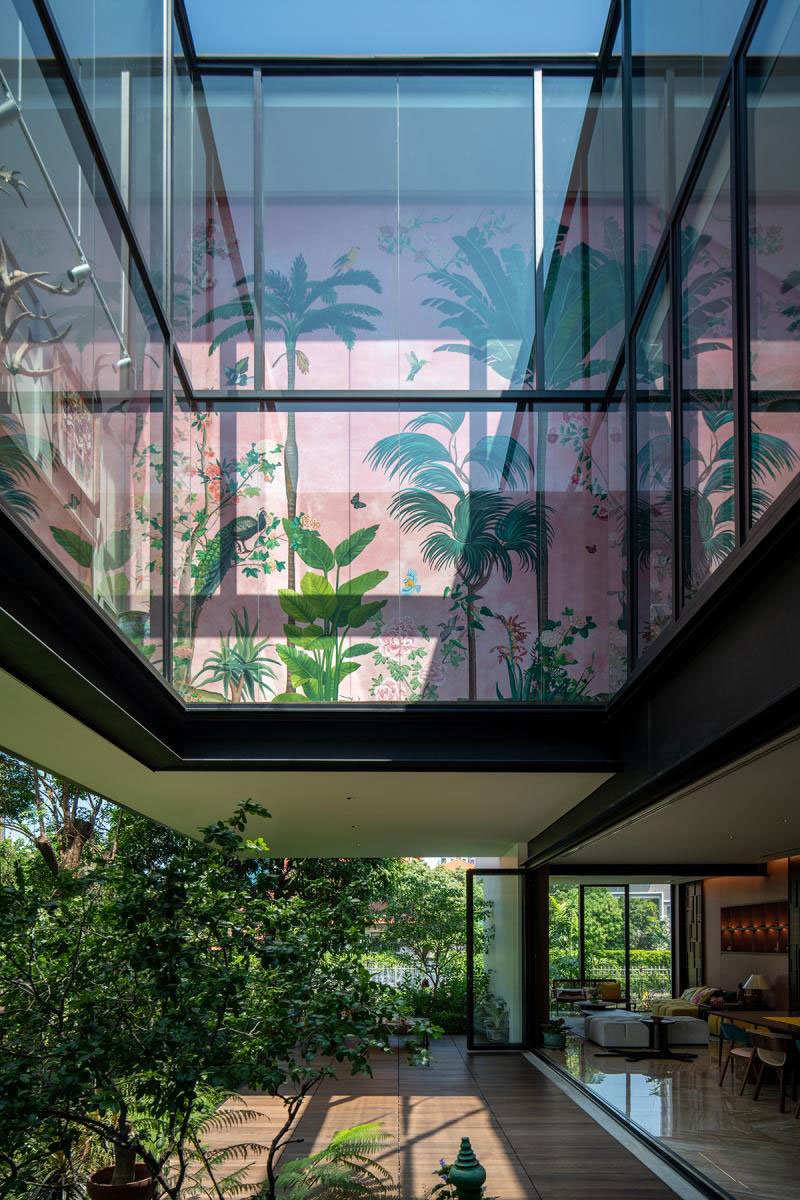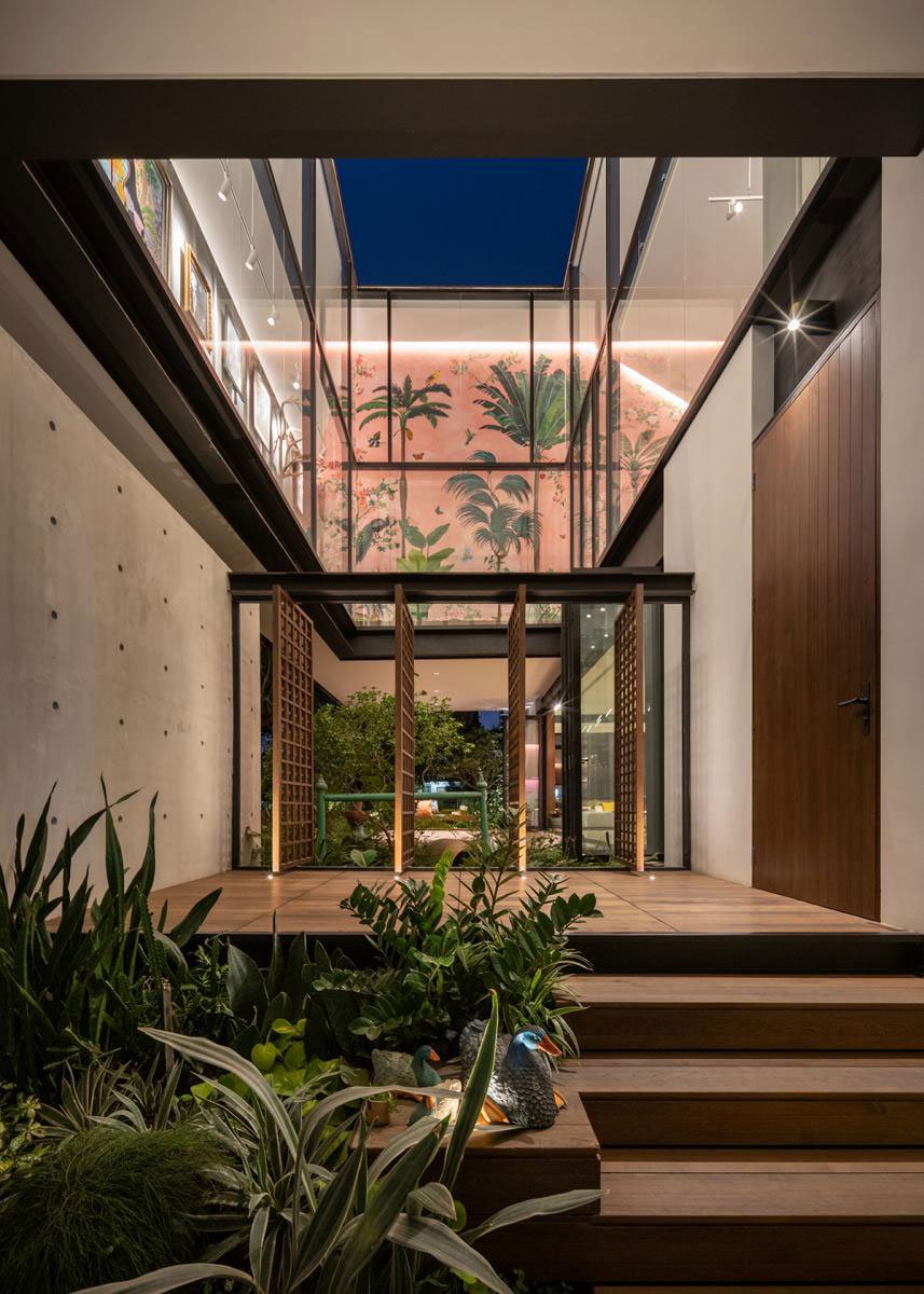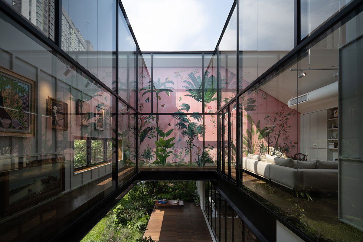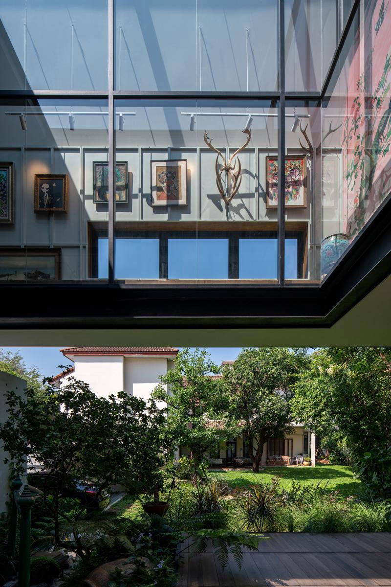 The high ceiling void above the floating gallery and the greenery below can create an outdoor gallery atmosphere and be used as a background to emphasize the white walls for paintings. The natural light can shine on the artworks and harmonize the overall atmosphere in the living and working space.