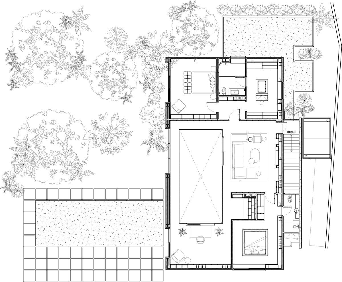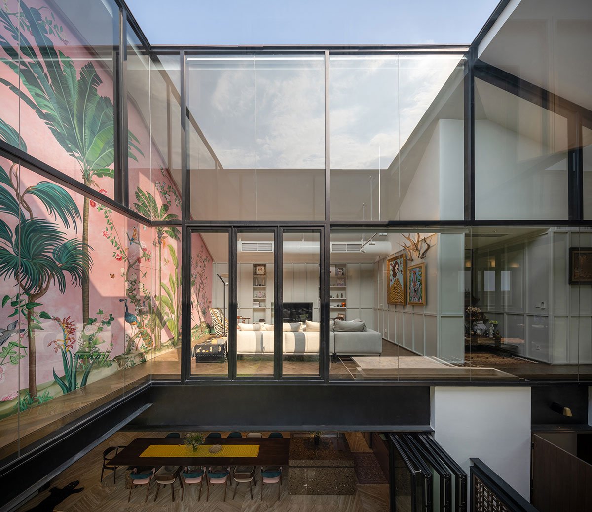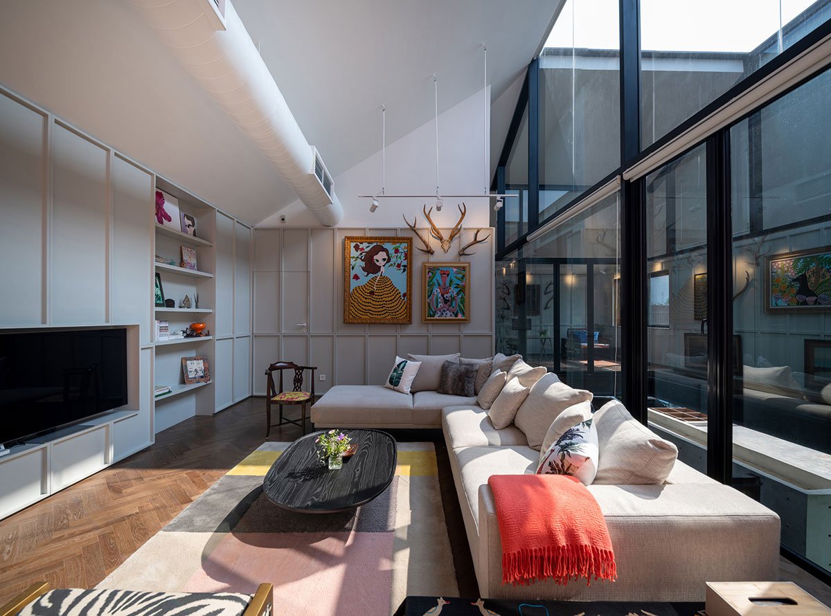 The high ceiling void above the floating gallery and the greenery below can create an outdoor gallery atmosphere and be used as a background to emphasize the white walls for paintings. The natural light can shine on the artworks and harmonize the overall atmosphere in the living and working space.