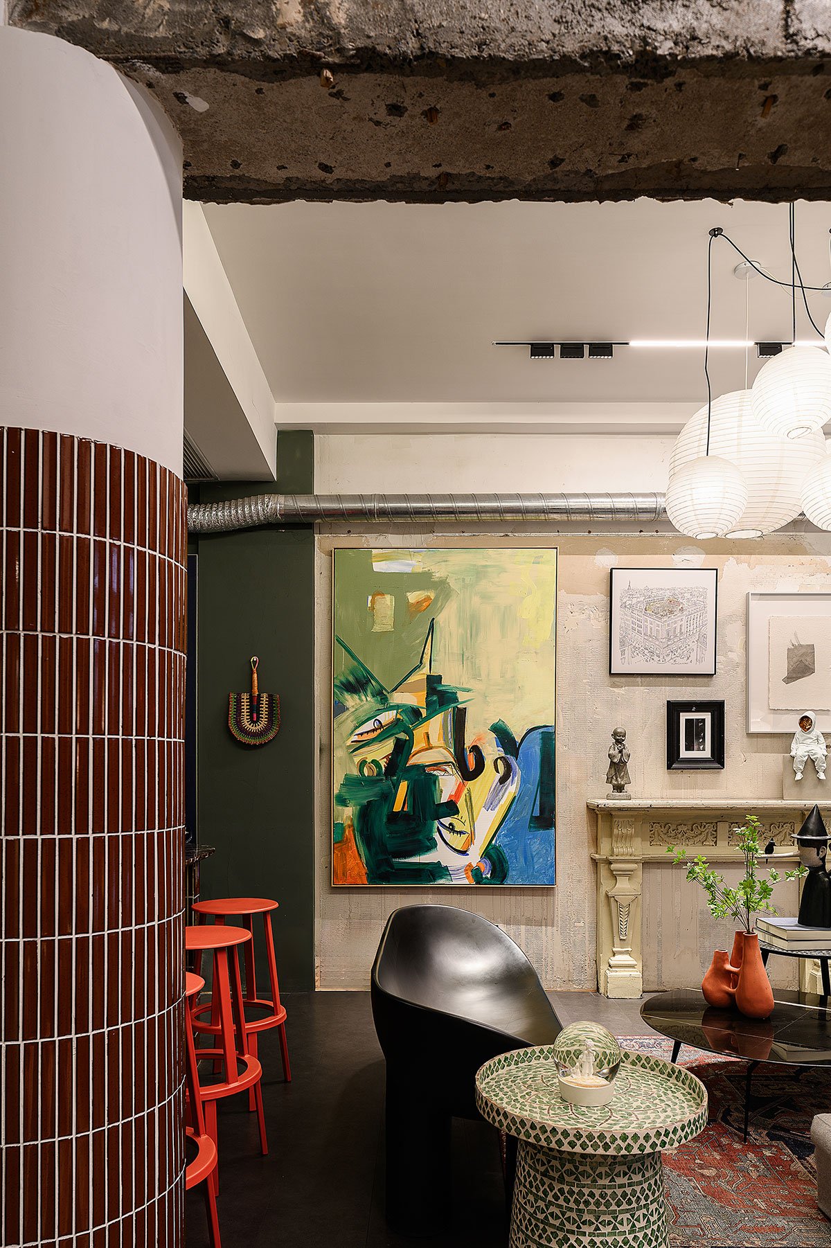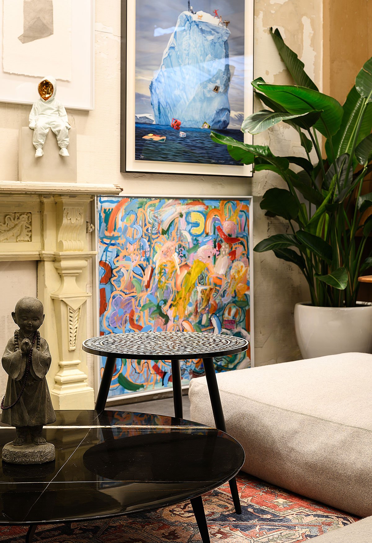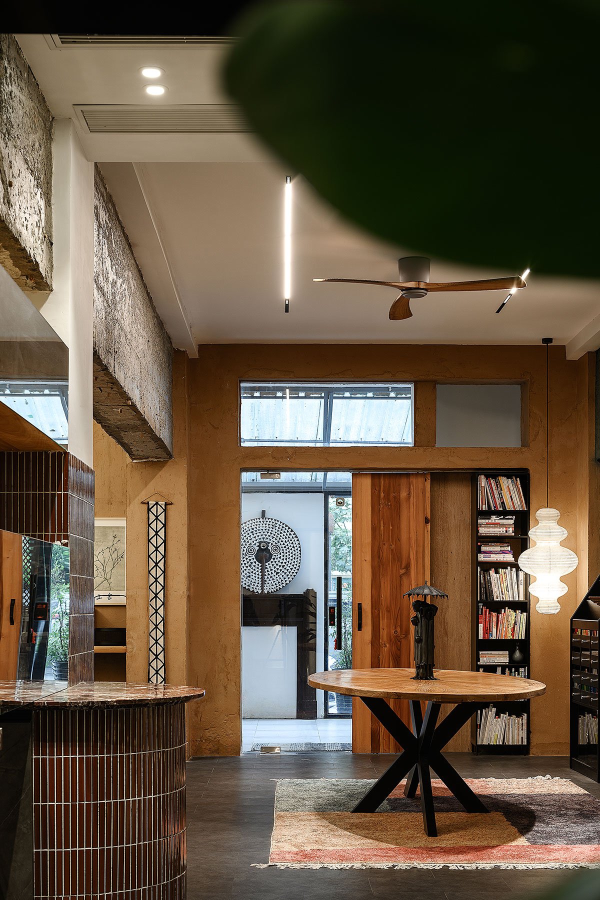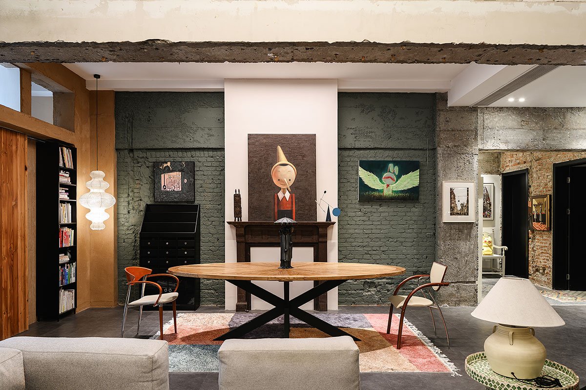Integration /Meta: Soft, yet distinctive rugs are meticulously placed in specific areas; a variety of chairs surround the same table, each telling its own unique story, wooden or plastic bookshelves showcasing inspiration; different shaped lamps create a sense of imagination as the day progresses; the owner has collected various decorative items from around the world, bringing the scenery to the present; green plants bloom with a sense of comfort and warmth at all times. The original Art Deco fireplace in the house also unexpectedly blends in with the paintings and decorative items, creating a harmonious atmosphere.