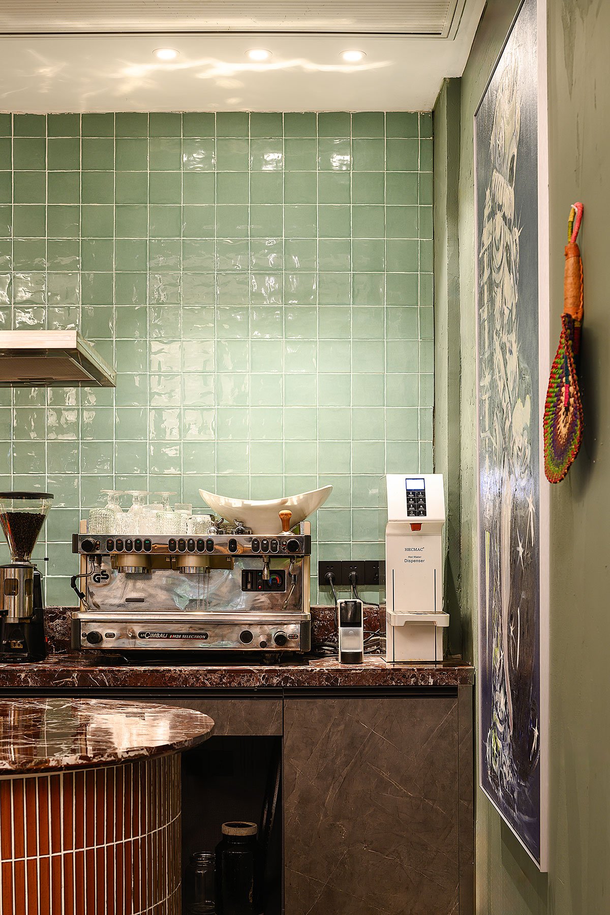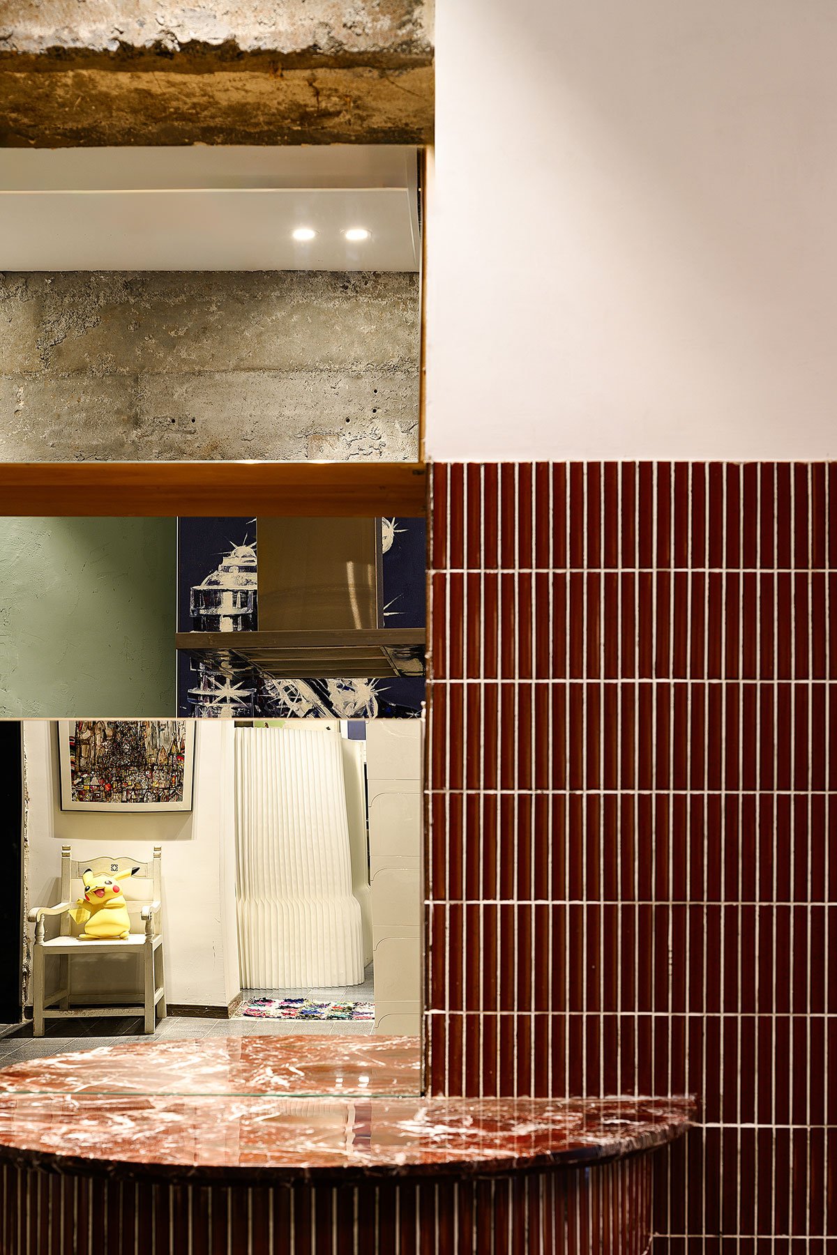The bar is composed of striking red and mirrors, effectively separating the space into different functional attributes. The addition of mirrors integrates and elevates the texture of the space. The water bar, a semi-open functional transition, carries the design concept of “integrating diverse elements” throughout the space.