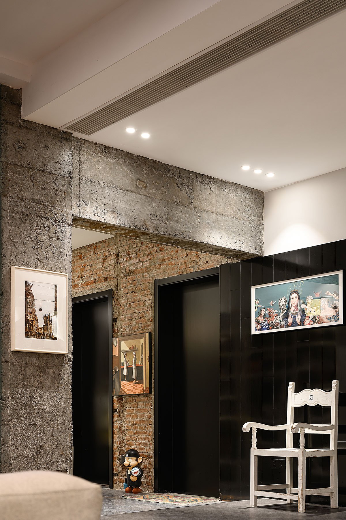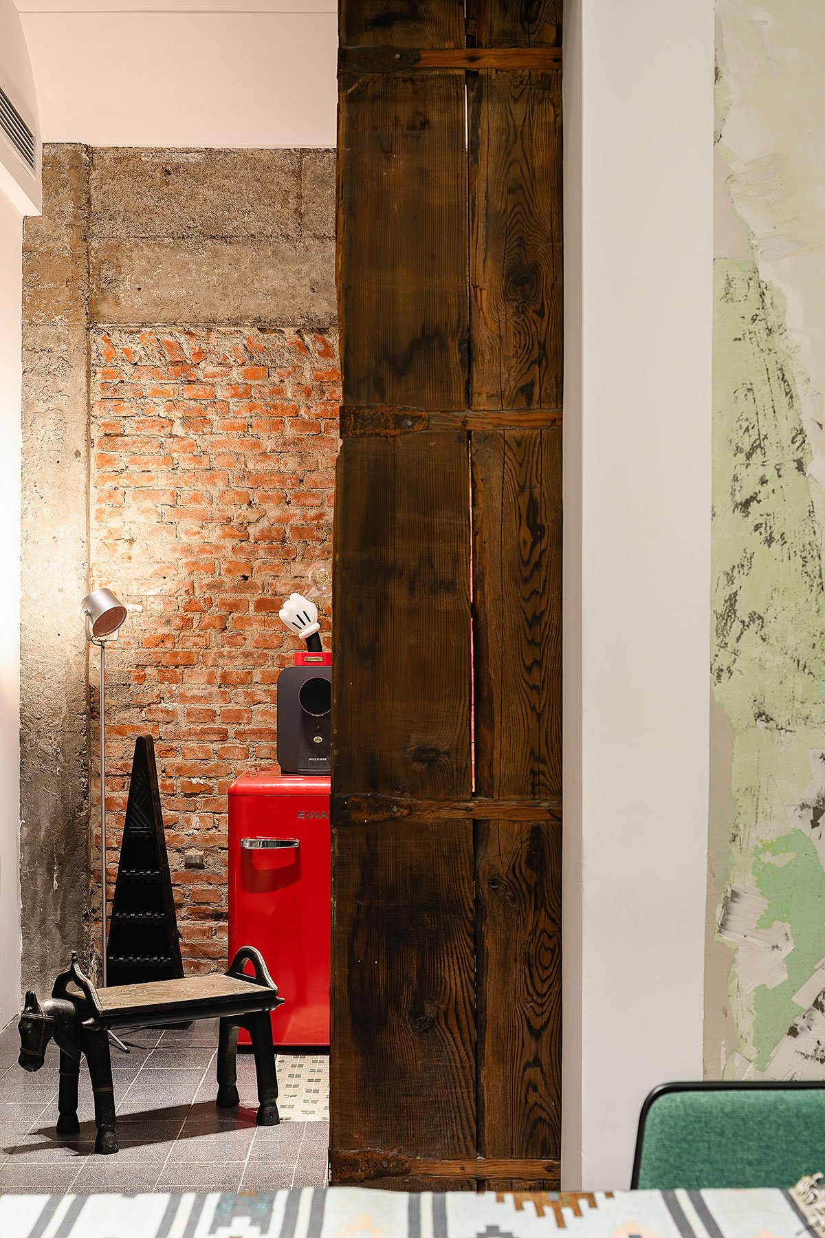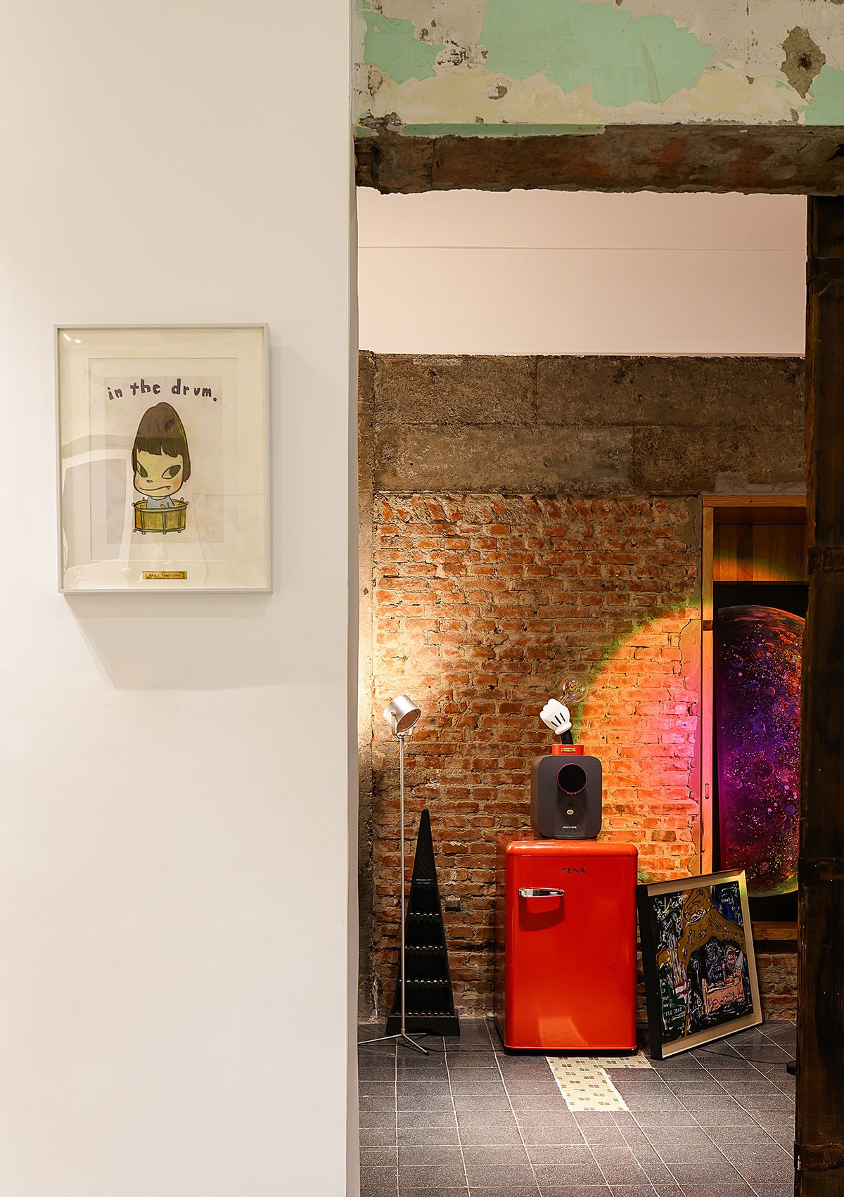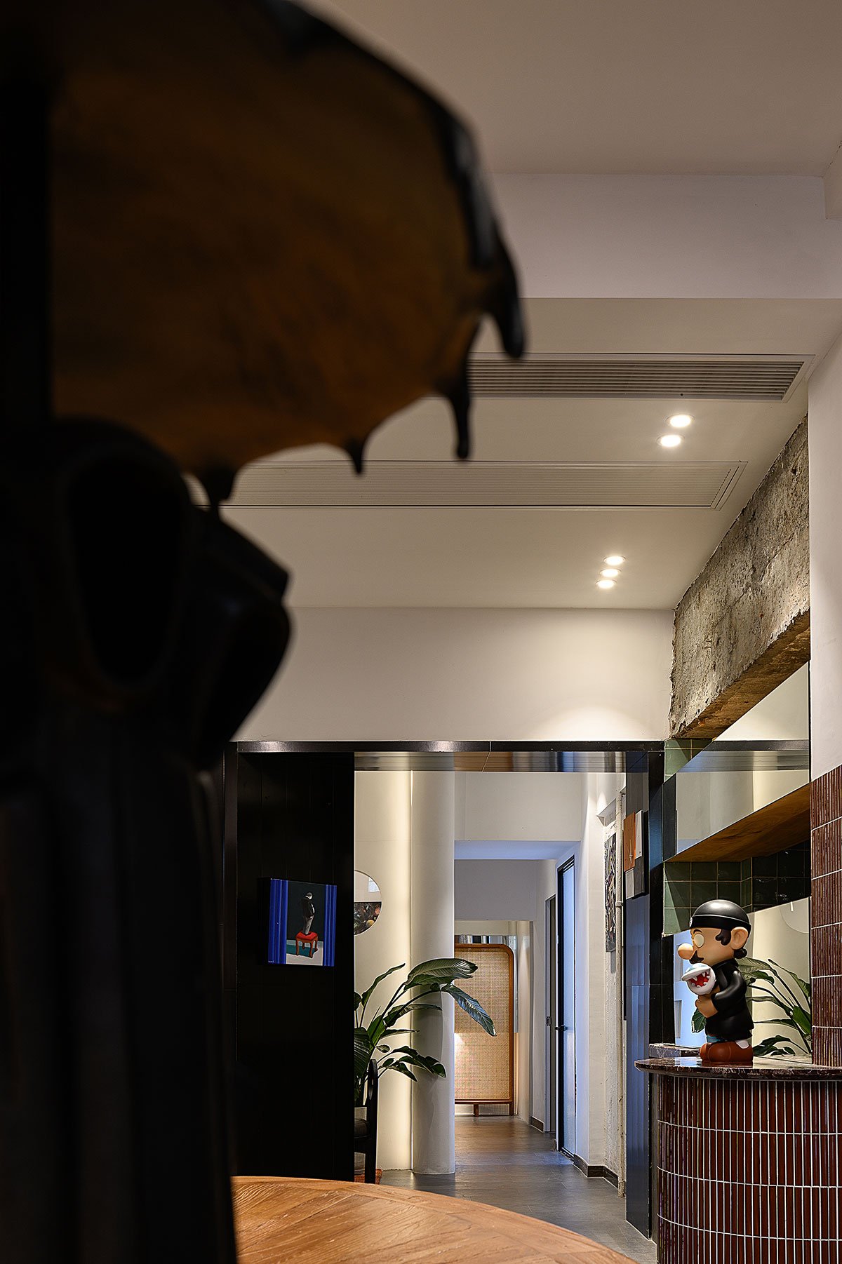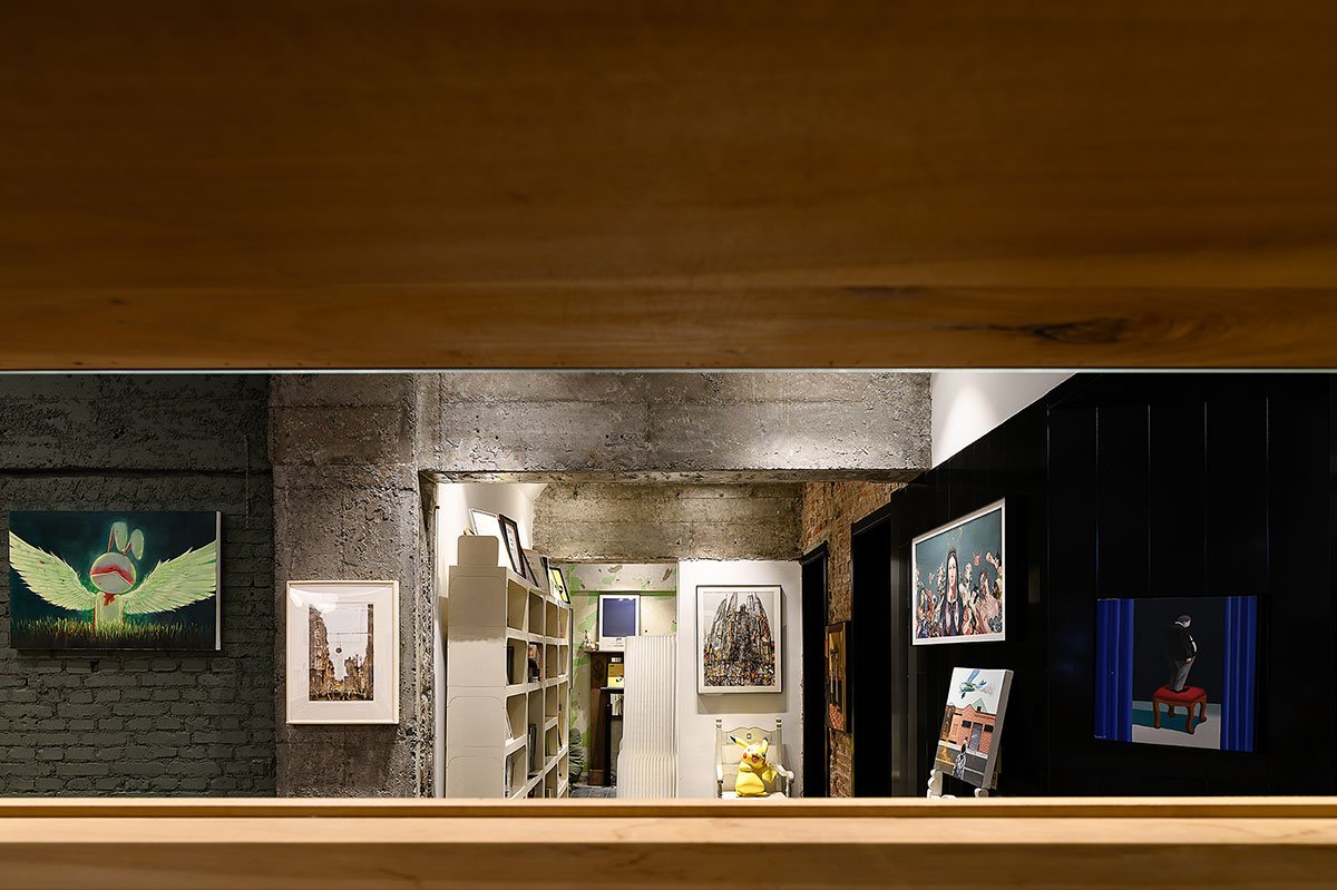 Breaking/Galaxy: Walking along the corridor, you enter the conference room and office area, where the office space is quite different from the front area. The unadorned exterior walls and regularly changing paintings create an understated yet bold atmosphere, which forms the office style of the theater team. As the principal, who is also involved in the design of the theater, the space presents an explorative and boundary-breaking spirit, with boldly exposed walls, the original gray floor tiling, and the weathered beams of the building, all of which showcase the courage to break through time and present different practical possibilities.