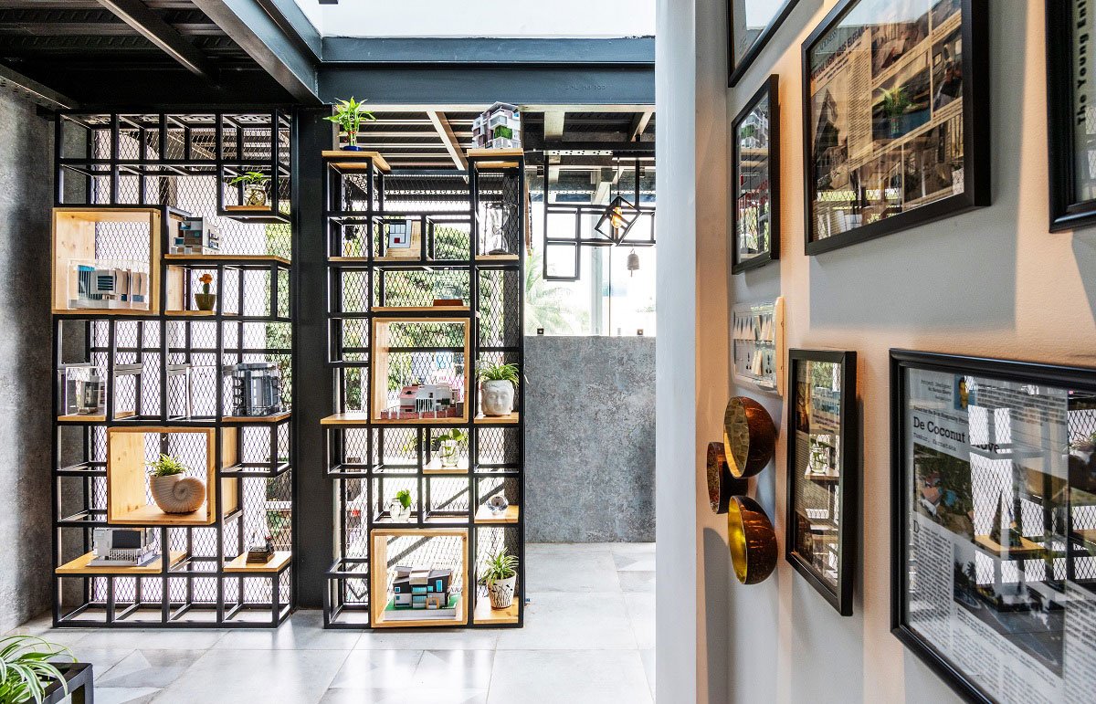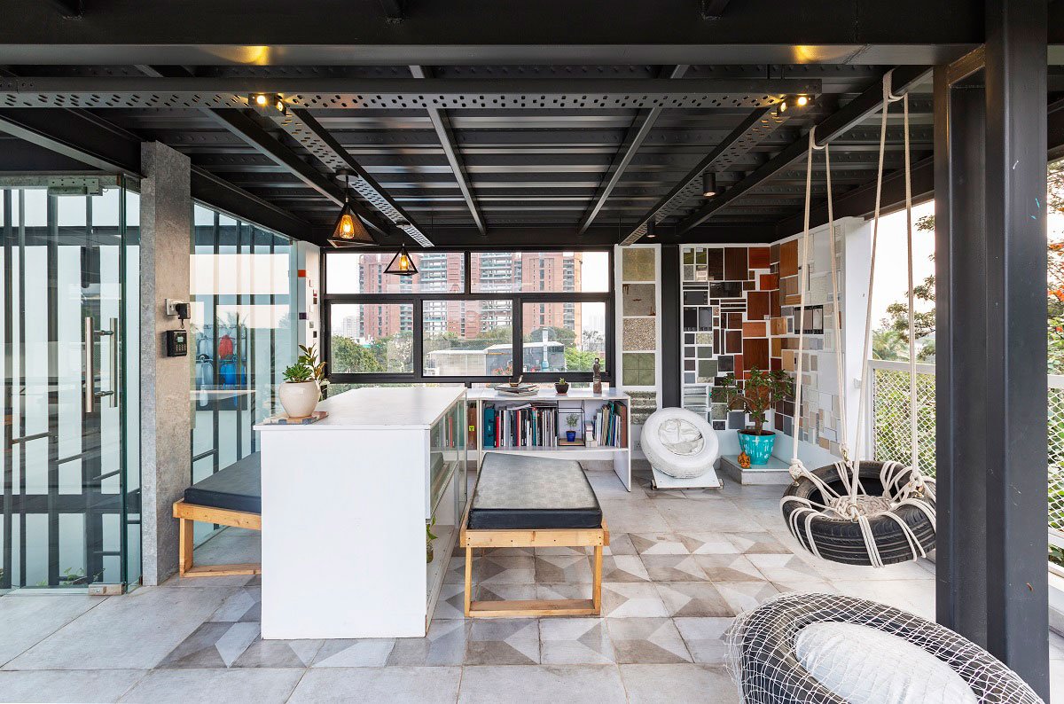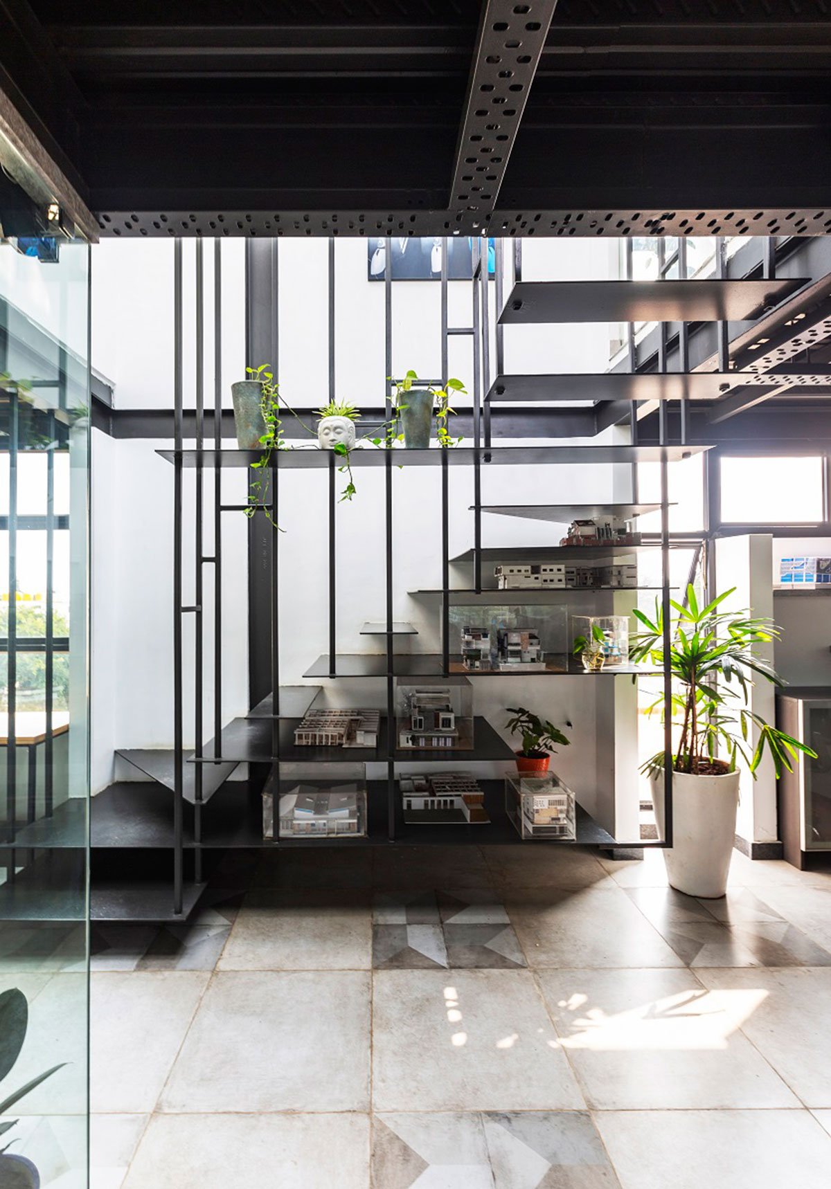 One of the highlights is the suspended stairway between the office space and terrace area. Besides being an architectural feature, it also doubles up as a display space, thus making the space neat and airy.