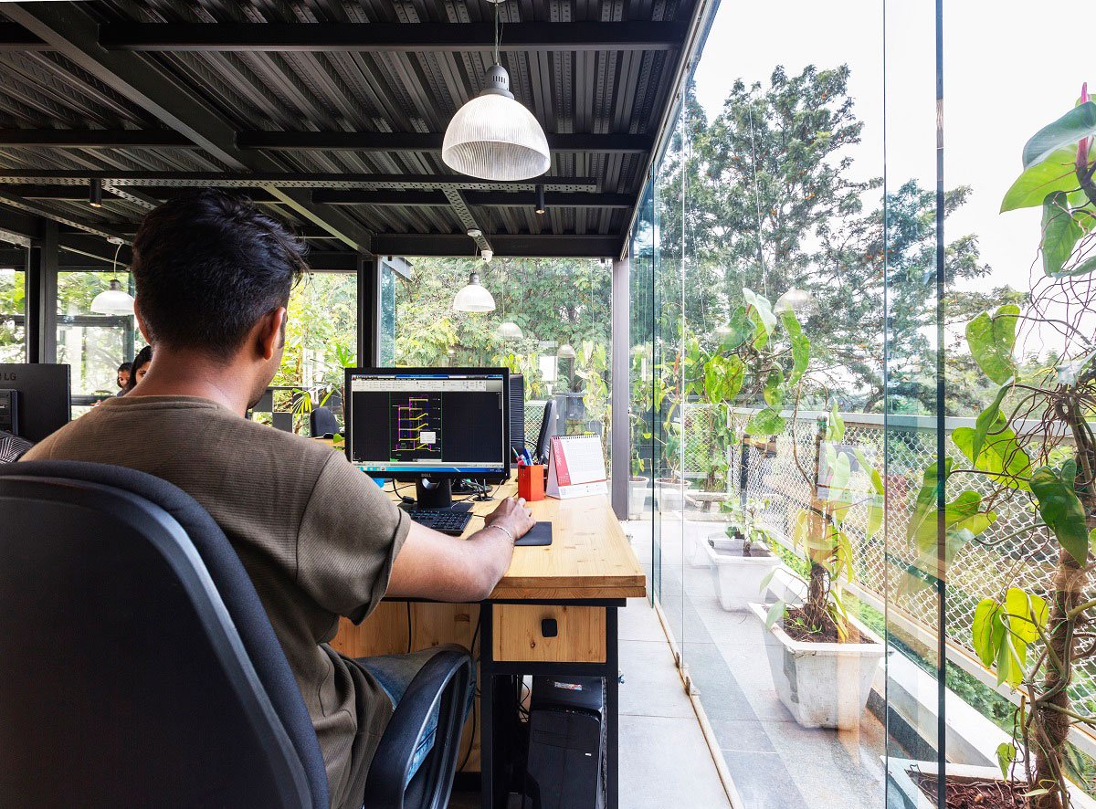 The interior design for the office space is clean and simple to ensure clutter-free workspace. It also helps in seamless connectivity between the interior and exterior green space. The park facing, agile and collaborative workspace has large openings that allow natural light to pour in, green elements around the office, the bright white walls and exposed ceiling creates an informal and stress-free work environment that encourages easy communication, organic interaction, and engagement among employees.