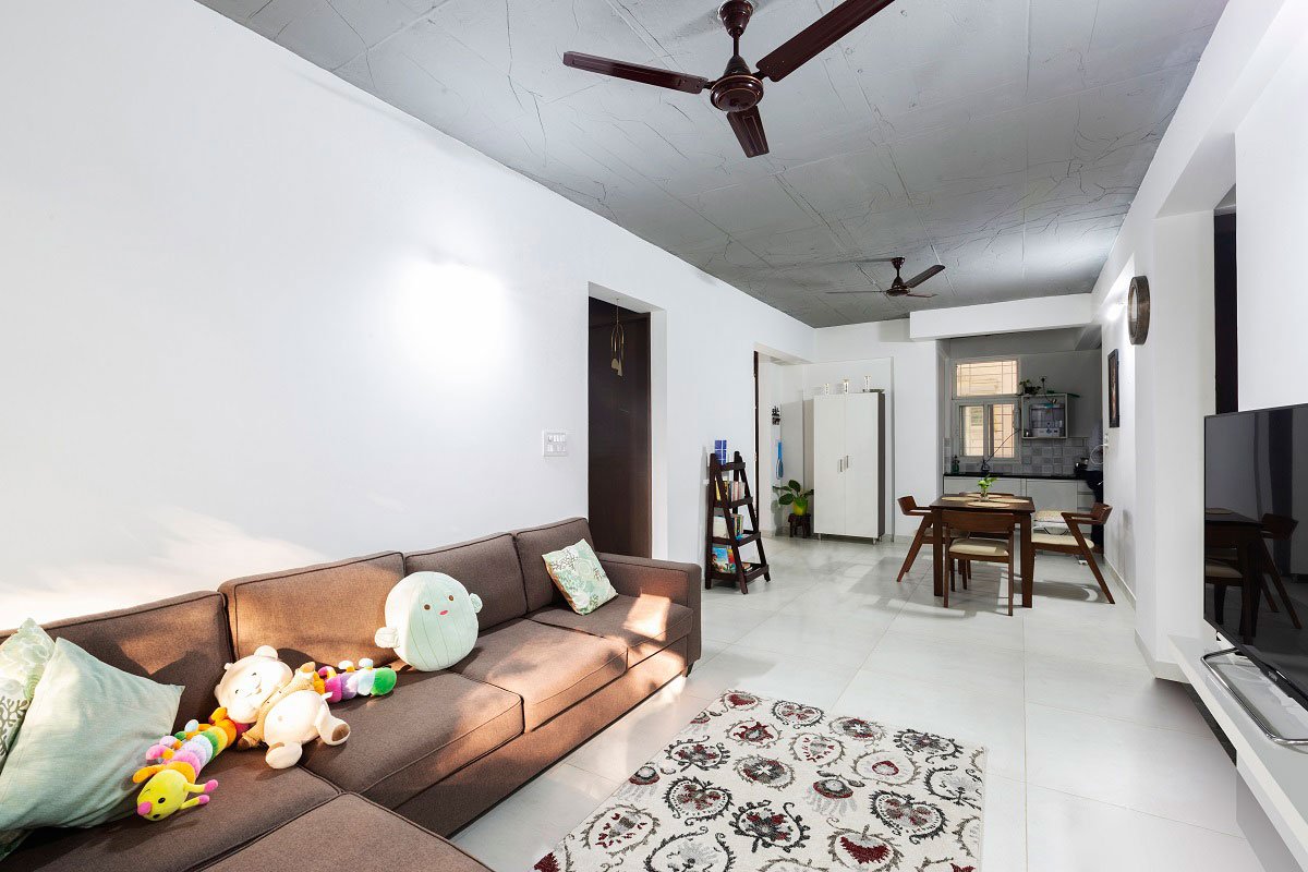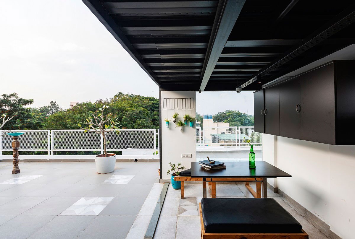 The interior spaces have been designed keeping functionality in mind. Usage of large openings that offer direct access to the exterior green surroundings ensures beautiful blend of the indoor and outdoor spaces.