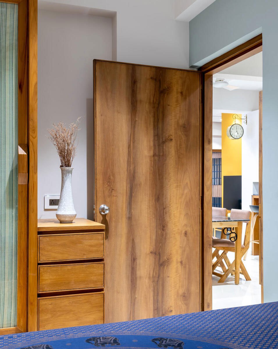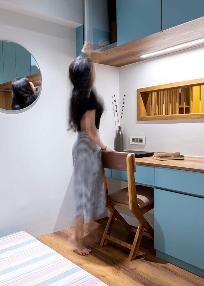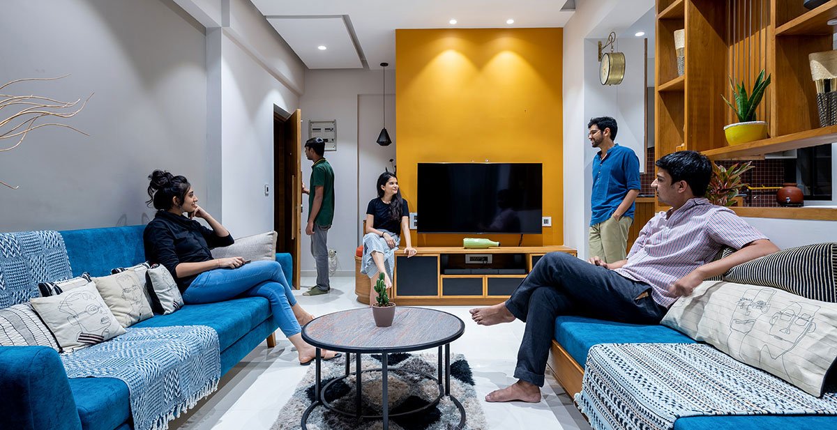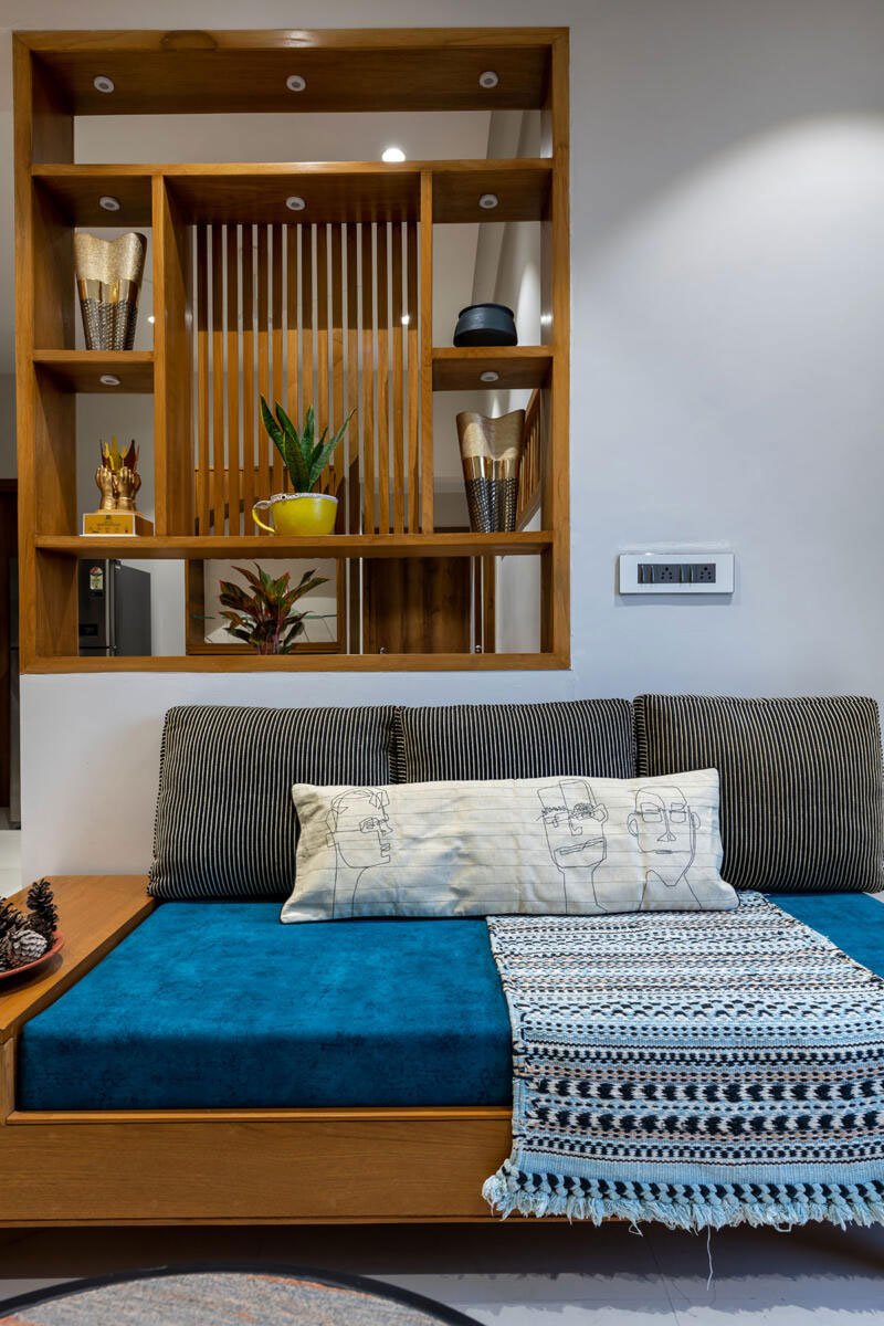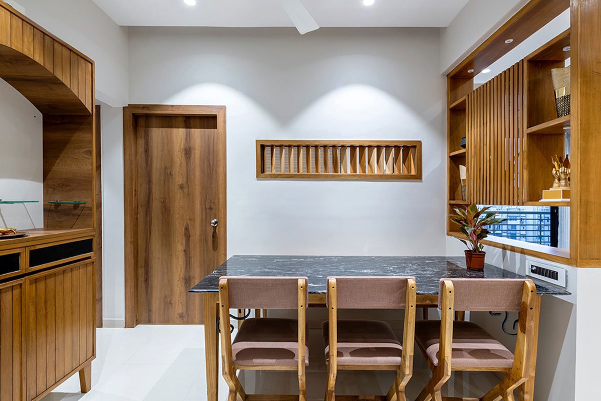 [Text as submitted by architect] A warm and cozy residence designed for a young couple in the outskirts of the city, this project was all about negotiating with the limited budget and resources to create a happy space for the couple. The common spaces in the apartment are designed to keep them more open and visually connected so that the space doesn’t seem cluttered. The living room and the dining are separated by a porous wooden partition which doubles up as a bookshelf or to keep decorative pieces. The kitchen is open to the dining, separated from the dining only by a heighted breakfast counter. The kid’s room has a connection to the dining and kitchen through a long louvered window, which allows for interaction between spaces within the house.