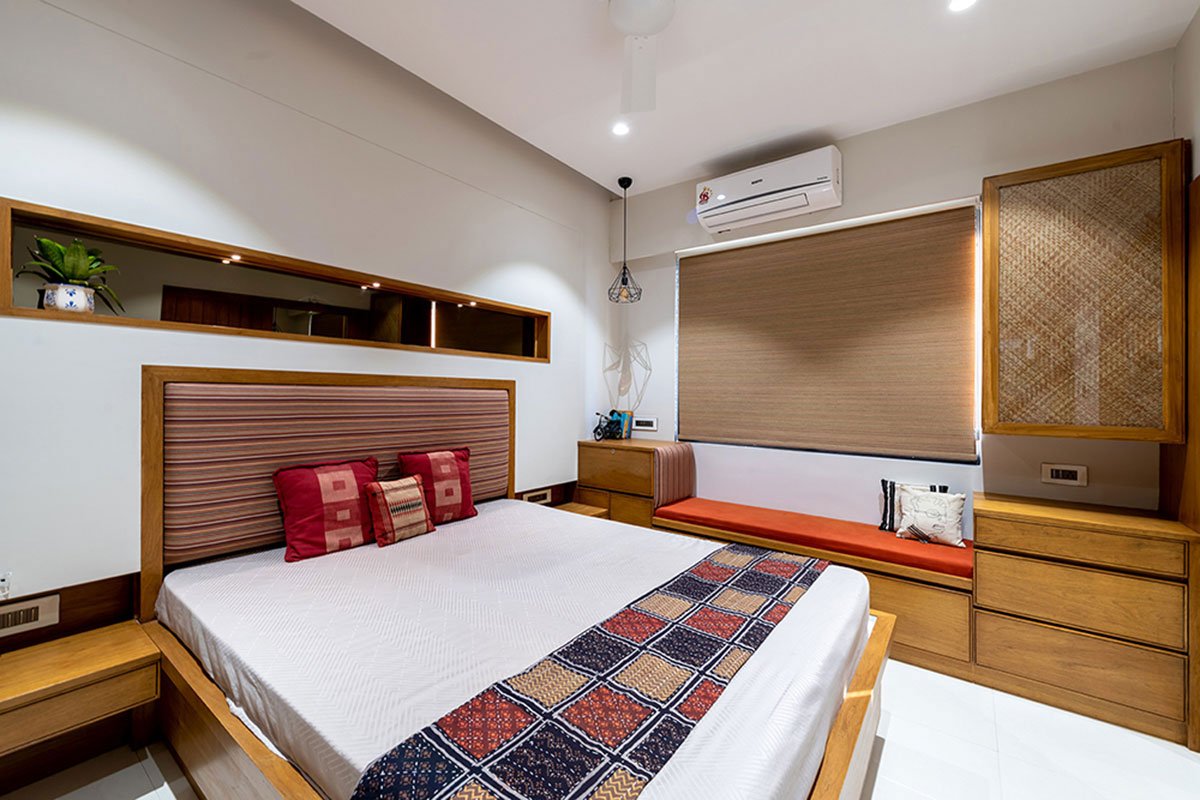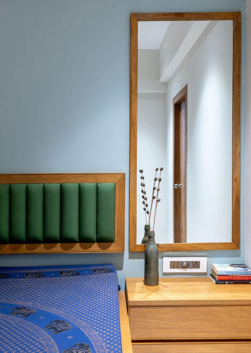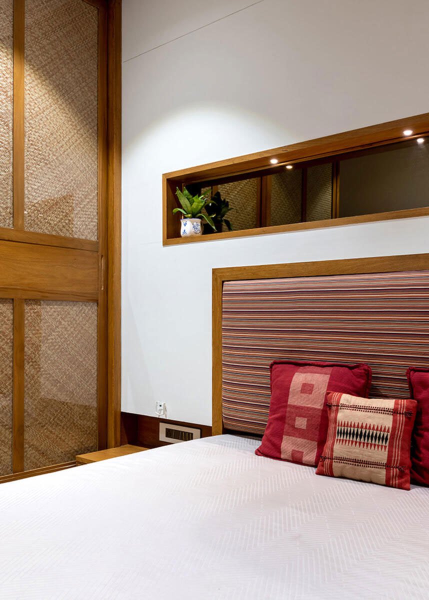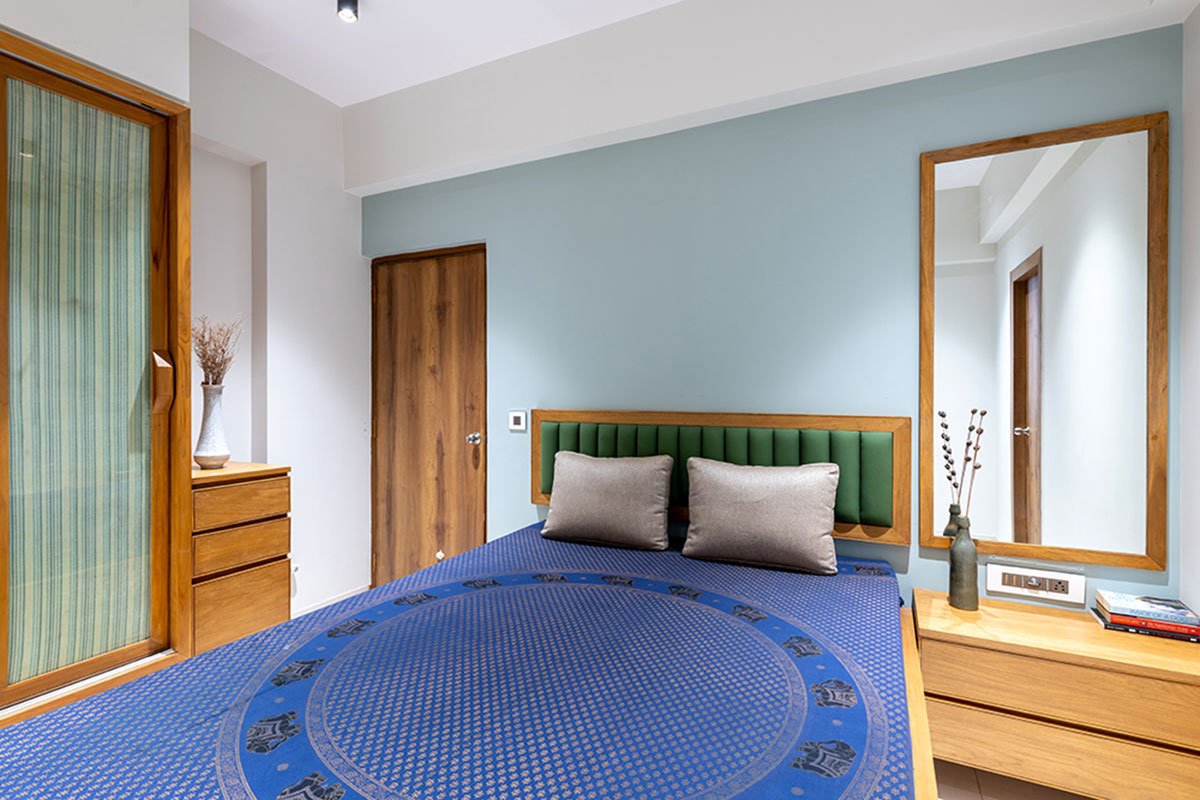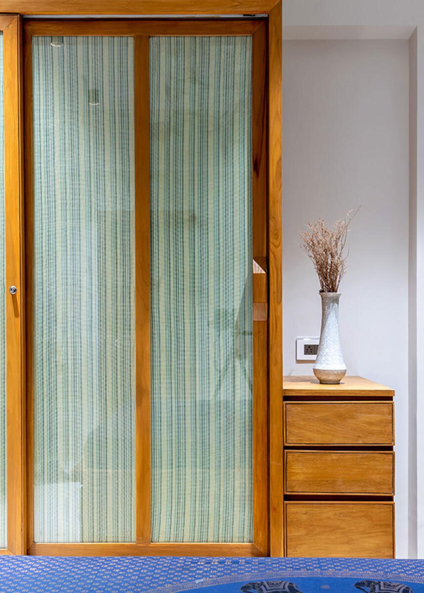 The kid’s room is multipurpose in nature and can act as a space for a small gathering or game night. The master bedroom touches on more earthy tones with cane woven sliding wardrobe shutters and a window seat. The parent’s room is characterised by cooler tones of blues and greens on the walls and tapestries. The overall idea of the design was to keep all spaces connected and liven them up. Every space is conceptualised individually and woven together by specific design elements that facilitate the interplay.