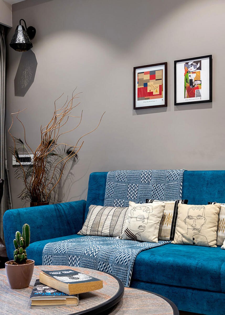 Subtle whites and greys on the walls have been contrasted with bright colours in the tapestries and fabrics to imbibe a youthful and fresh energy into the spaces.