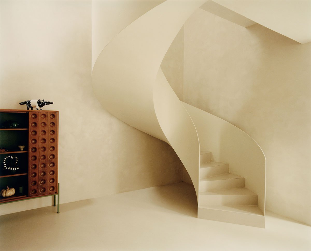 The dynamic curves elegantly connect the upper and lower spaces. Following the spiral staircase from the public area to the resting space, the well-organised hallway creates a sense of ritual and privacy, ensuring a peaceful night’s sleep. From the master bedroom, one can appreciate the scenery directly, with sunlight gently filtering through the trees and casting shadows to gently wake them up in the morning.