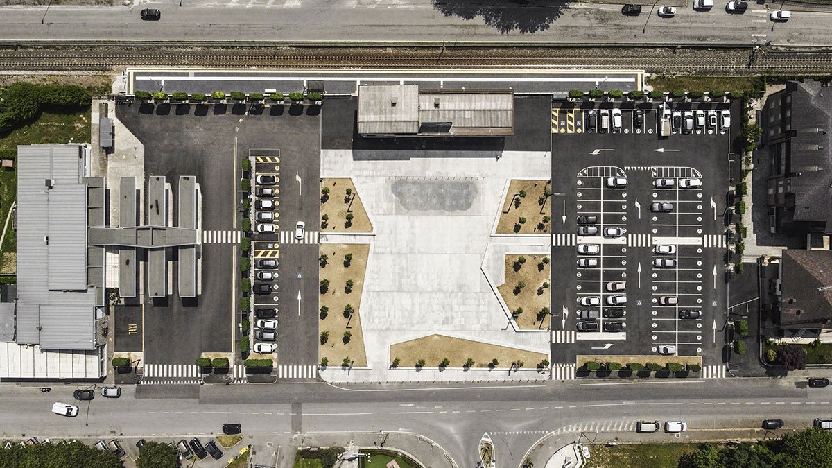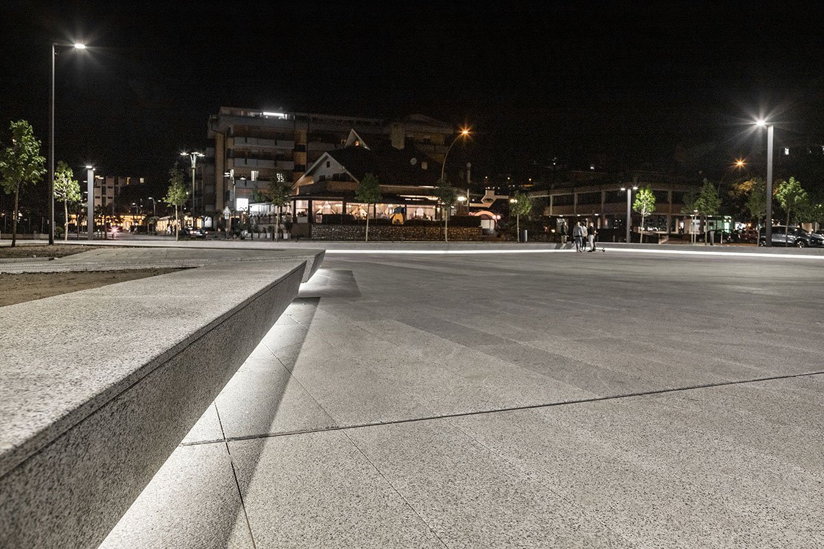 The south-facing car park-market area rationalises the space with almost the same number of parking spaces as in the previous layout. There is a particular care to the peculiarity of the asphalt that assumes, thanks to the addition of oxides, a reddish-purple color which is coherent with that of the porphyry cobble. Near the station there is a fountain made with a system of jets, that can be regulated with different heights and with a variable chromatic lighting system.