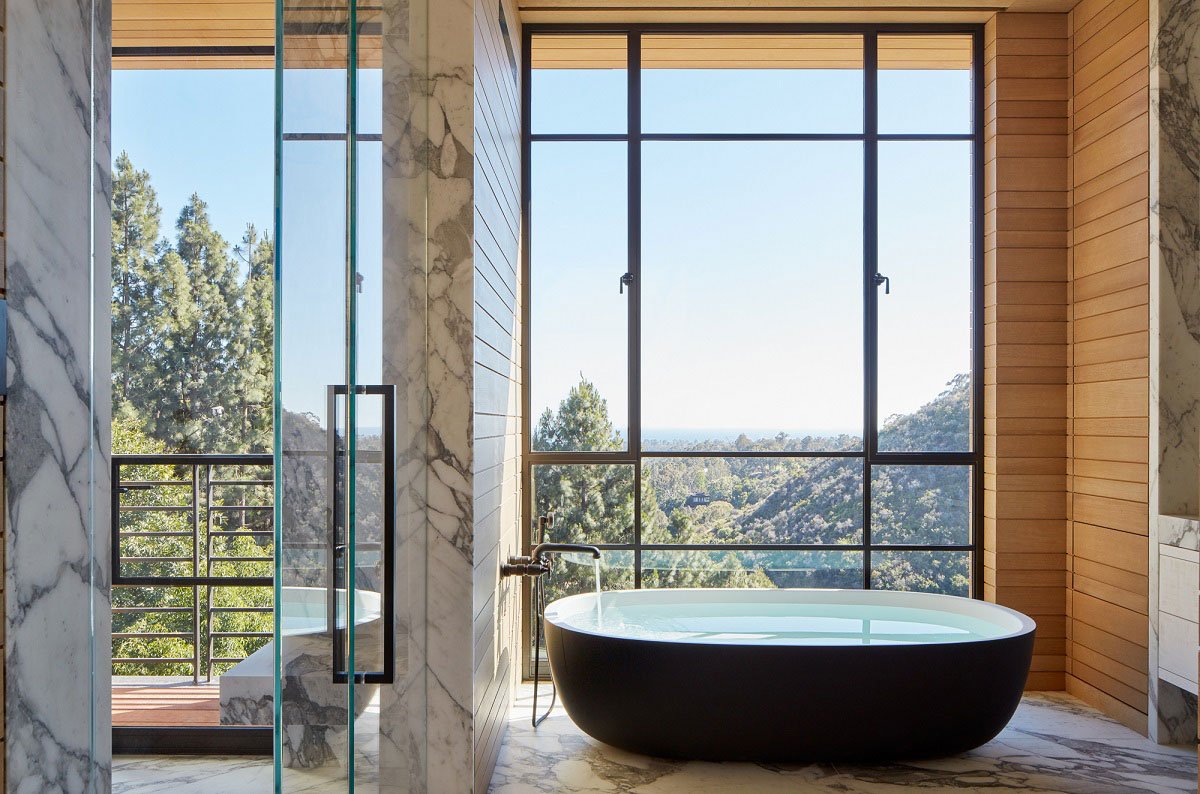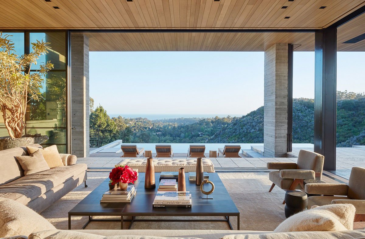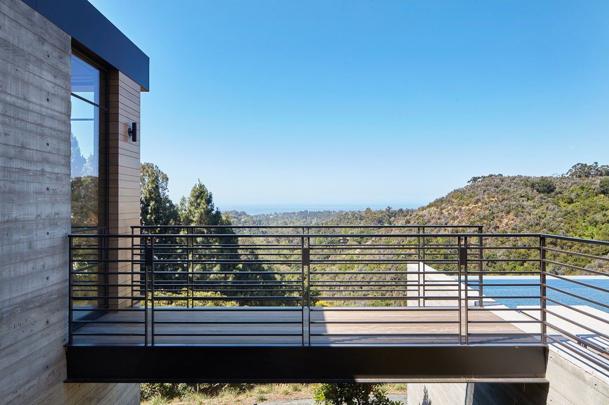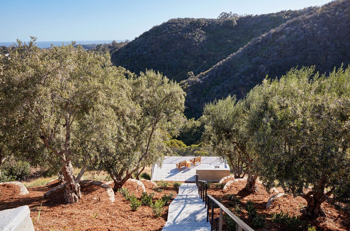 [Text as submitted by architect] An entrepreneurial family with a passion for healthy living requested a large home on their dramatically sloping 2-acre site. They wanted an informal layout woven into the topography. They also wished to enjoy as much of the site as possible, requiring the inclusion of steps and landscape pathways that lead to more distant parts of the steep site. Situated on a promontory jutting into the canyon below the hillside retreat boasts multiple vistas of the surrounding canyon and the Pacific Ocean beyond. However, local restrictions allowed for a single story above street level. Responding to these conditions, much of the home’s massing is located on a lower-level that daylights onto the downslope side of the house. This modest massing arrangement allows for neighboring properties to see over the roof of the home.