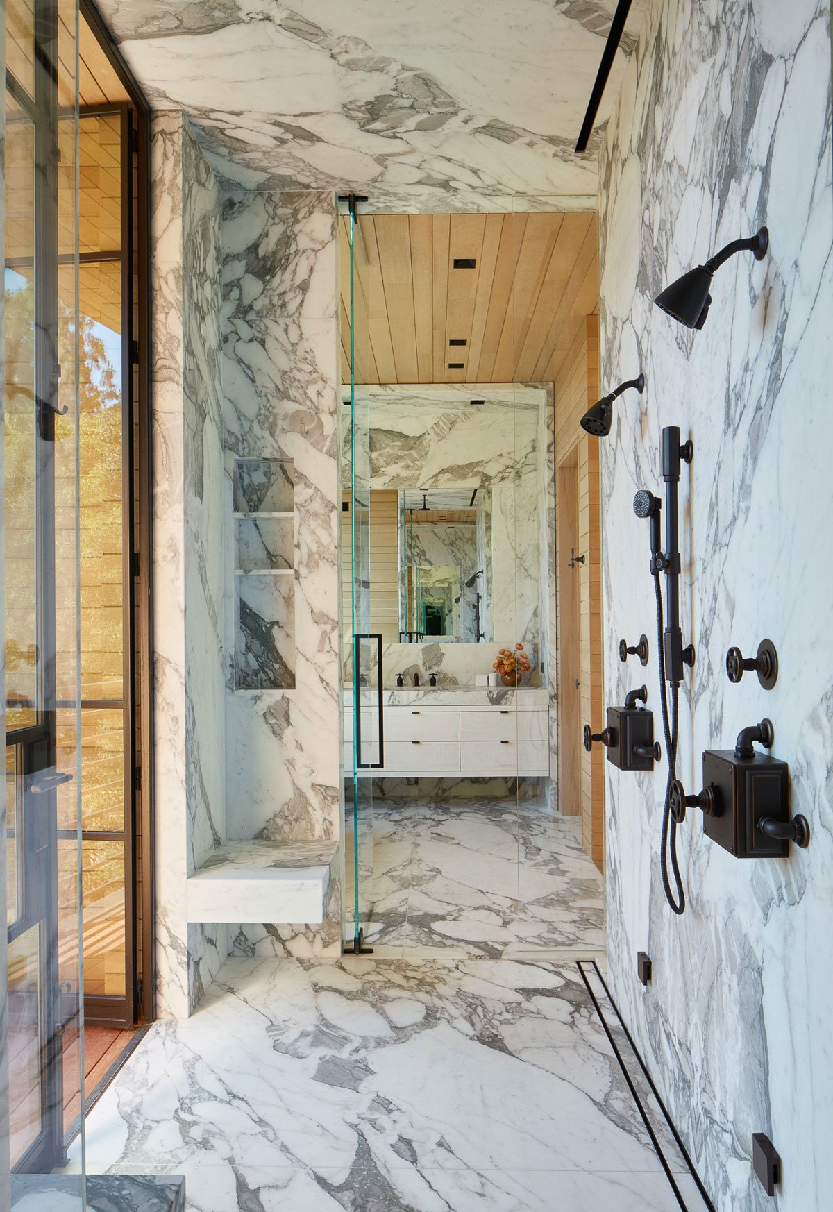In three distinct locations, landscaped topography “fingers” heighten one’s awareness of the panoramic scenery. Bridges span over these fingers, extending the natural graded areas into the heart of the home. The design solution offers new perspectives for experiencing the owner’s prized views while providing a glimpse of the topography as it stood before the house was set upon it. The use of a simple color scheme and contemporary materials is central to the design philosophy. French manor oak flooring, white oak shiplap wall cladding, oil rubbed bronze wall panels, and painted steel show deference to the picturesque surroundings. Pebble and stone accents embrace the nearby mountains resulting in material palette that is modern, yet warm.