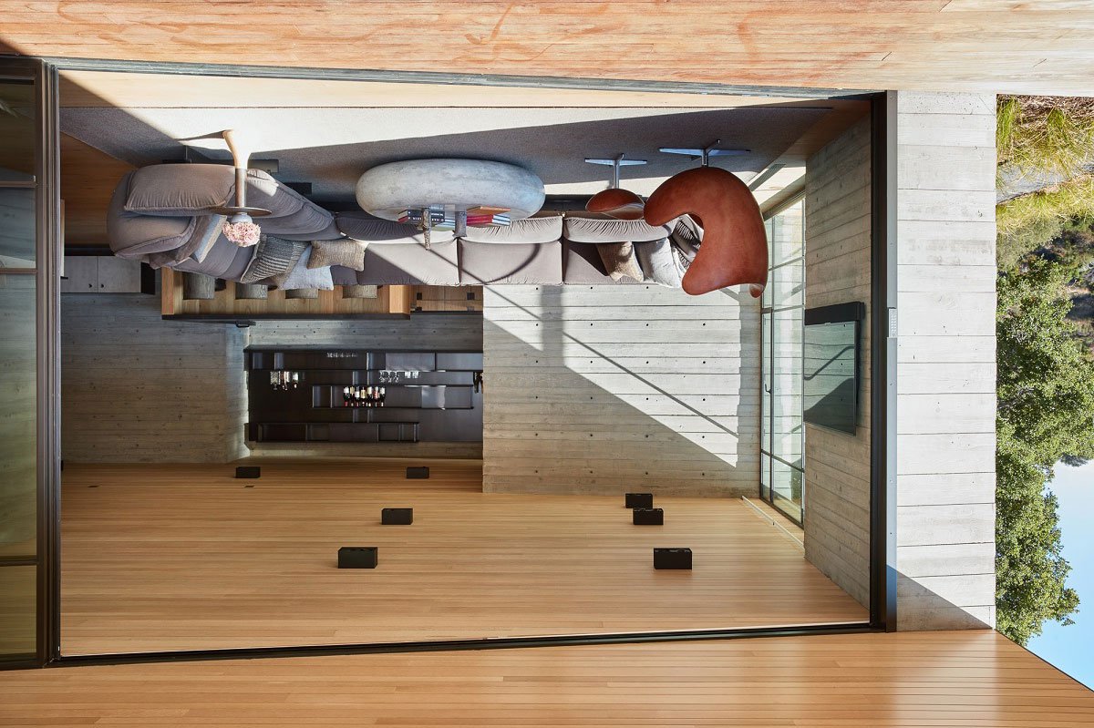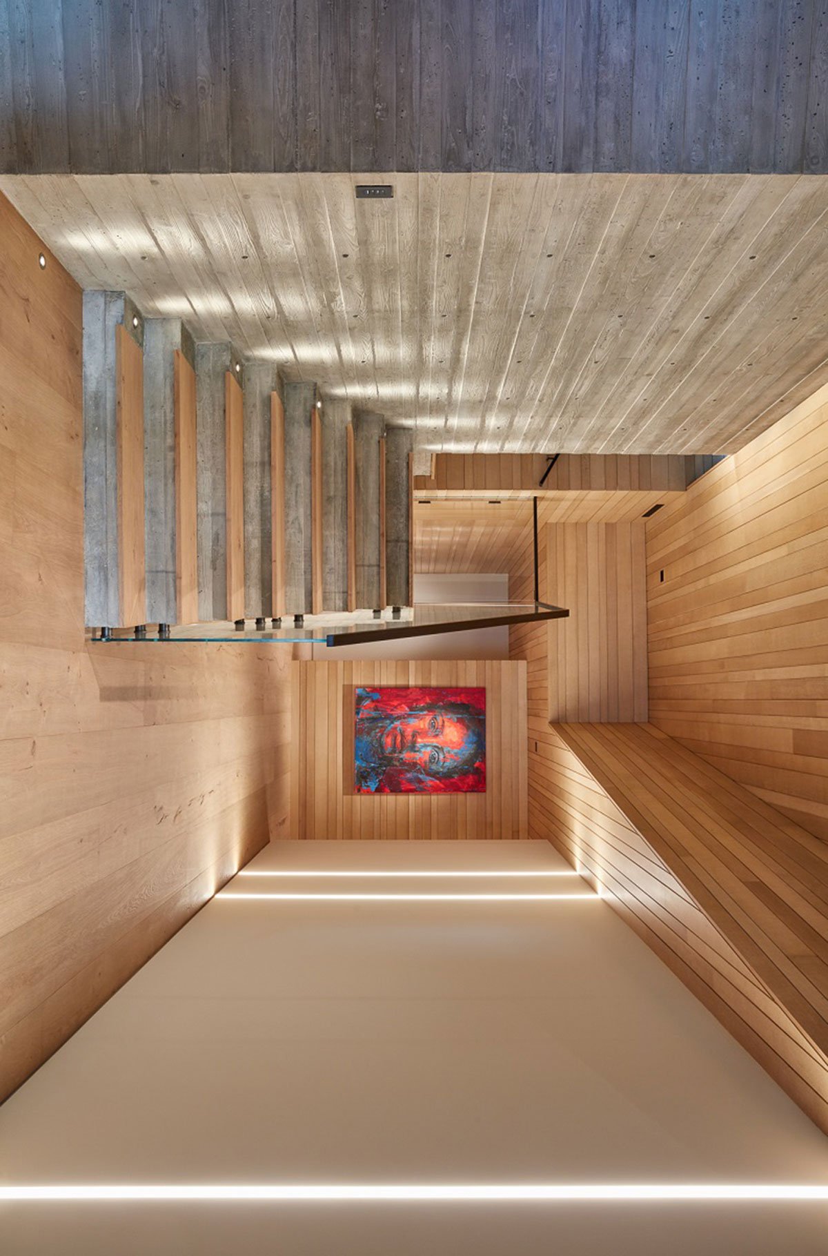 Meticulous craftsmanship and authentic building materials are recurring themes best exemplified by the widespread use of board-formed concrete walls, white oak shiplap cladding, and painted galvanized steel doors and windows. A datum of wall elevations was carefully laid out to align the joints of the seemingly random board-formed concrete with the adjacent wood boards that come in 3”, 4”, 5”, and 6” widths. Floors, ceilings, steps, lighting, speakers, keypad controls, and outlets were carefully placed so that no element interrupts a joint in the boards.