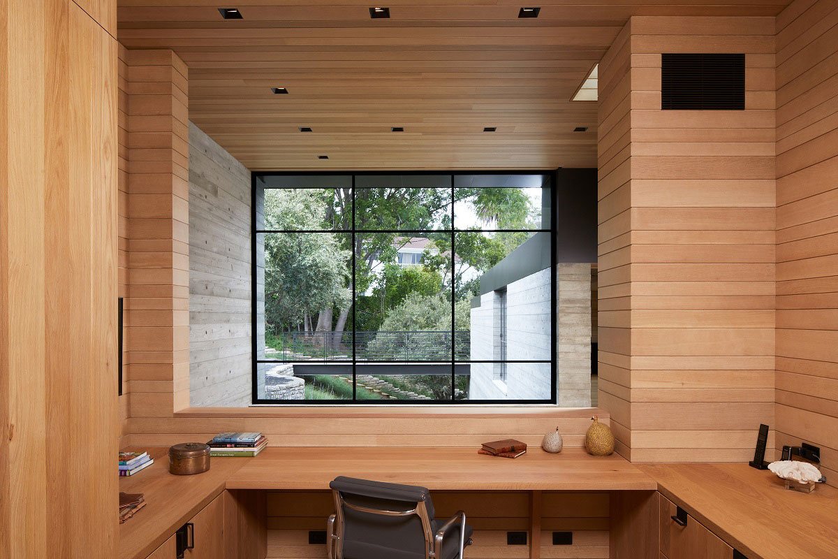 Excerpt: A Hill Side House, designed by Abramson Architects, is a large home on their dramatically sloping site with an informal layout woven into the topography. The home’s massing is located on a lower level that daylights onto the downslope side of the house. This modest massing arrangement allows neighboring properties to see over the home’s roof. Meticulous craftsmanship and authentic building materials are recurring themes best exemplified by the widespread use of board-formed concrete walls, white oak shiplap cladding, and painted galvanized steel doors and windows.