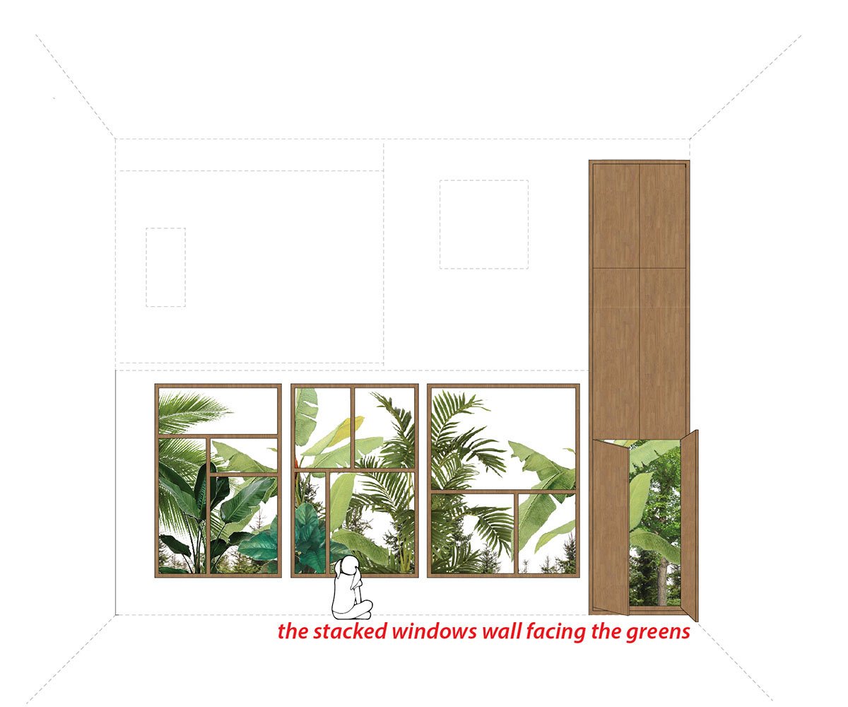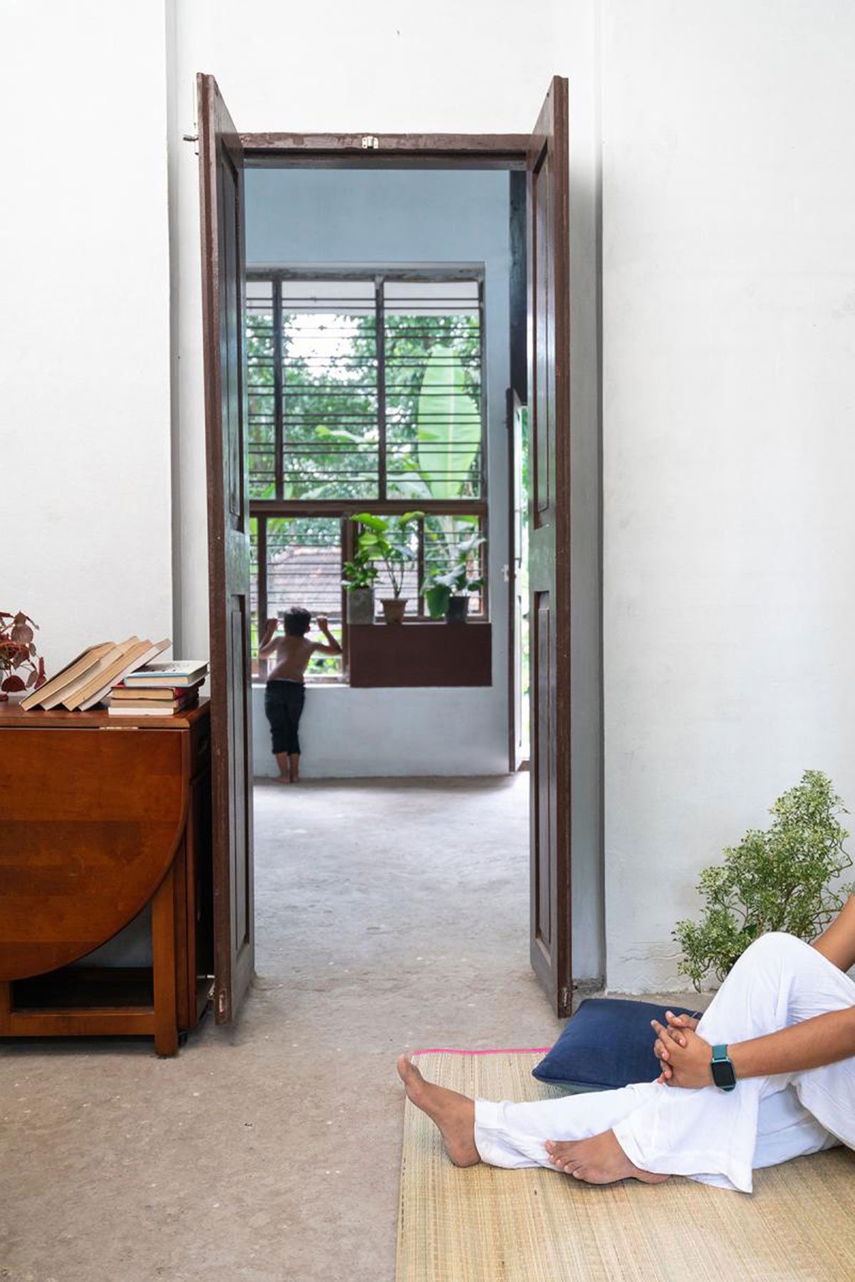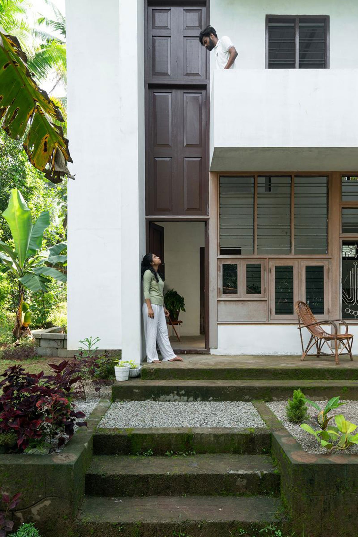 The design was attempted in stark contrast to the space they already lived in. The dark one-room single-storied space was converted into an all-white double-height volume with ample openings. The front wall facing east was made into an all-window wall (a collage of windows collected from another renovation site), facing the lush green exterior.