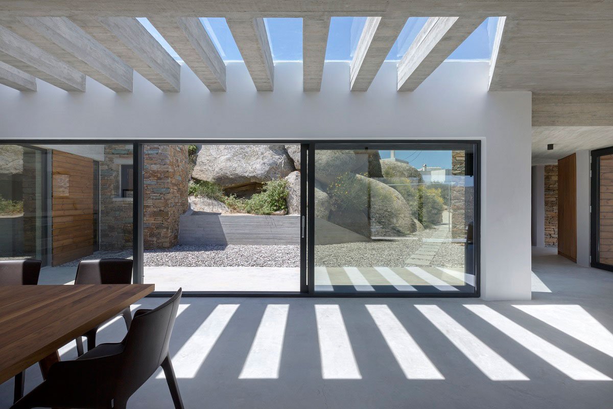 Equally typical is the northern side of the residence where we create a “limit”, an artificial protection of the space from the Northern Wind, a volume of apparent and non-painted concrete. The selection of this materiality makes the house seem also like a rock while in time, when the colorful concrete aggregates emerge to the surface, it will be totally integrated with the landscape. On the other hand, the selection of its shape, an oblong rectangle, manages to give prominence to the rocks “underlying” them and enhancing their sphericity, setting them in direct “confrontation” with its own linearity. In the internal part, the hard envelope “breaks” and becomes “transparent”, allowing the interior to become one with the exterior part.