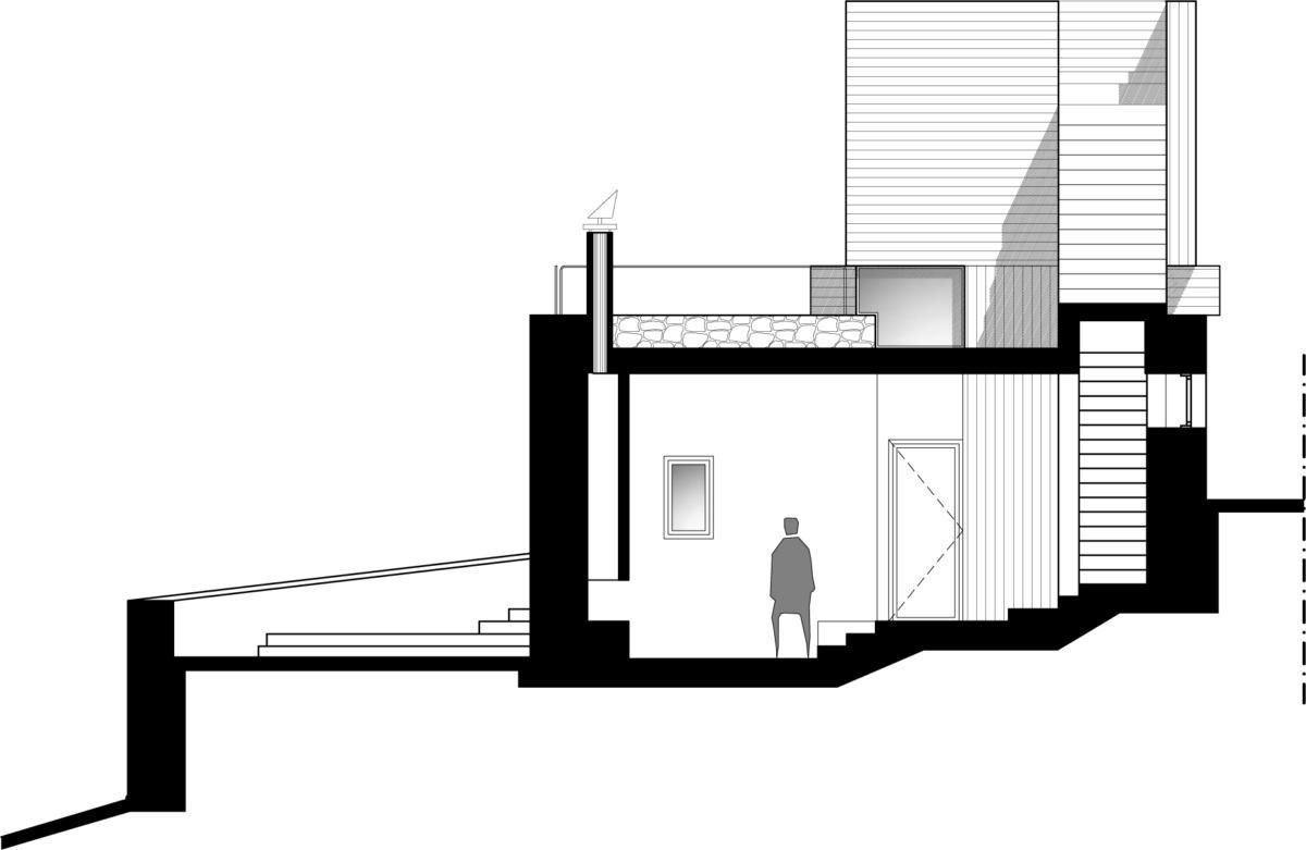 At the same time, the big square opening which breaks out of the stone structure in front of the sitting-room, operates as a screen which sets the view free while forming a small berm – outdoor sitting-room – at the yard. This is the point of bonding the “inside” with the “outside”.