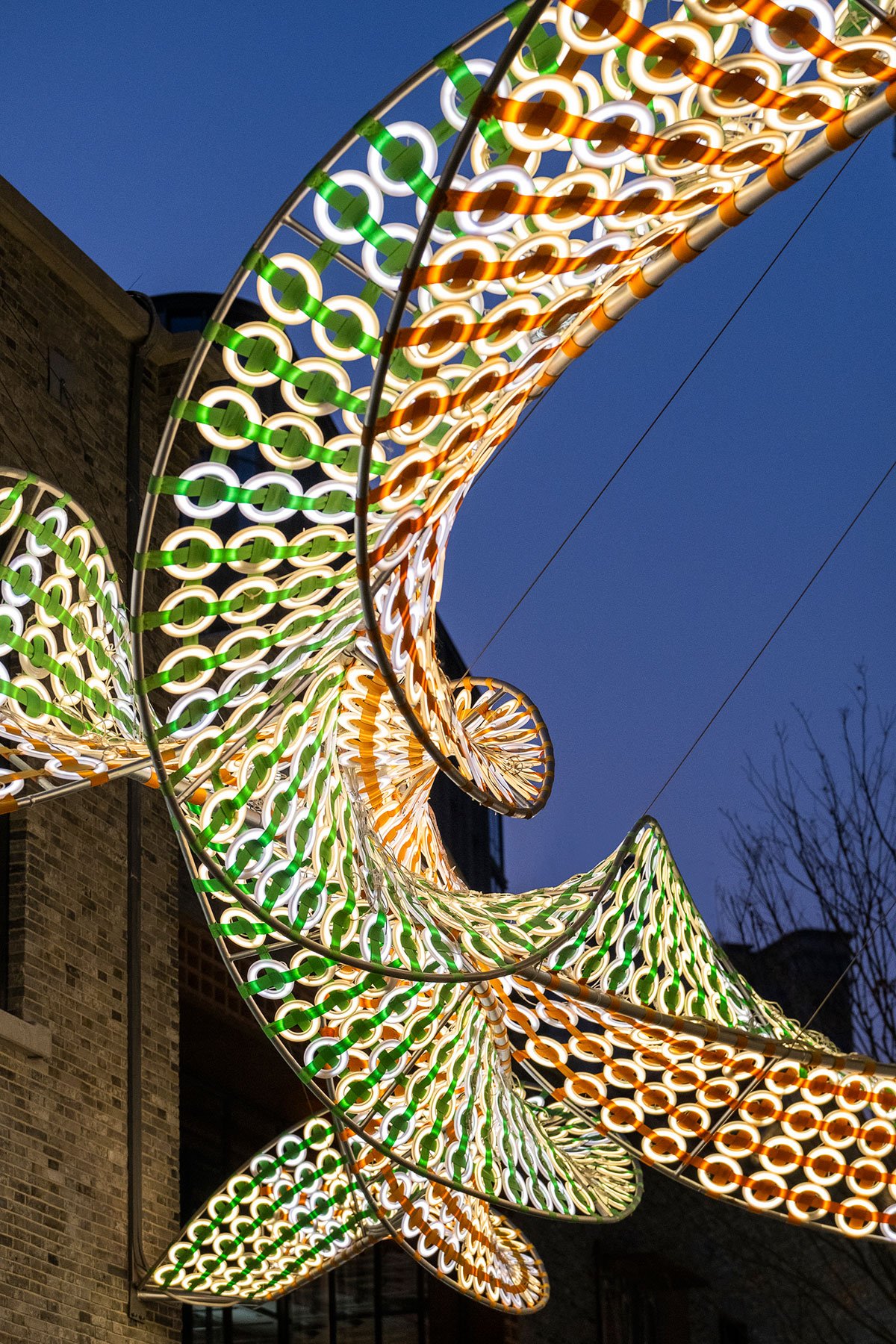 The continuously rolling surfaces, green and orange woven straps, and enlarged handcrafted nodes contrast with the narrow alleyways, grey bricks and red tiles. People passing under the lighting helices, constitutes a retro and magical urban scene.