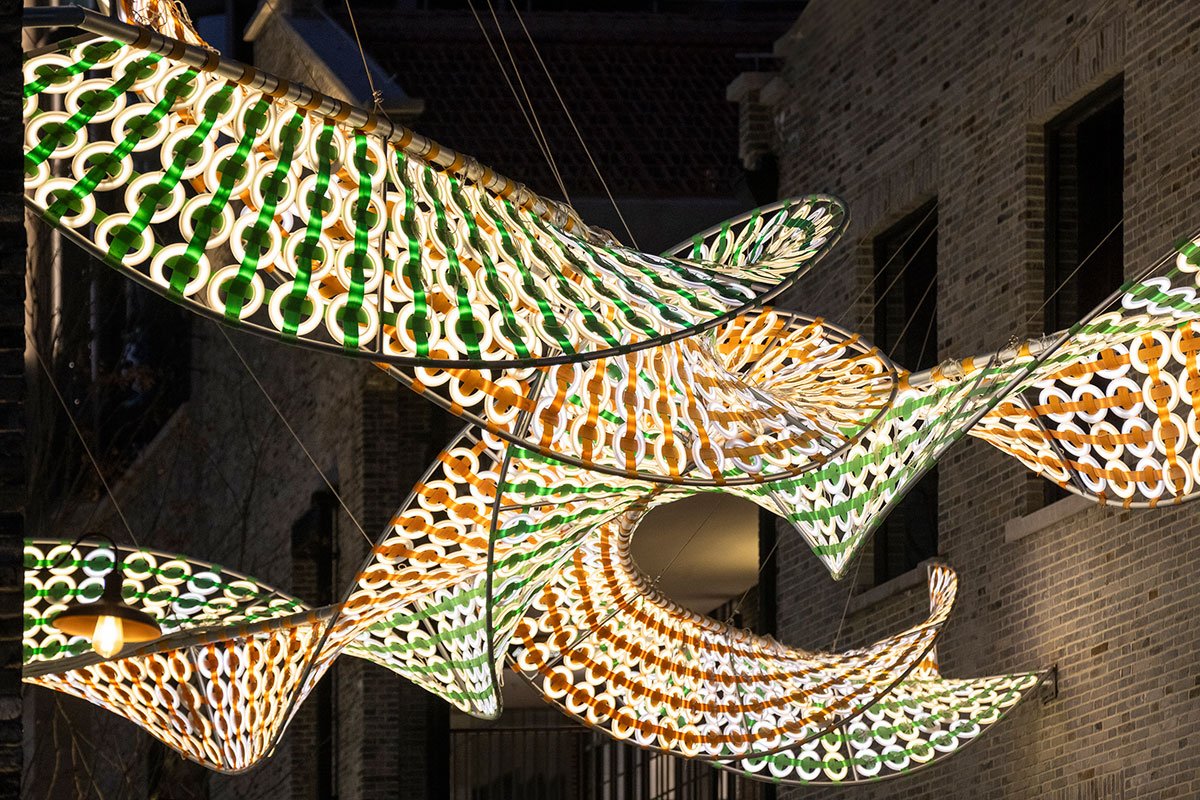 The installation consists of two curved double helices that form an X-shaped steel frame, suspended from steel cables on the gable walls. It resembles a Shanghai traditional breakfast staple, youtiao (a fried dough twist), or a dragon-shaped monster welcoming the Lunar New Year. The surface rolls continuously in space, providing a flowing and ever-changing perspective from various directions and levels of the district.