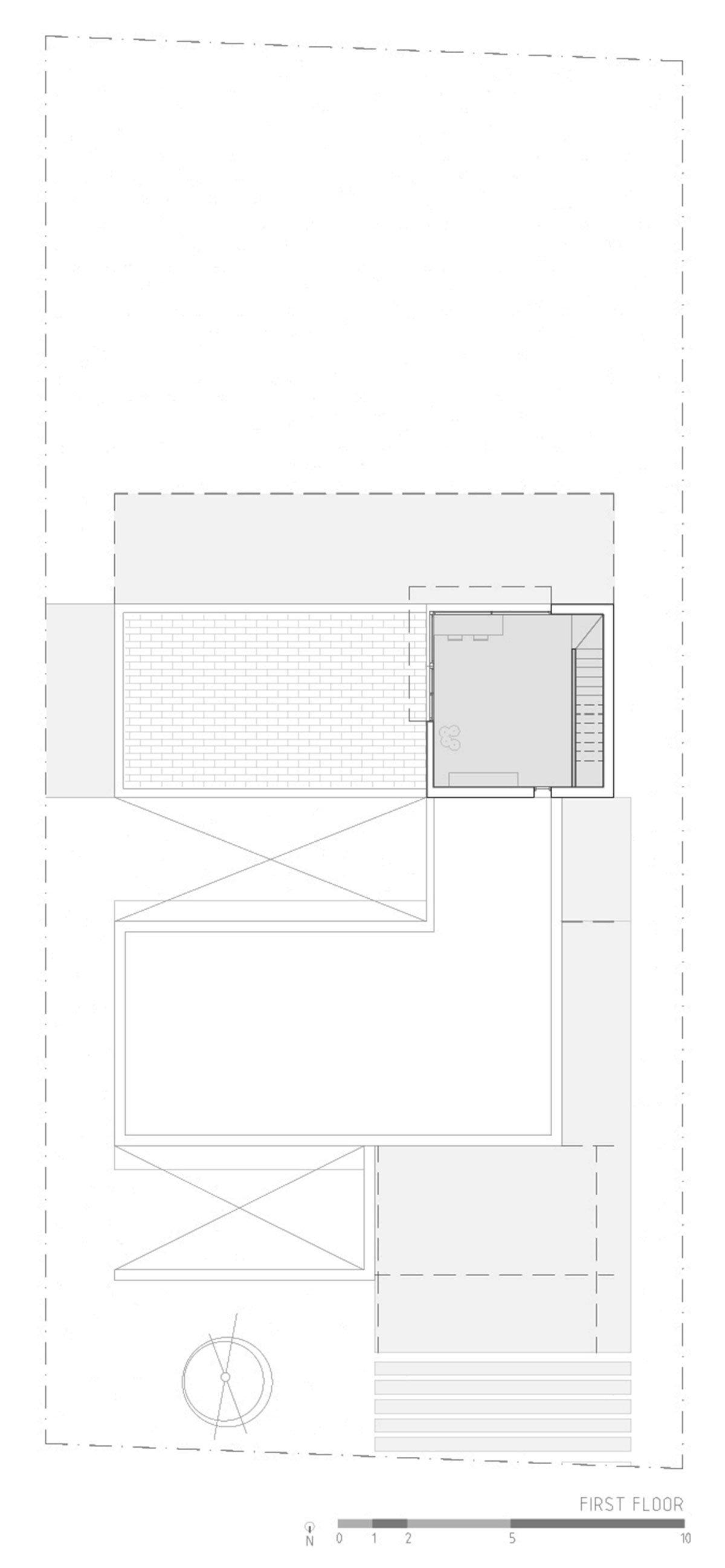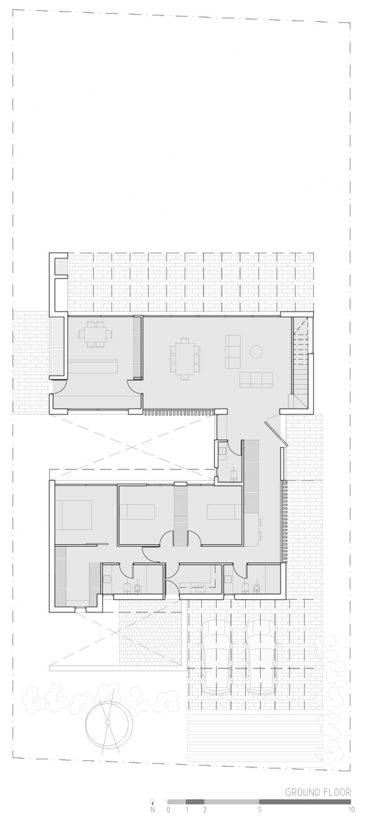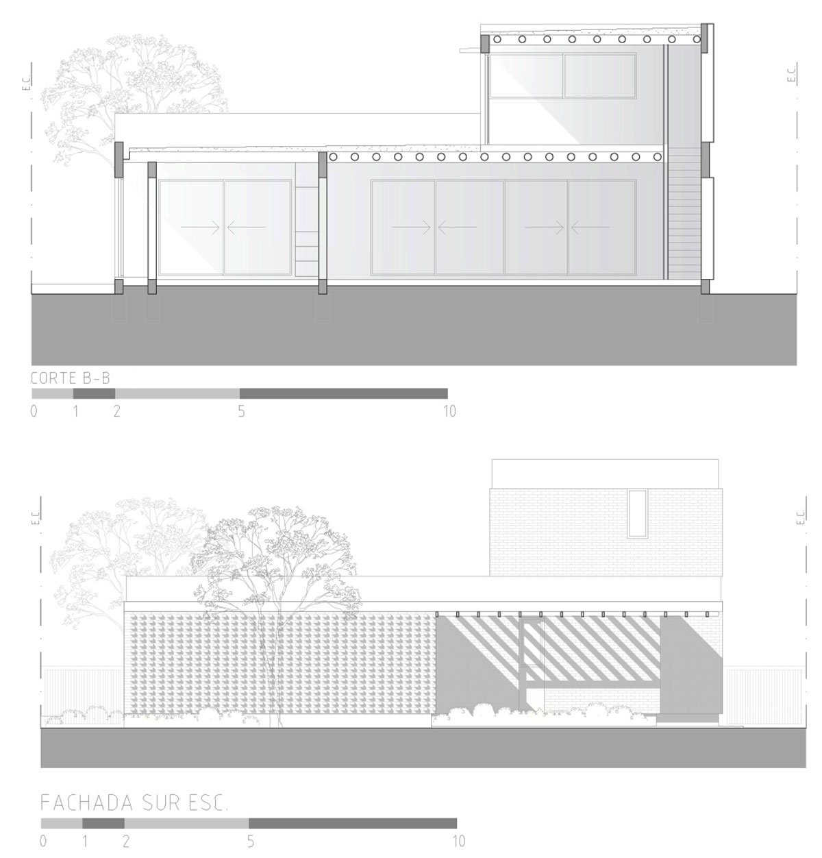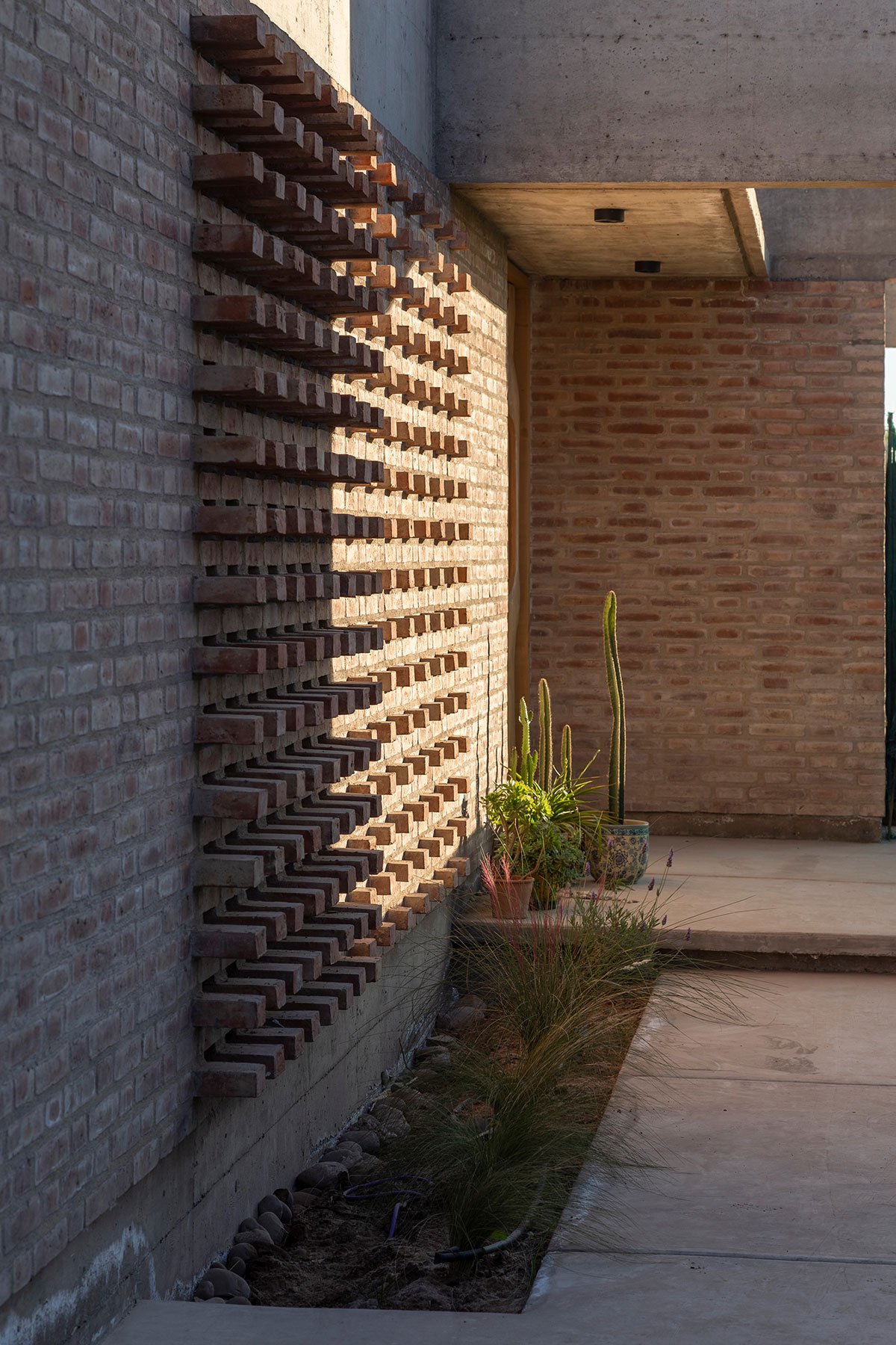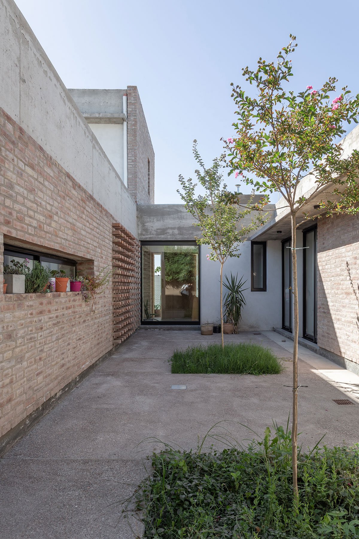 The bedrooms are arranged around an intimate inner patio, providing these spaces with a private retreat full of light. Strategically placed windows maintain a connection with the exterior while ensuring a sense of personal space. On the practical front, service areas face the street, shielded by an open lattice wall that delivers privacy and architectural interest.