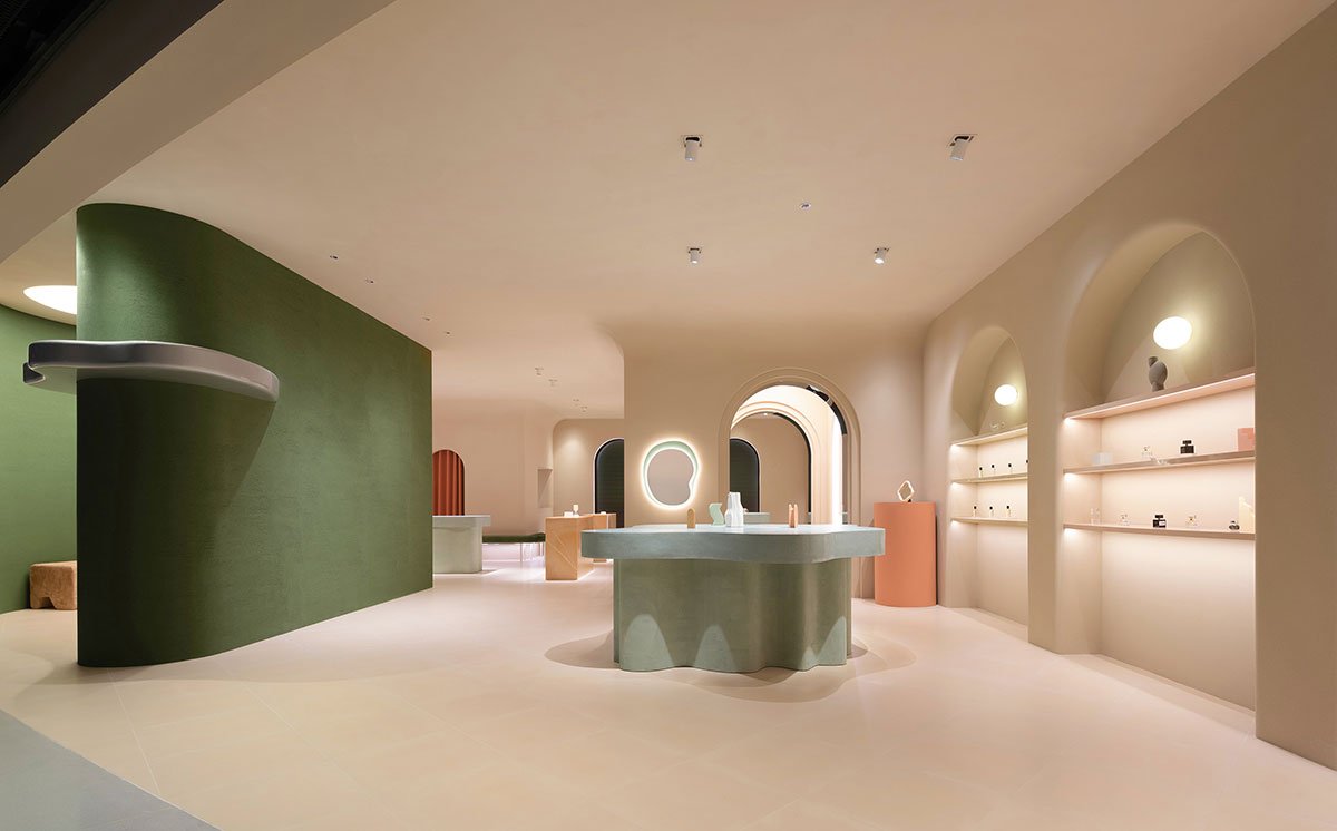 aaddd is located in the hinterland of B1 floor in the southern district of BFC. Through the planning and integration of the original space, aaddd is divided into two areas as a whole: aaddd Essential Selection Area and Main Selection Area. Inside Main Selection Area there are “Cloud” Installation Area and Rest Area.The overall color scheme of aaddd is based on warm pink beige, with warm tones of lime green, red tea orange and emerald blue. Down from the escalator, the cozy atmosphere of the open store is separated from the surrounding cold and light environment, enhancing the aesthetic recognition of the brand at first sight.