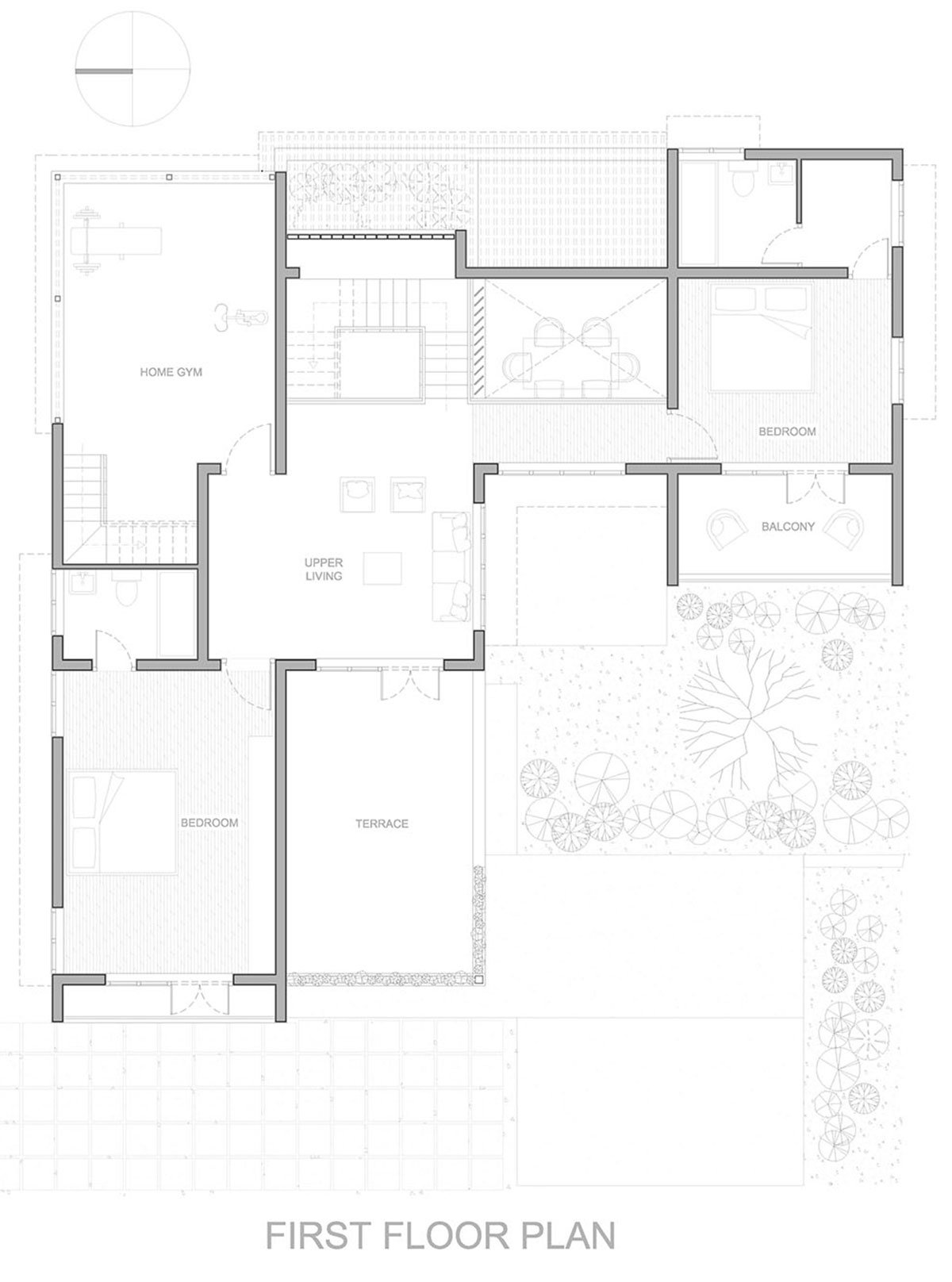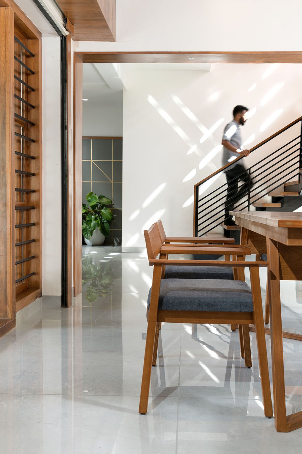 A conscious study was undertaken to locate the built space without hampering the existing vegetation within the site. The idea of a large central courtyard emerged as a design solution to retain adult trees in the heart of the site. Subsequently, the proceeding-built spaces evolved around this central courtyard which served as the foci, thus enabling uninterrupted flow of fresh-air and a visual continuity to every other space within the house. Large openings and cross ventilation ensured comfortable indoor environment. Appropriate details like perforated false walls and double volumes were incorporated on the south and west side of the house in order to craft thermally efficient and cooler interior spaces.