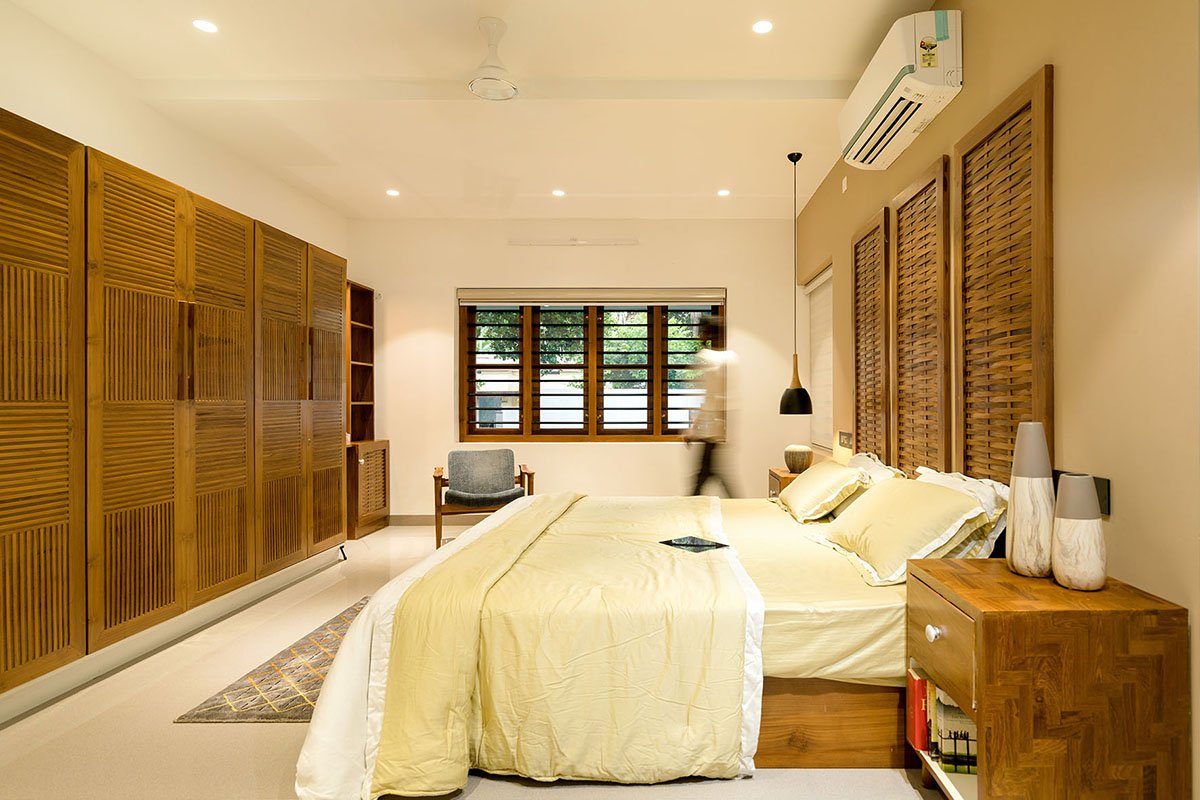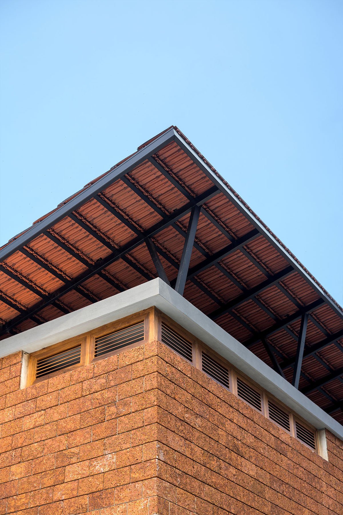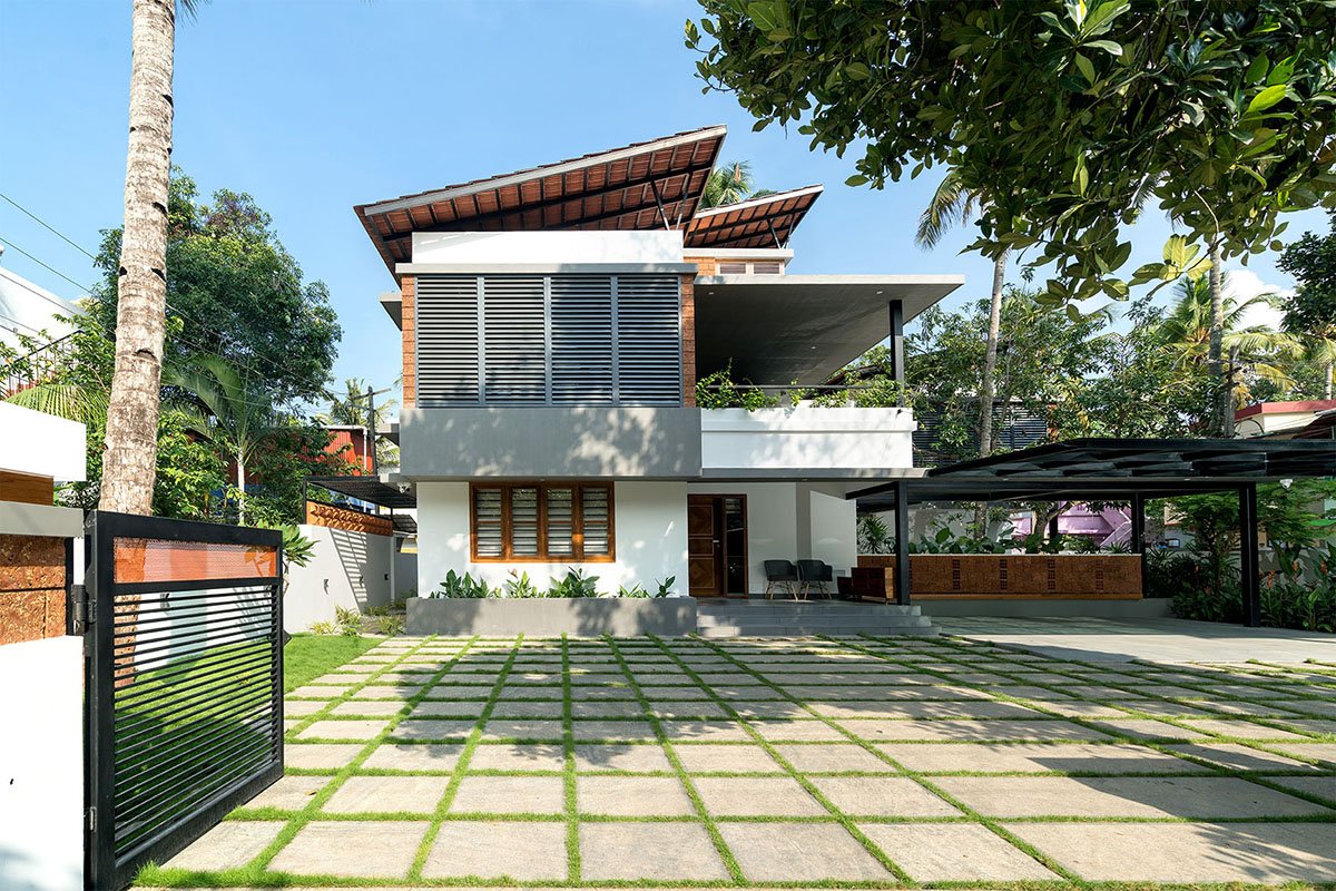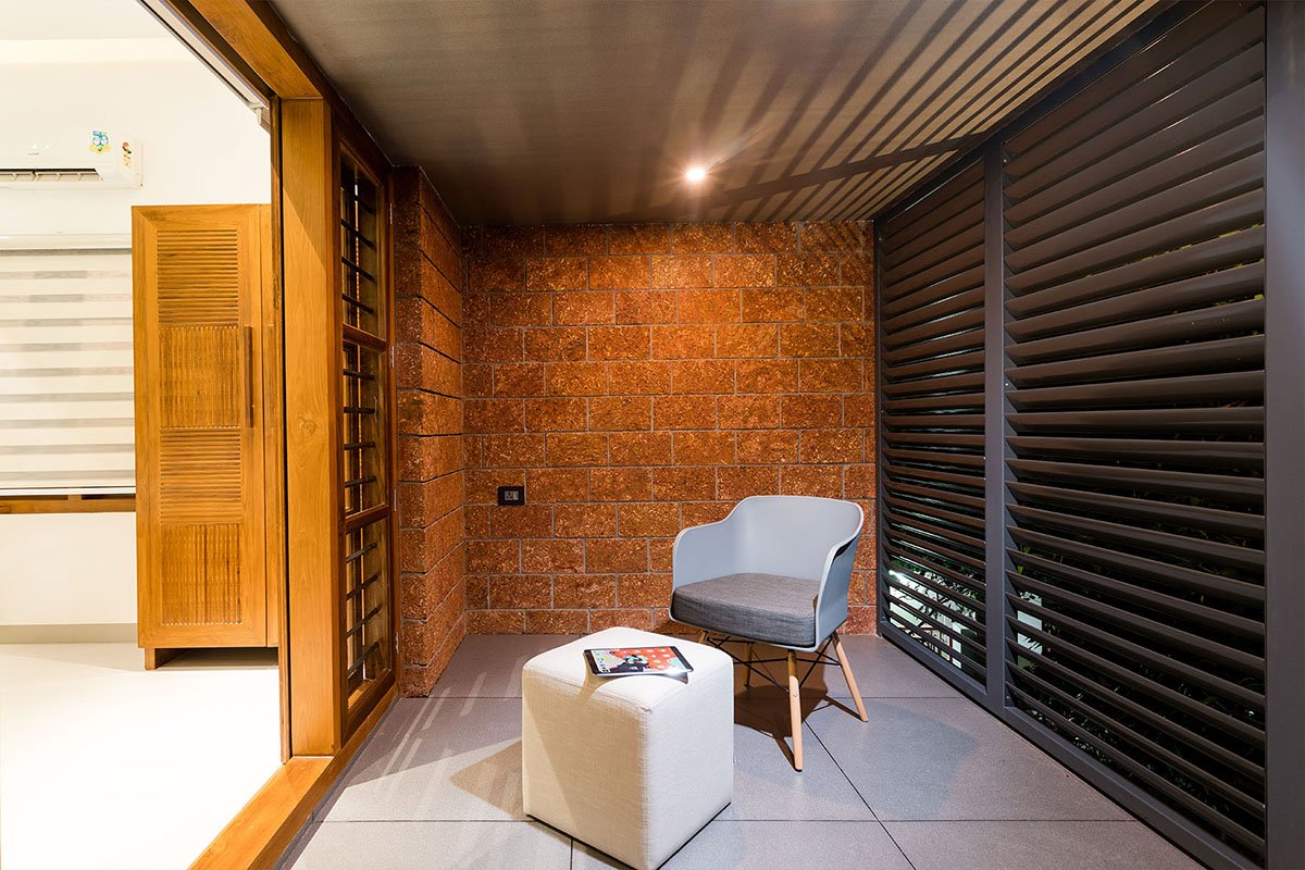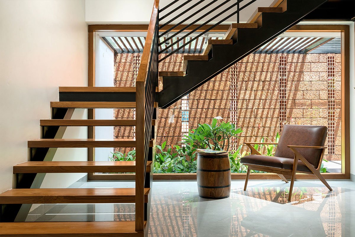The interior layout of the rooms was meticulously designed for effective circulation and movement through the house. The design also compliments the openness in plan and has a minimalistic style. Materials were carefully considered and selected based on local availability and its thermal effect on interior spaces. Laterite bricks from Kannur were used extensively with precise construction details, as a substitute for cladding on the exterior walls. The laterite blocks offer an interesting texture to the façade while the innate porosity of the material reduced heat transfer. Parasol roofs inclined at 12 degrees, were incorporated to bolster passive cooling of the interiors and as a structure that can conceal the solar panels installed on them. Aaron’s courtyard today runs entirely on sustainable energy generated from these roofs.