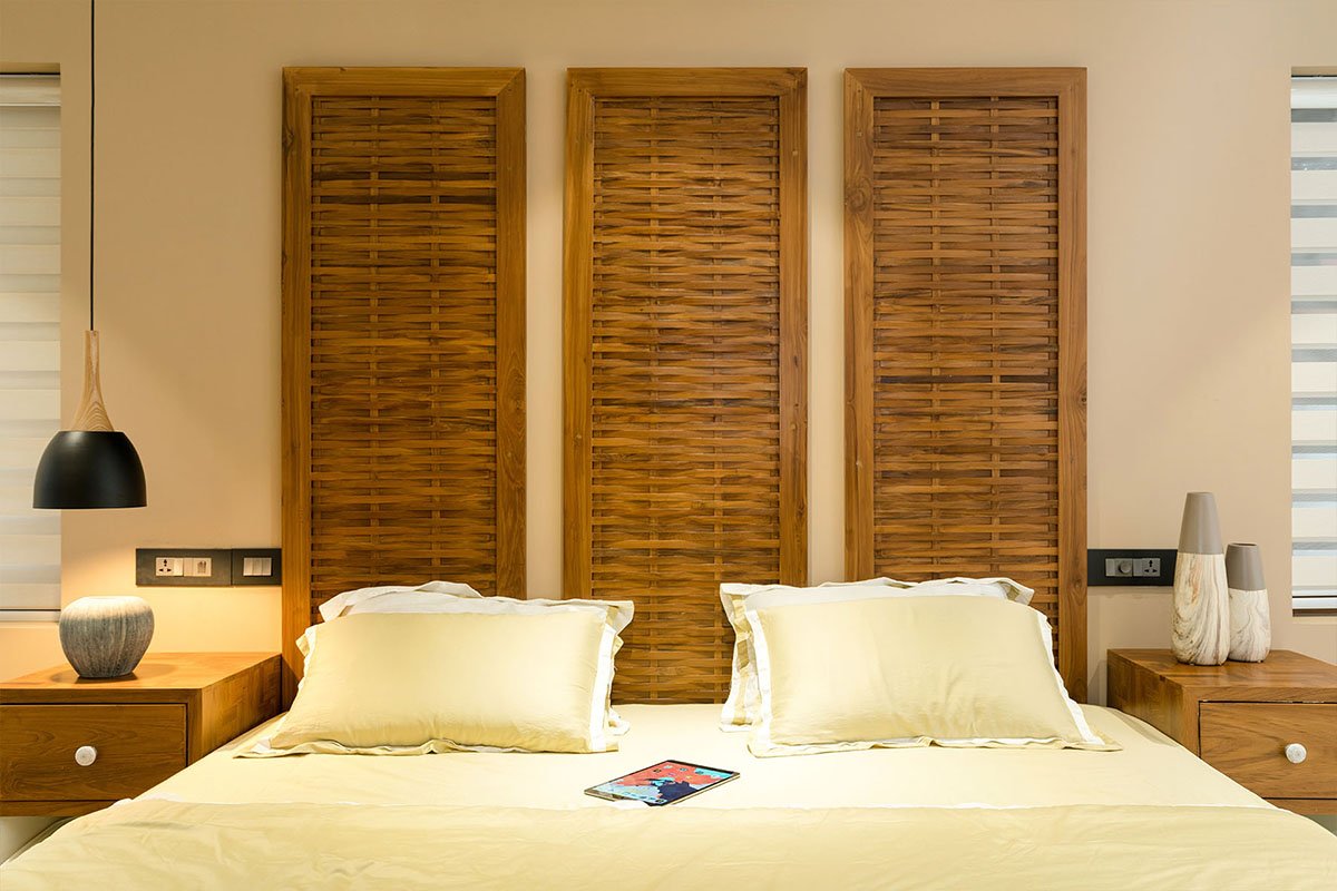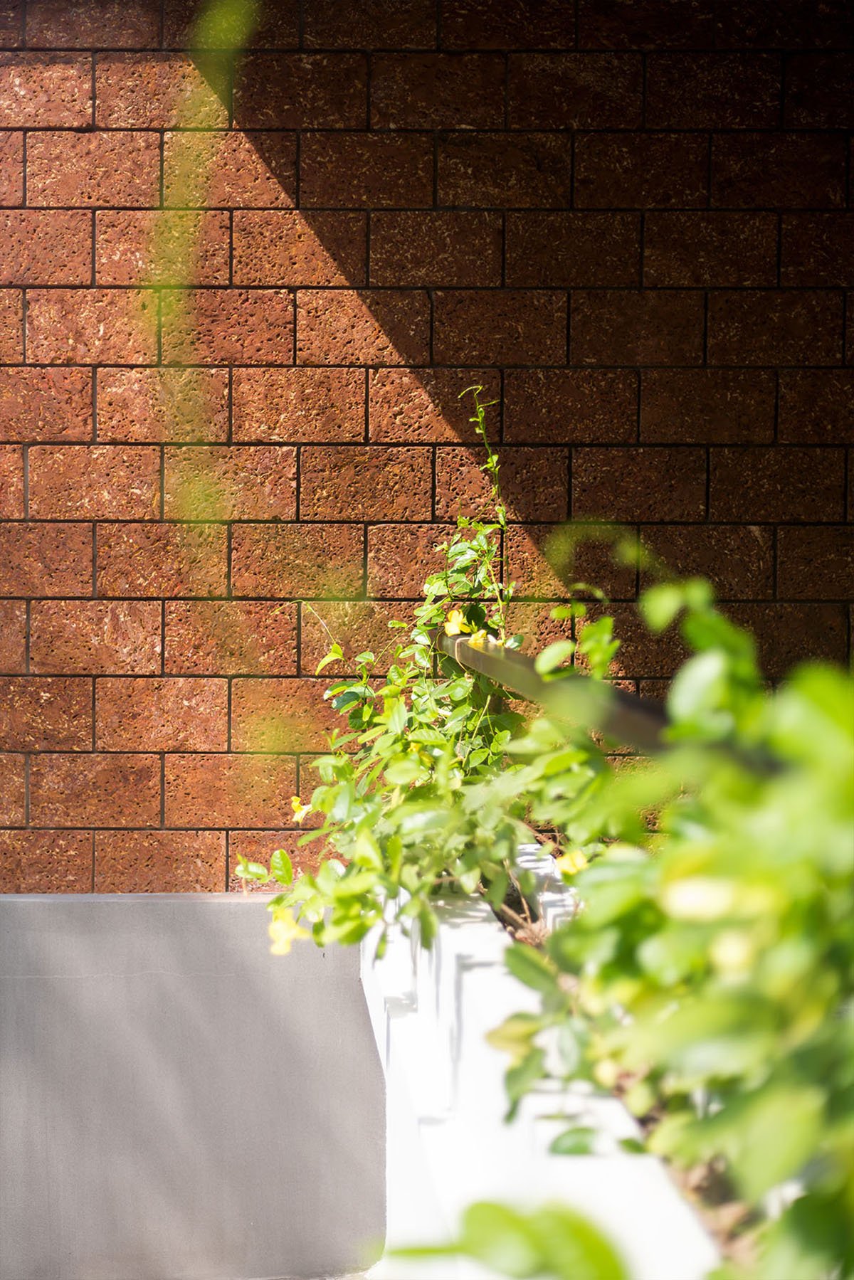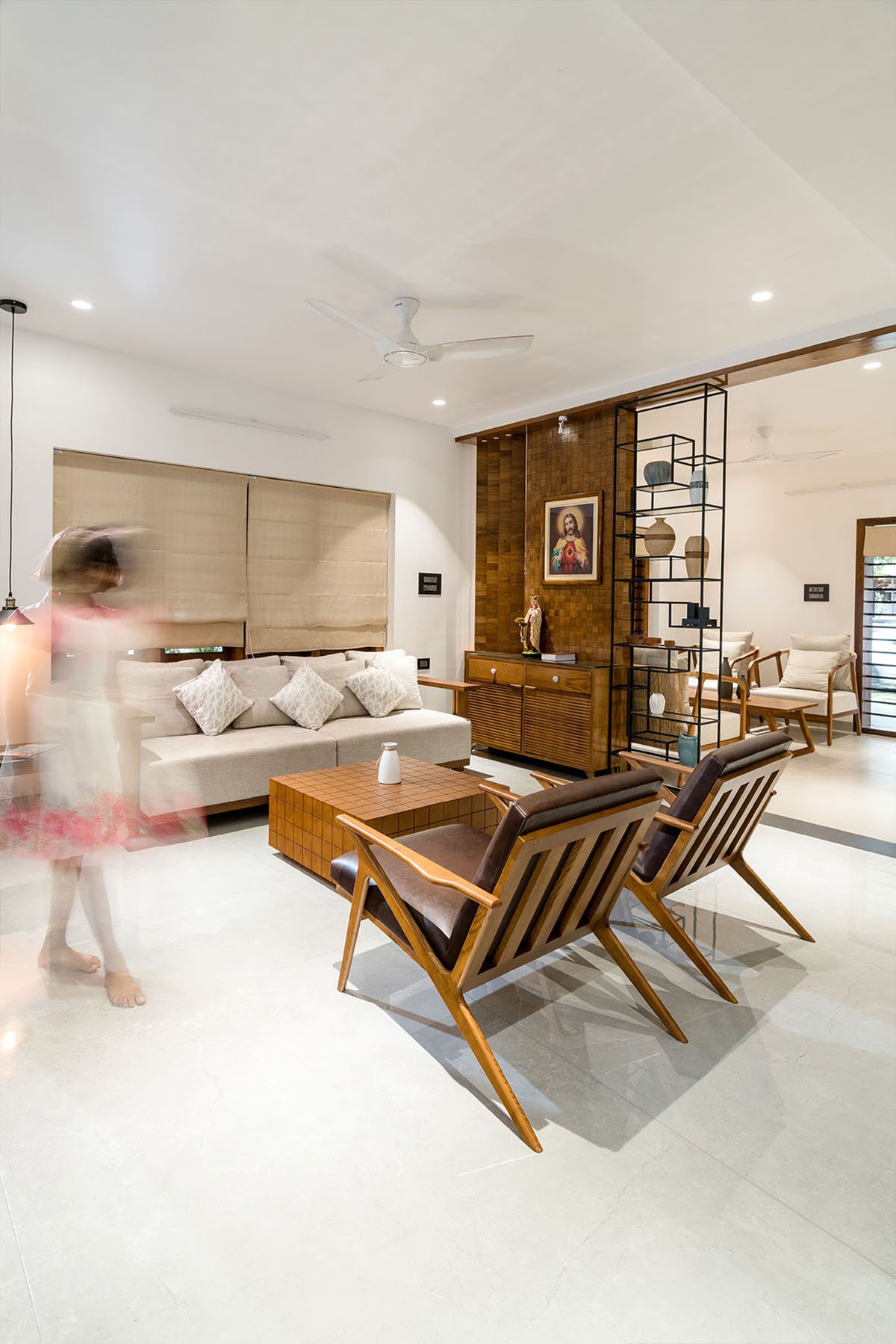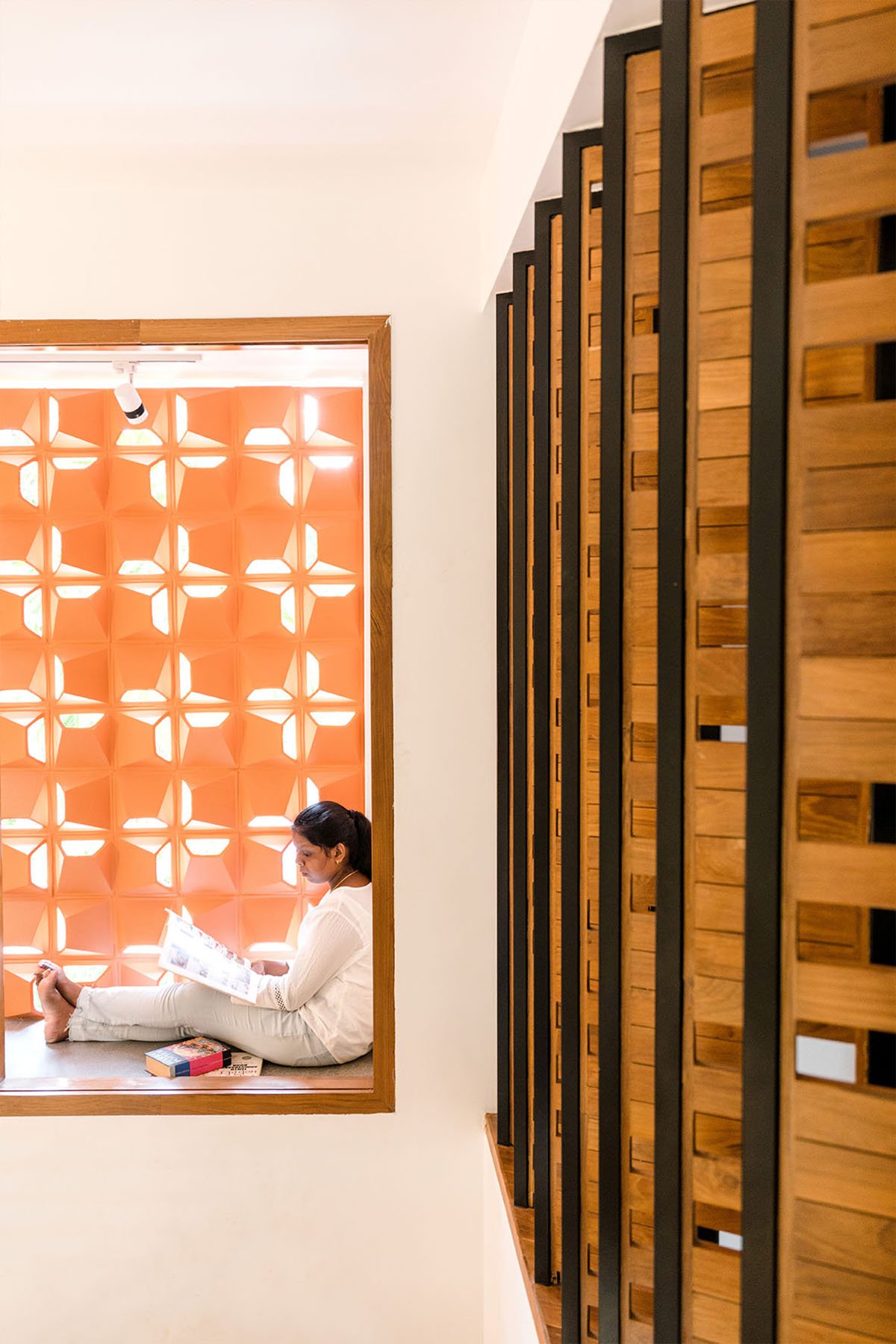 The interior layout of the rooms was meticulously designed for effective circulation and movement through the house. The design also compliments the openness in plan and has a minimalistic style. Materials were carefully considered and selected based on local availability and its thermal effect on interior spaces. Laterite bricks from Kannur were used extensively with precise construction details, as a substitute for cladding on the exterior walls. The laterite blocks offer an interesting texture to the façade while the innate porosity of the material reduced heat transfer. Parasol roofs inclined at 12 degrees, were incorporated to bolster passive cooling of the interiors and as a structure that can conceal the solar panels installed on them. Aaron’s courtyard today runs entirely on sustainable energy generated from these roofs.