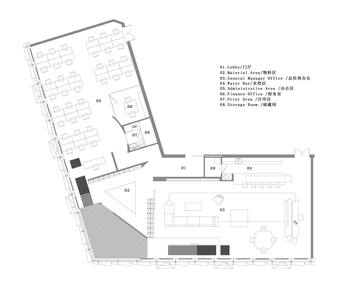 The material display area is often considered the most cluttered and private space in the corporate office. This stereotype stems from an uneasy mindset that desires to hide imperfection. However, with a confident attitude, AD ARCHITECTURE deliberately set the material display area at the centre of the space near the entrance. The central position of this area makes work more efficient. It shows aesthetic expressions and reflects the design team’s challenge against uneasiness.