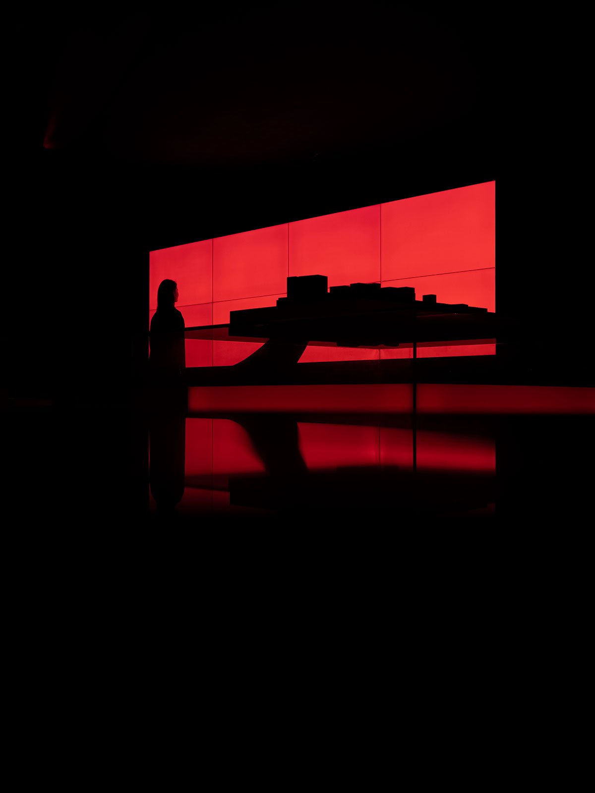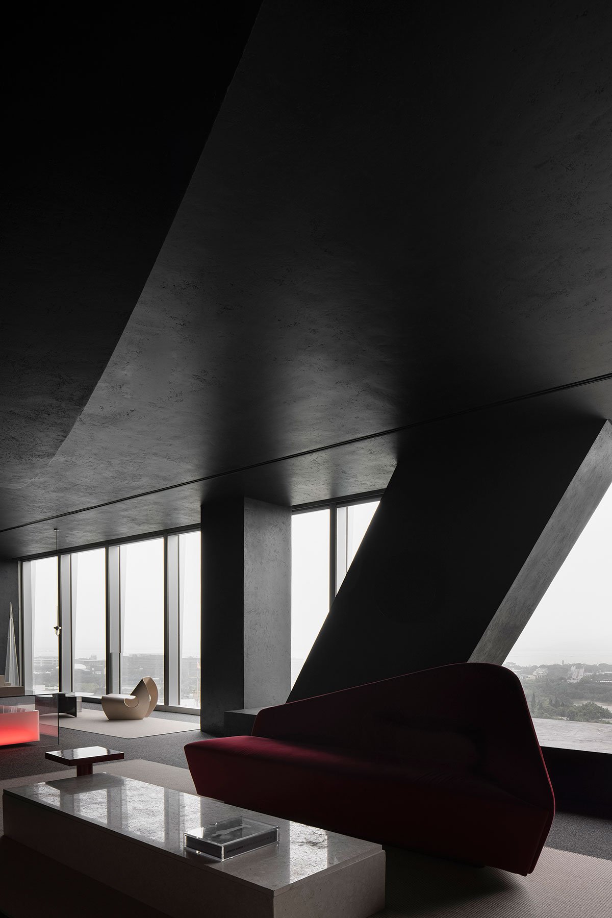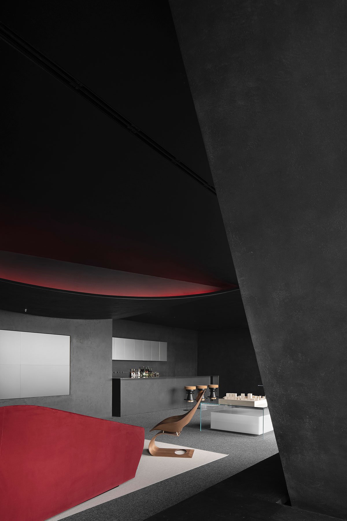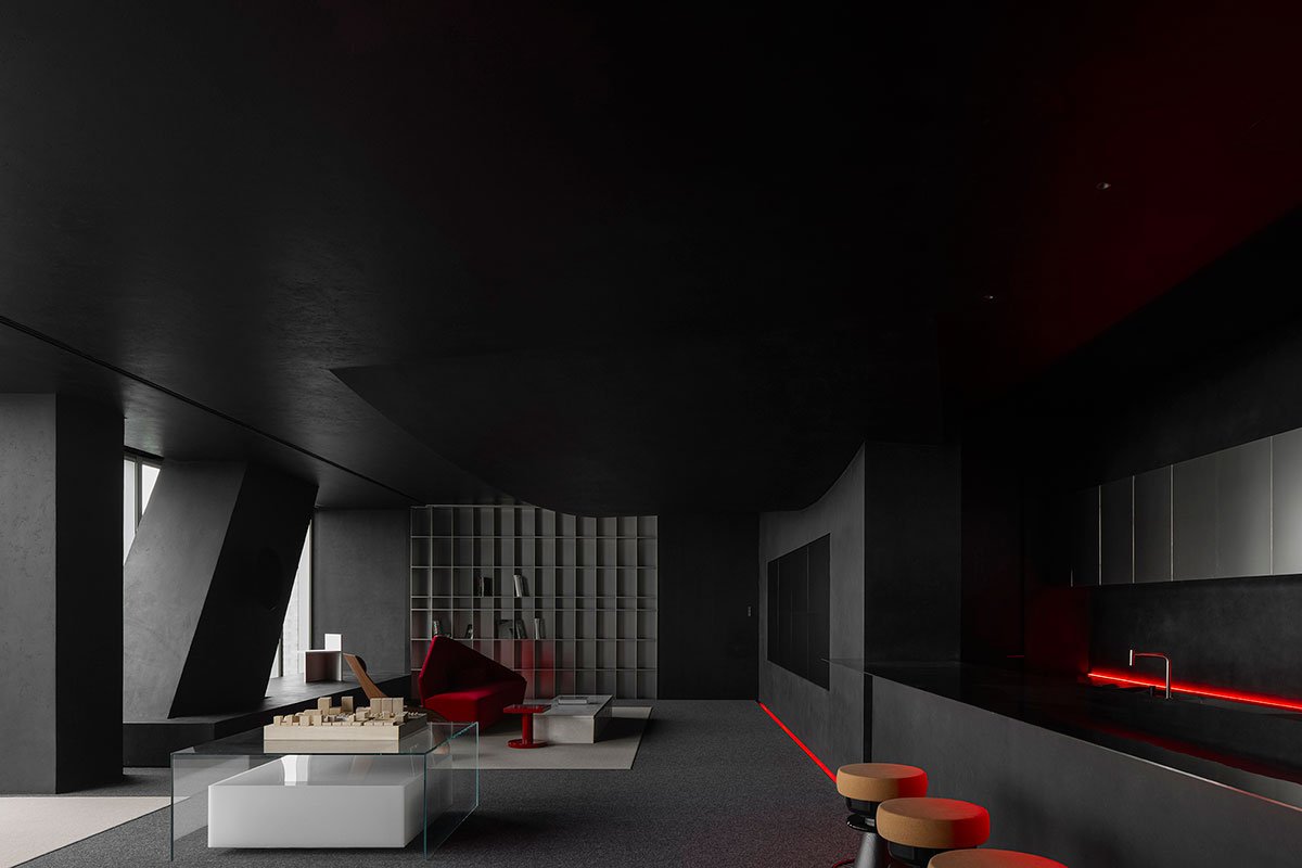 As night falls, the city and the cold office building are quite down. AD ARCHITECTURE wanted to alter such normality through design. Flame-like red lighting bursts out of the black box, bringing users to another dimension awash with seduction, ambiguity and illusion. It evokes rich emotions and brings more surprises rather than fear.