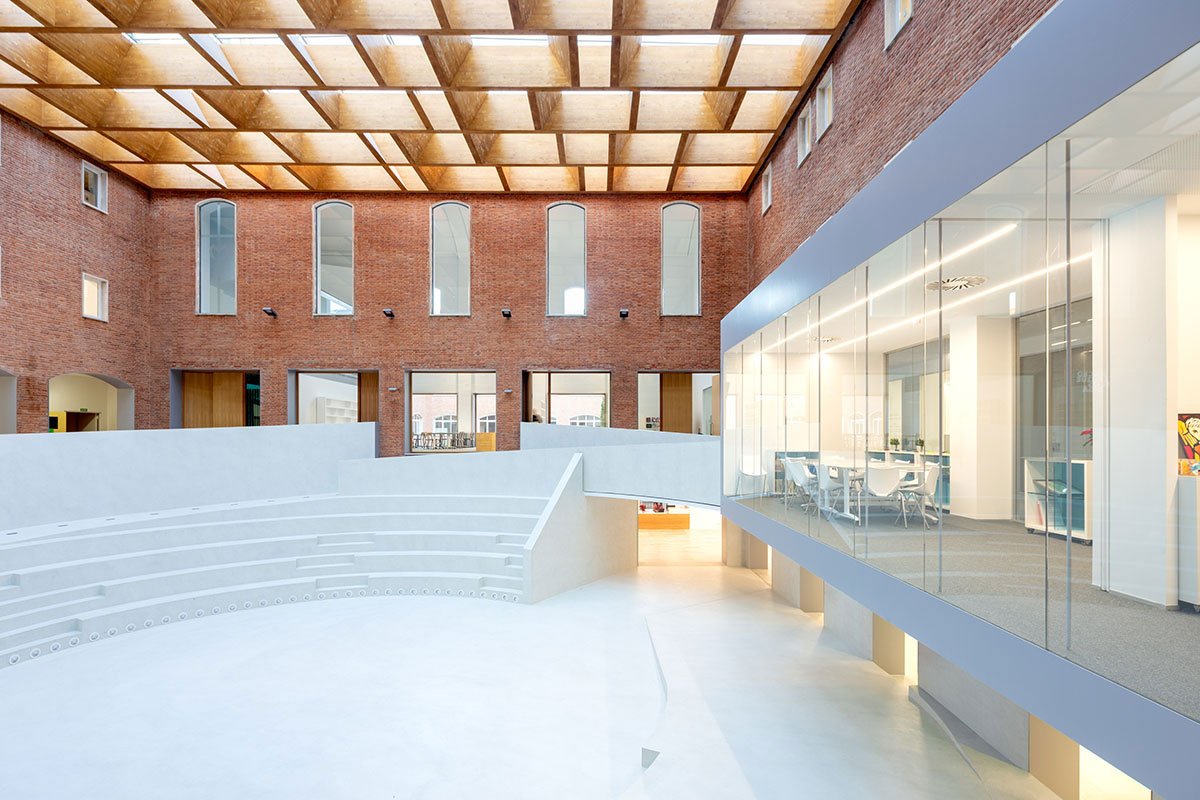 An easy access surrounded by terraces for interaction turns the old basement into an Acess Floor. A space excavated up to that level transforms a disused garden into the new school’s vital center. An access, passage, meeting, work, play, interaction, study or meditation space. The courtyard coverage organizes the space and irradiates light to all perimeter areas and uses that surround it.