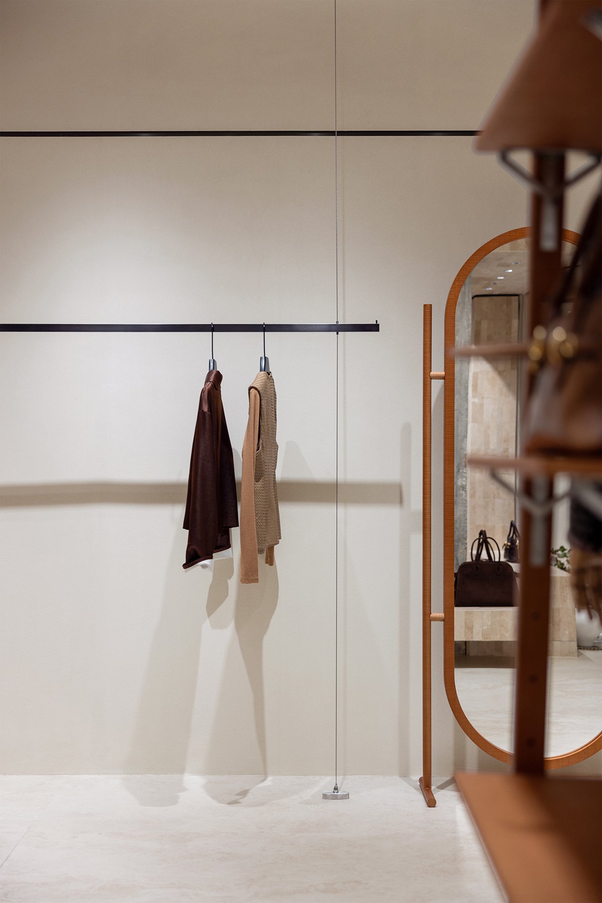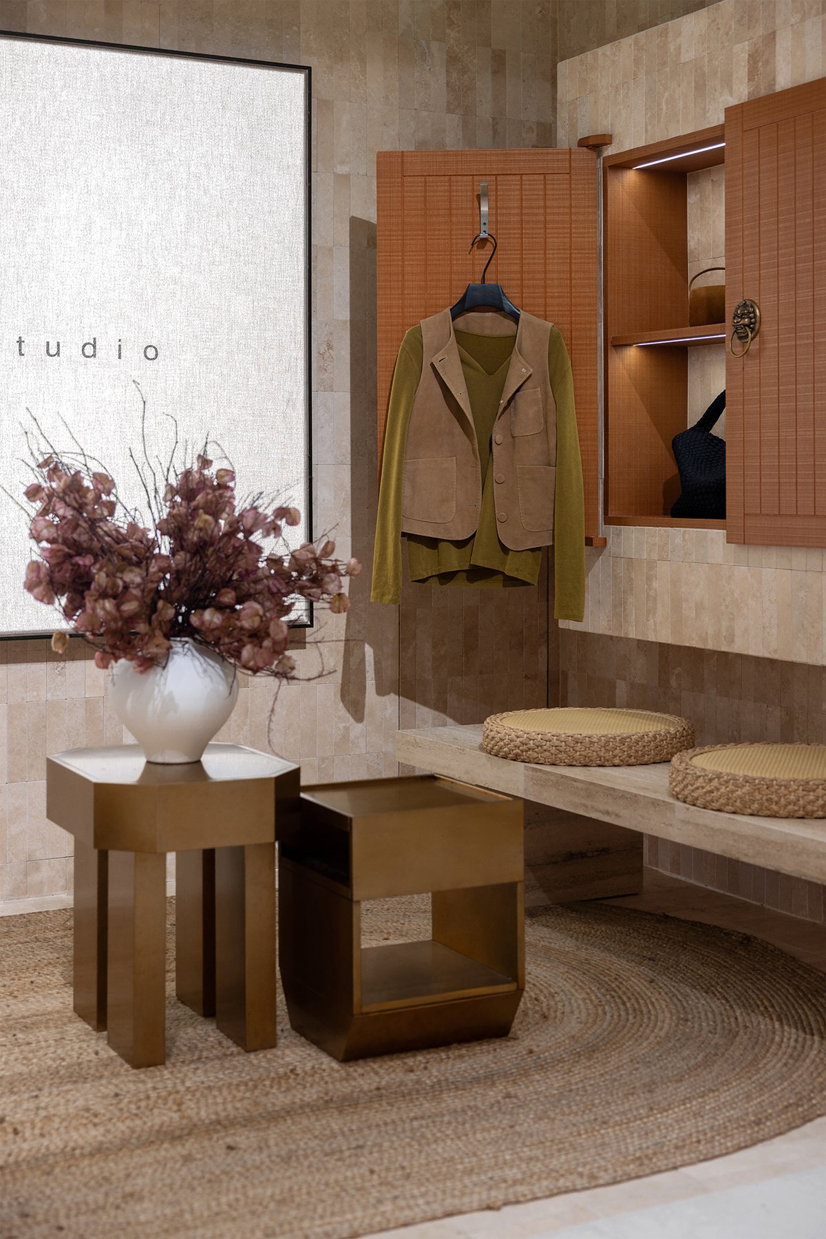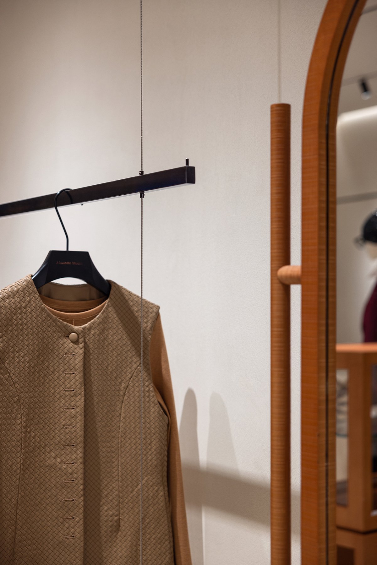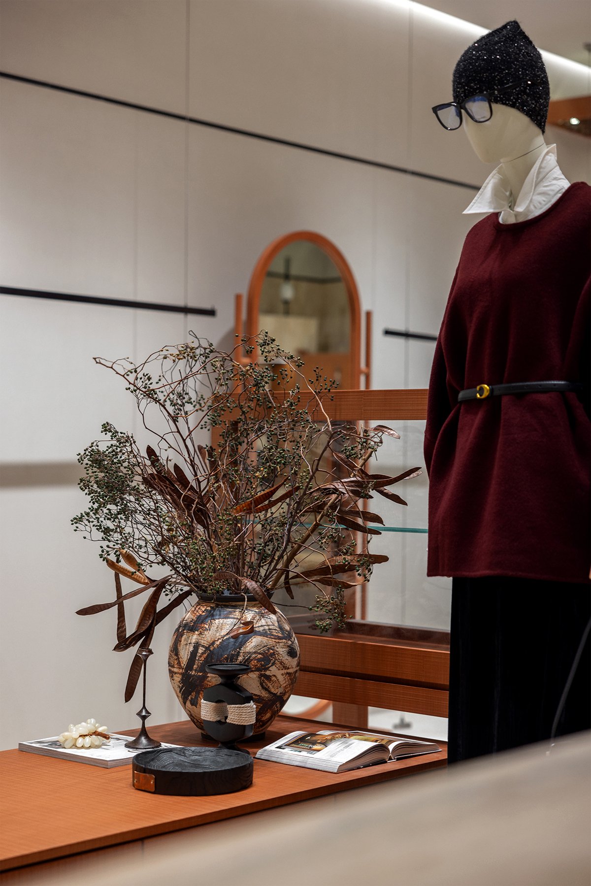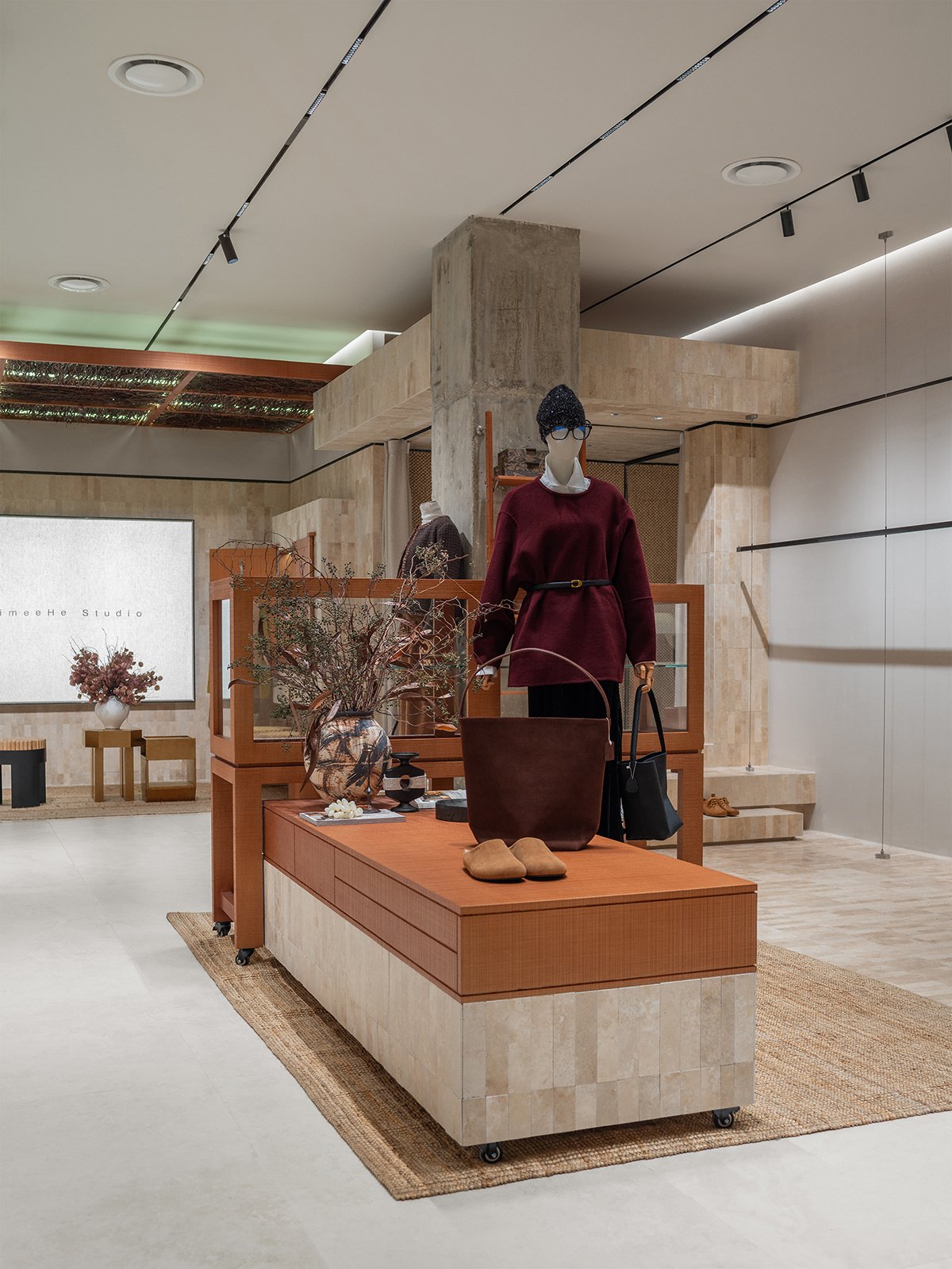 Moving away from conventional linear displays, the project embraces an island-style arrangement with varying heights. The architectural structures and ceiling act as a backdrop for this curated fashion exhibition. Here, display stands organically integrate with spatial structures, blurring the boundary between people and space, subject and object. This interplay nurtures a calm, tranquil experience both physically and emotionally.