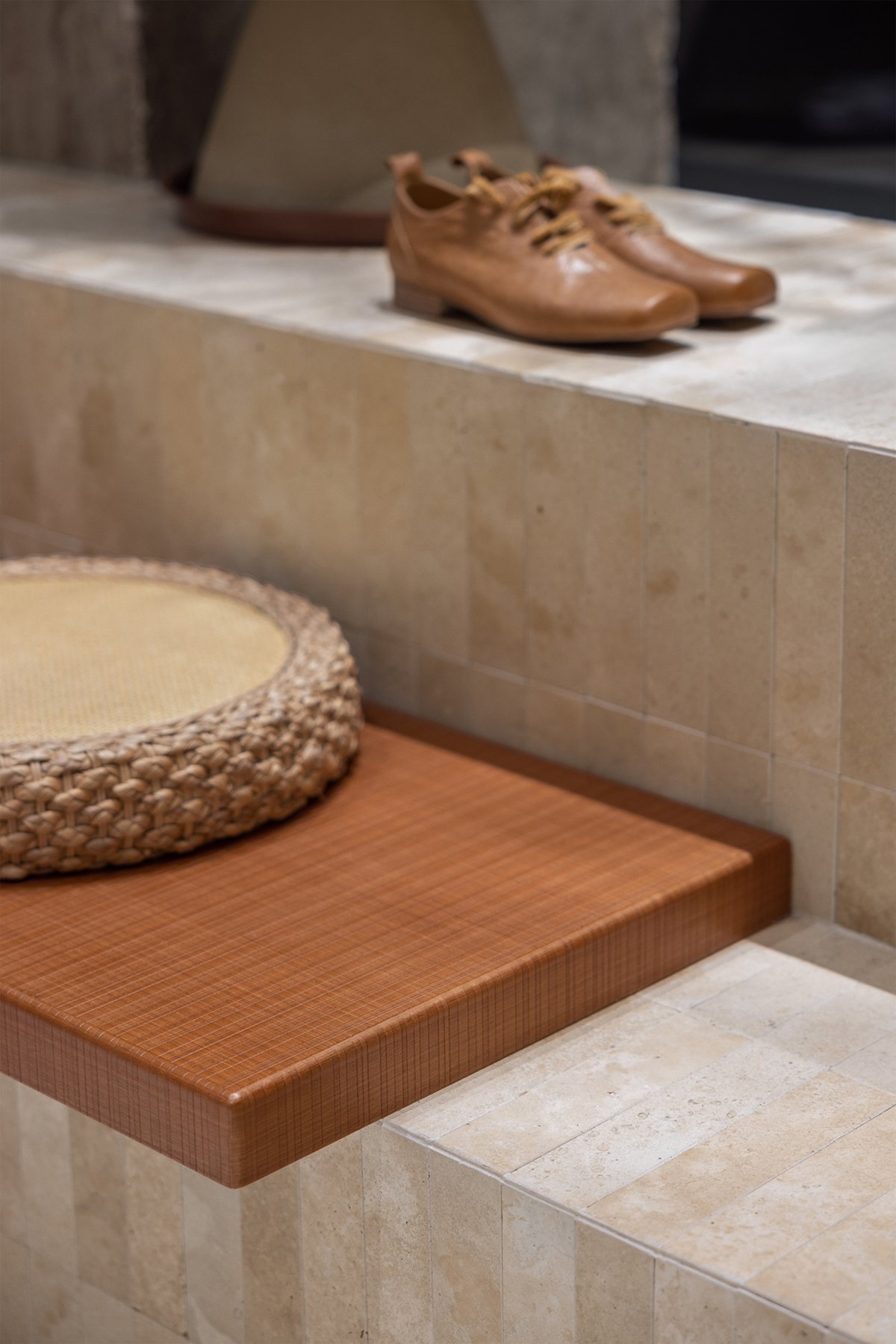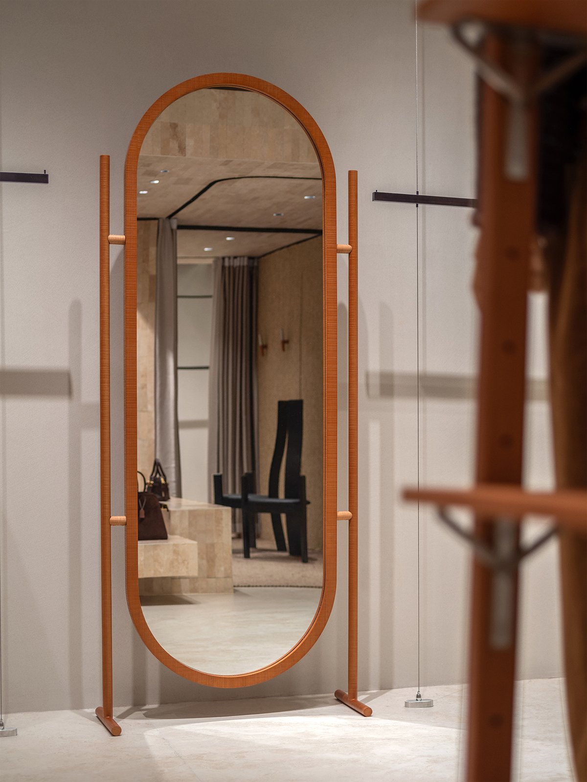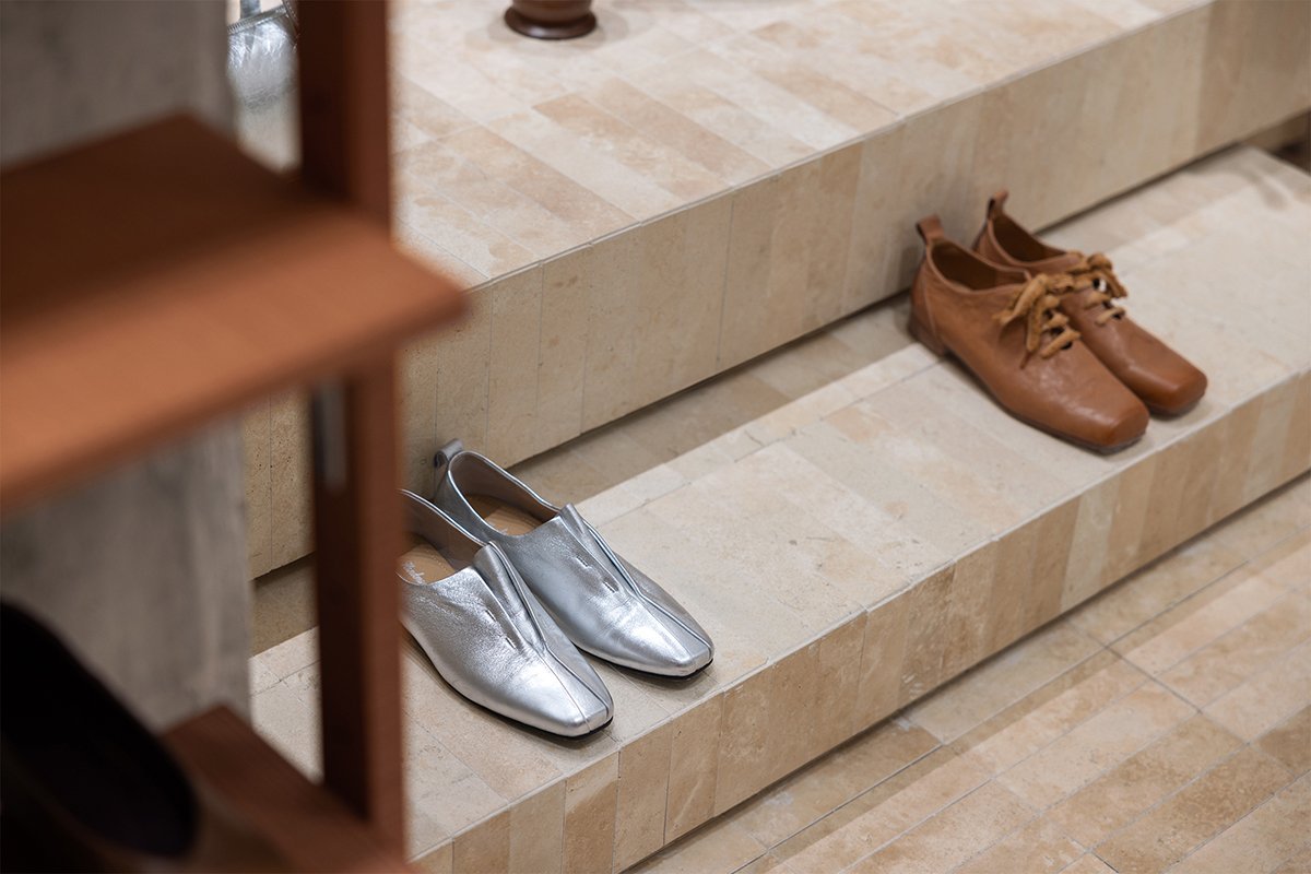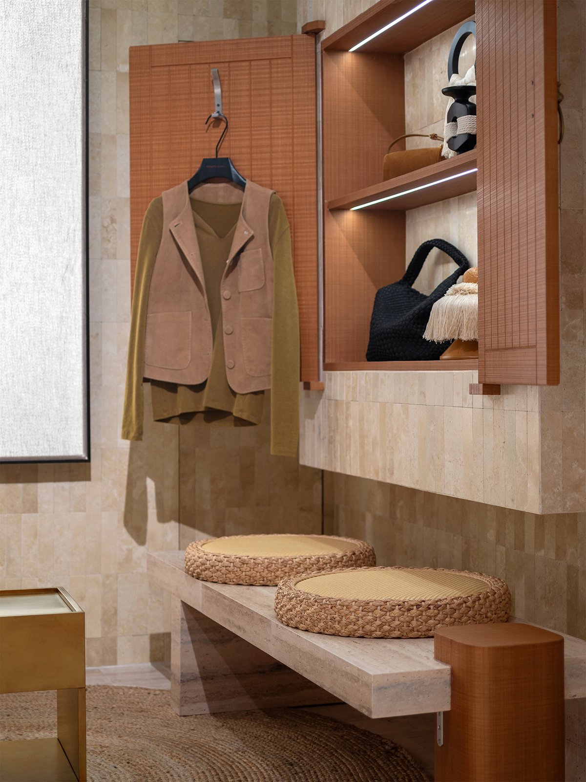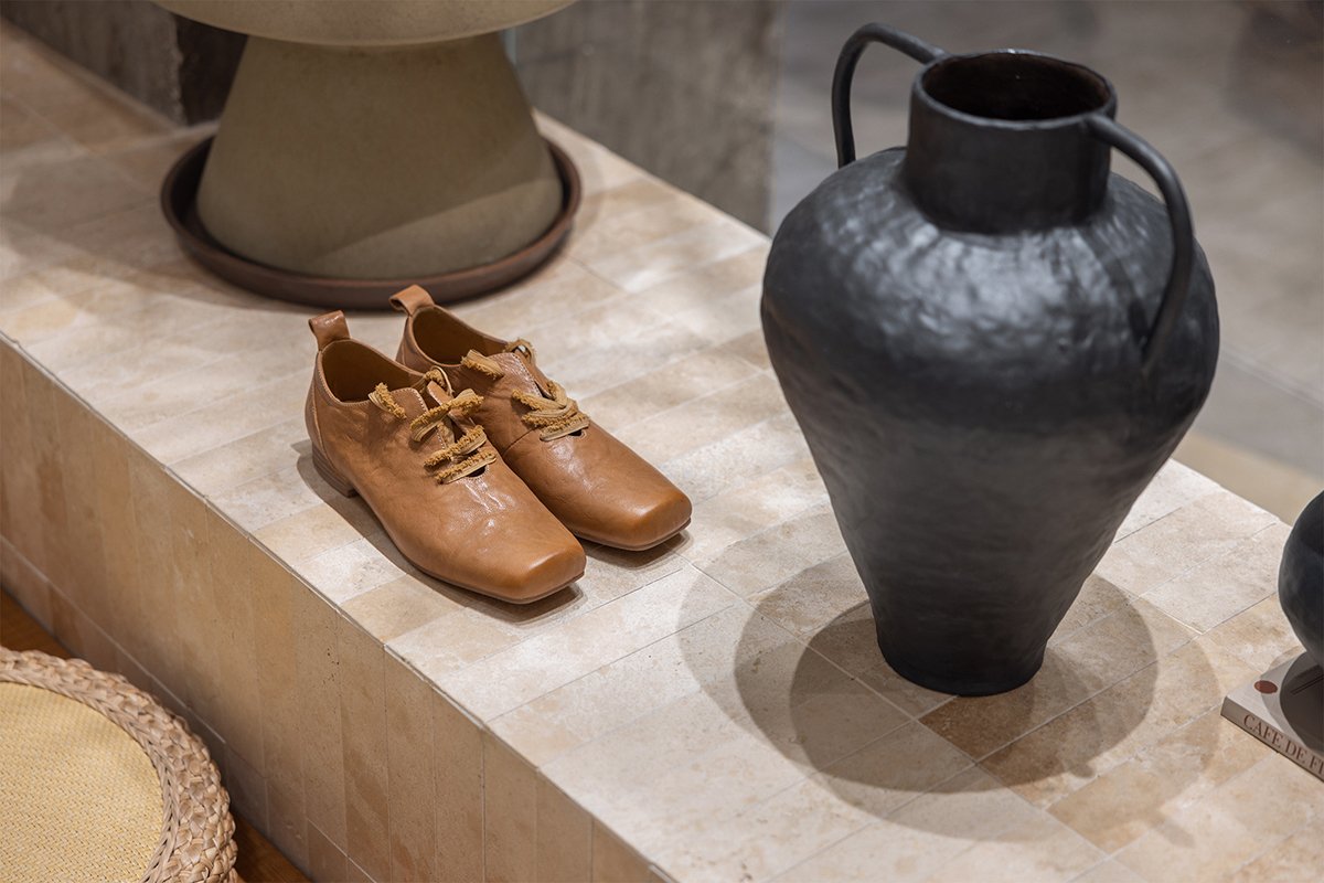 Moving away from conventional linear displays, the project embraces an island-style arrangement with varying heights. The architectural structures and ceiling act as a backdrop for this curated fashion exhibition. Here, display stands organically integrate with spatial structures, blurring the boundary between people and space, subject and object. This interplay nurtures a calm, tranquil experience both physically and emotionally.
