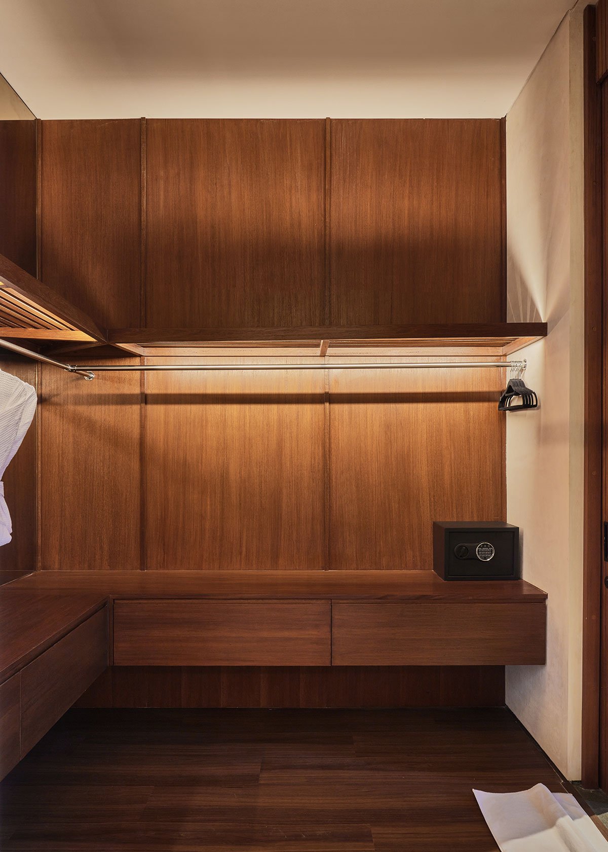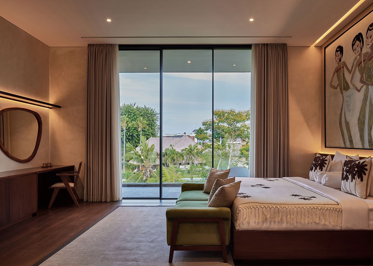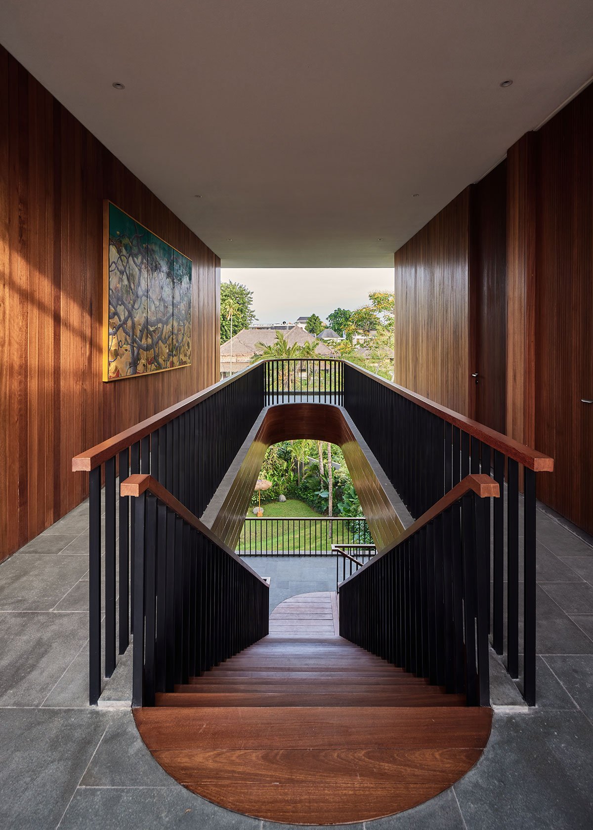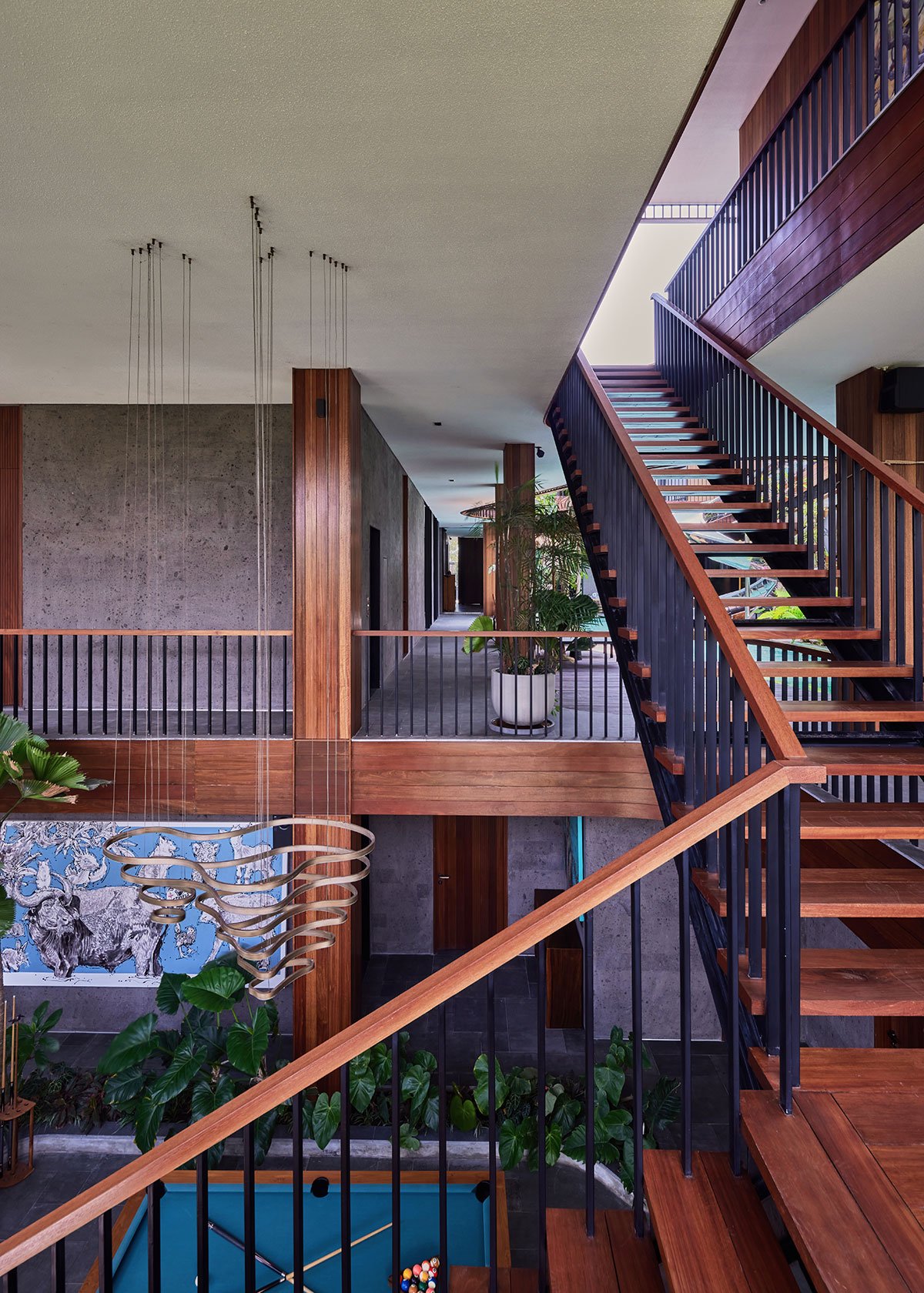 The lower level opens to a tranquil pool, balancing the playful energy of the central void with moments of calm. This thoughtful juxtaposition of elements creates harmony between activity and relaxation, embodying the home’s seamless integration of indoor and outdoor living. The design leverages Bali’s tropical climate, with open spaces, lush landscaping, and natural materials creating a deep connection to the surrounding environment.