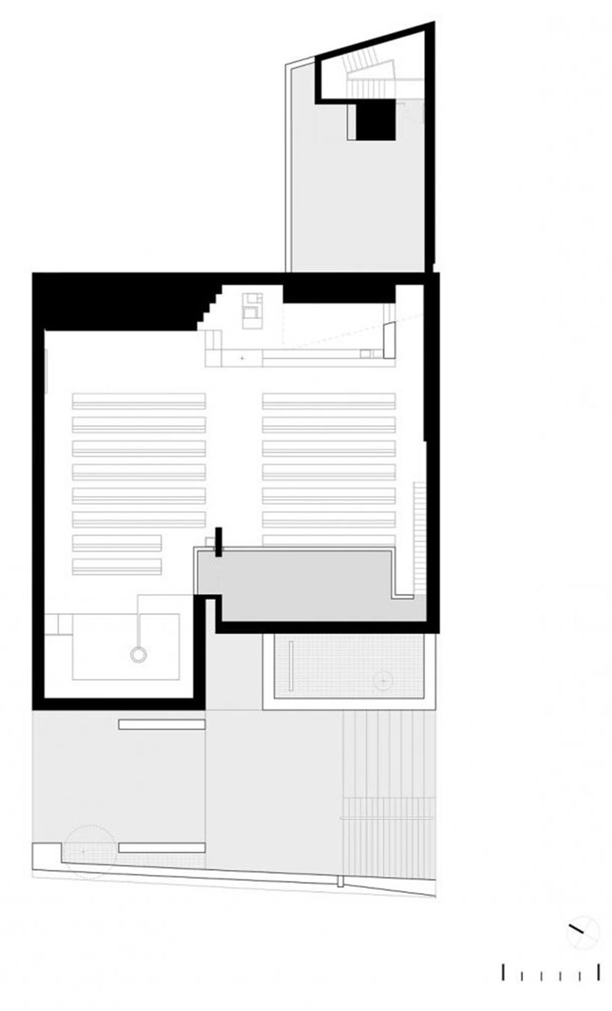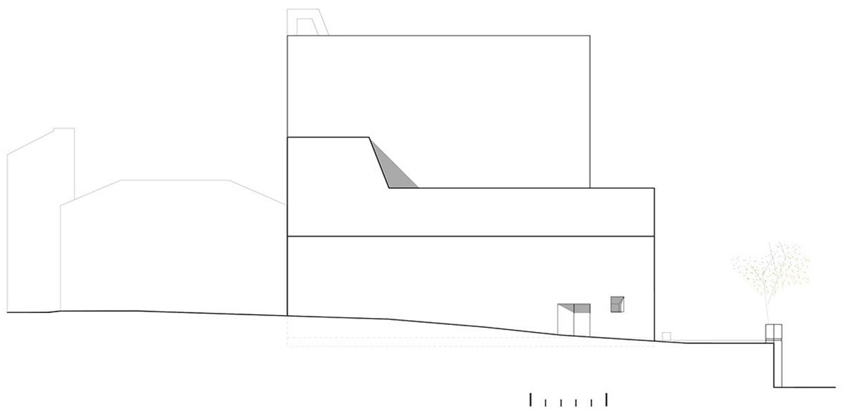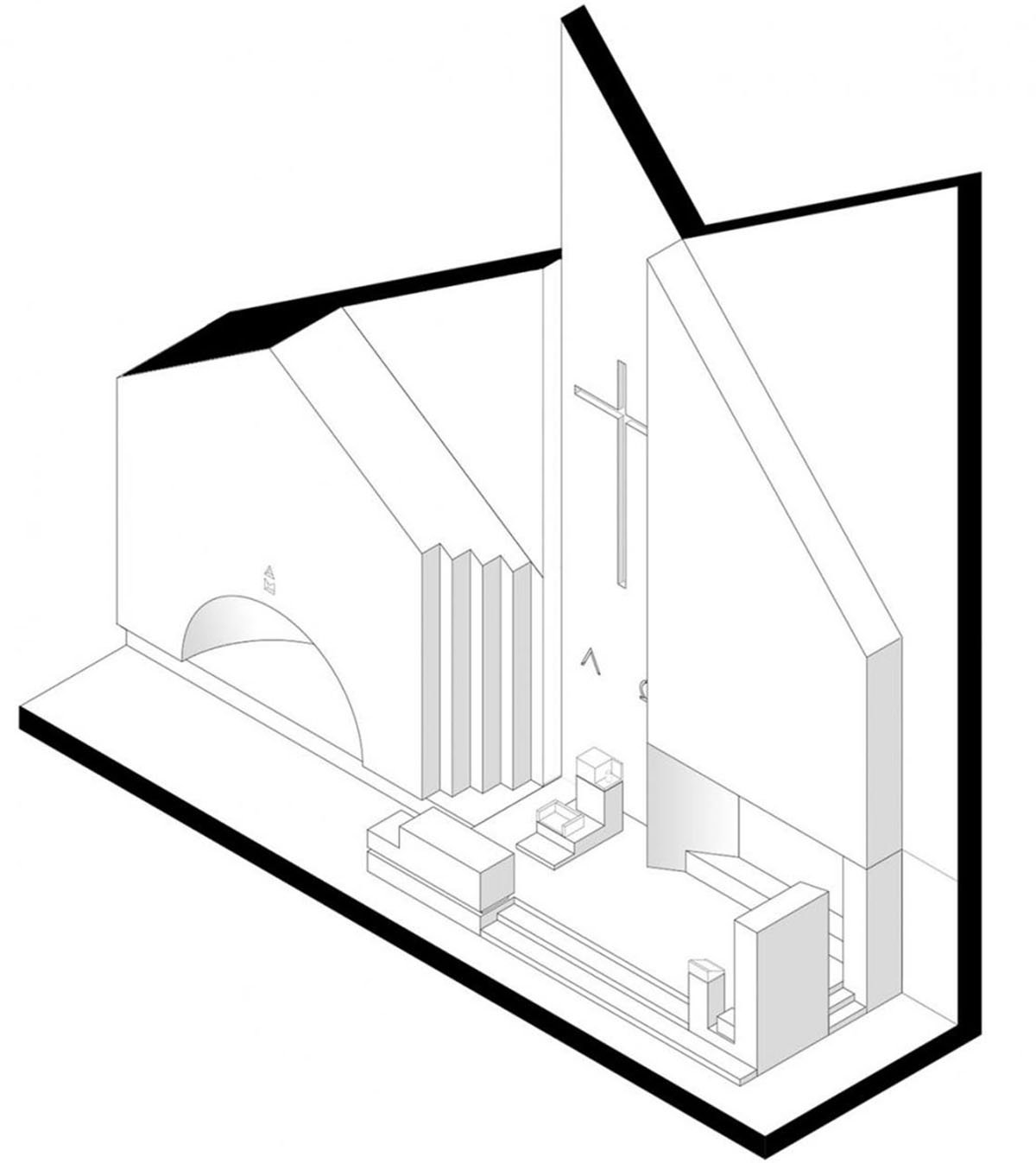 The other volume, like a flame -the fire of the candle-, seeks verticality bringing greater representation to the interior space, which culminates in a skylight that illuminates the presbytery and connects both naves, the old and the new one, symbolizing that there is a bridge between tradition and modernity. The aggregation of volumes comes from the typology of vernacular religious architecture, growing by naves with a patio attached. The strategy of decomposing the building into differentiated volumes has also been used in response to the rigid urban conditions that forced it to align the building with the perimeter road.