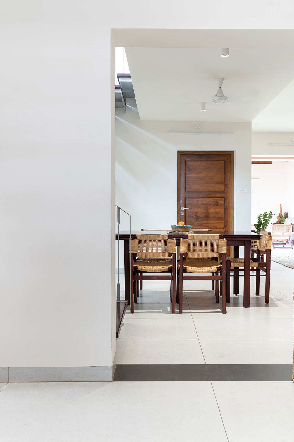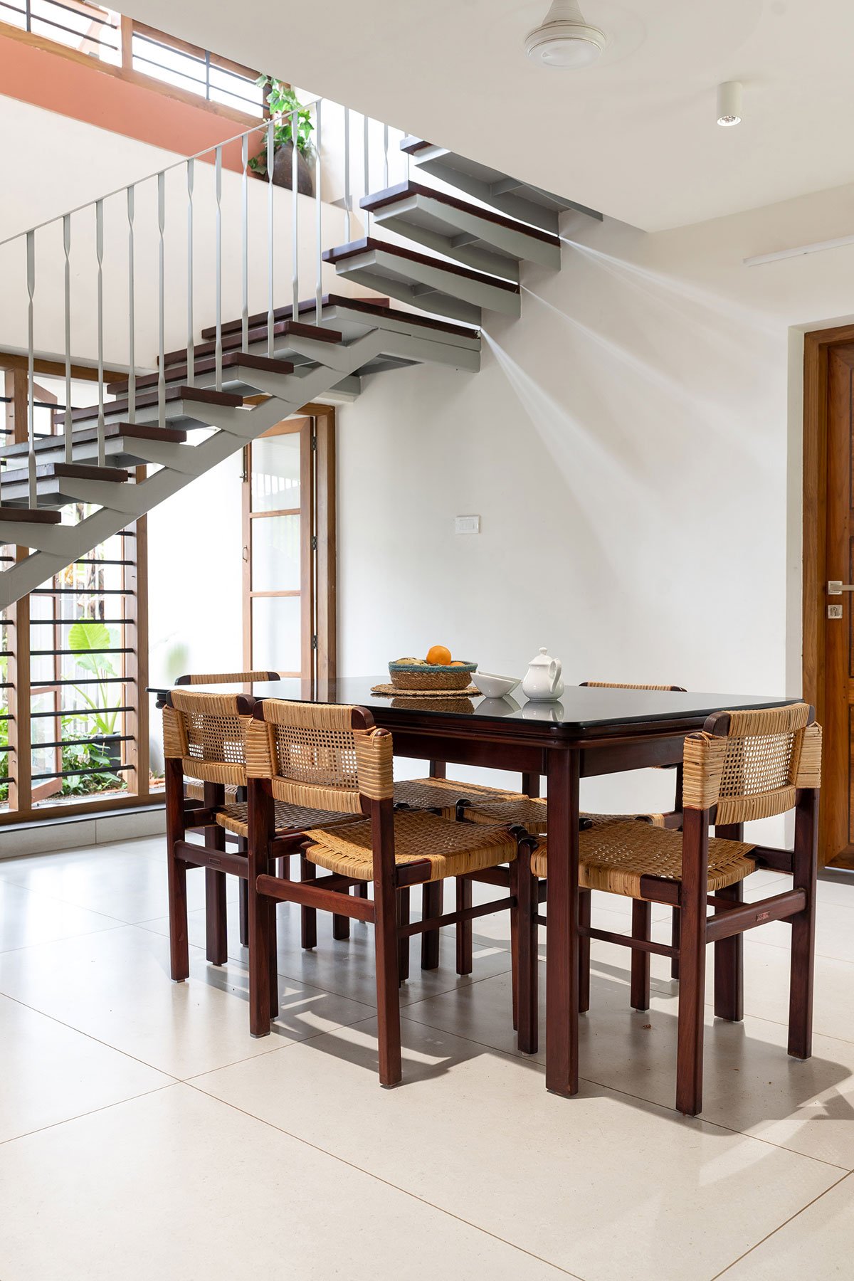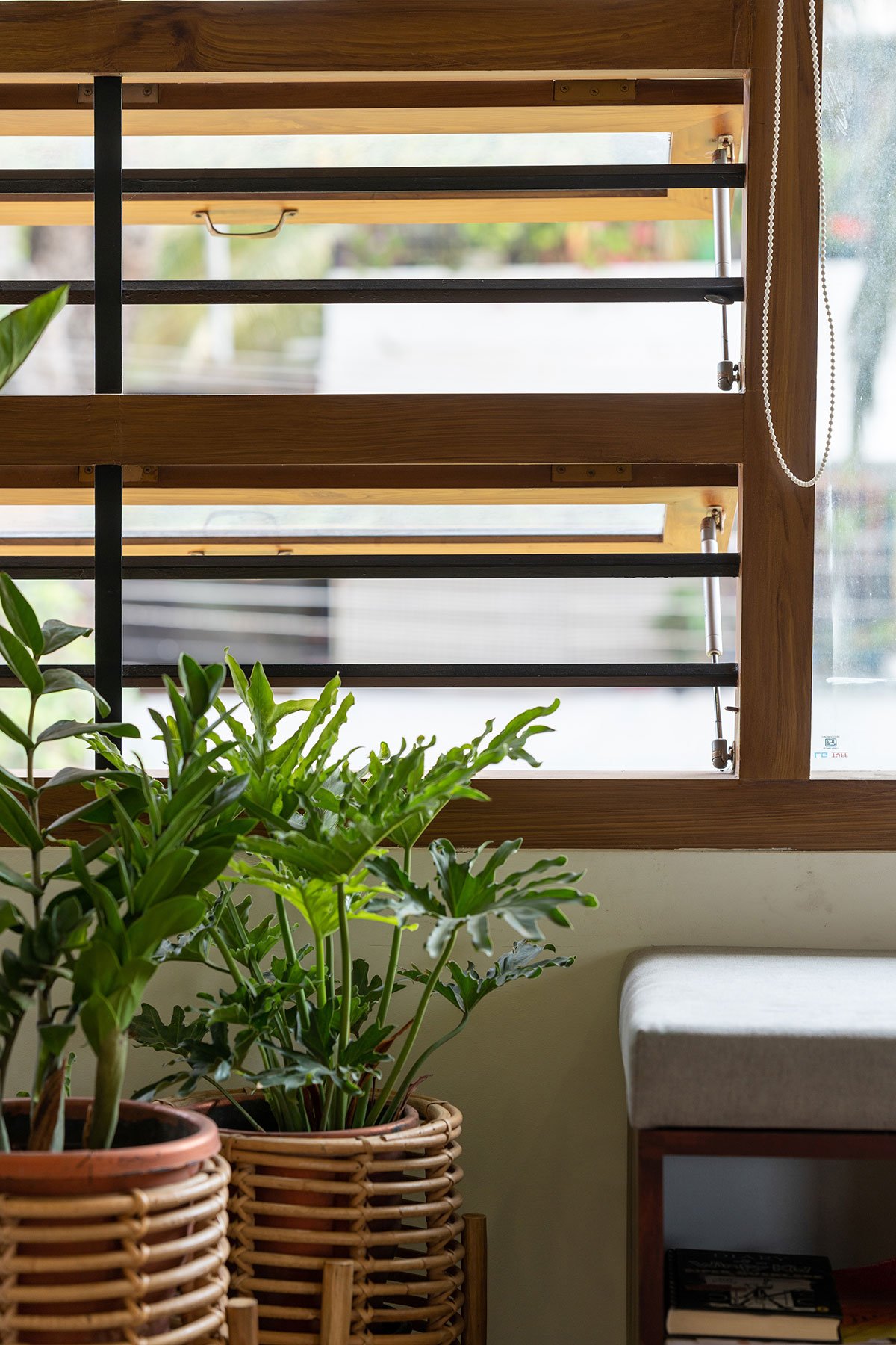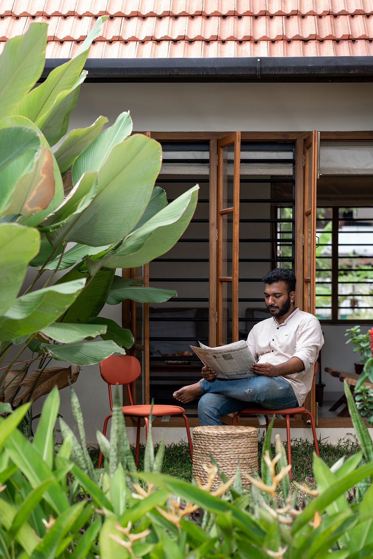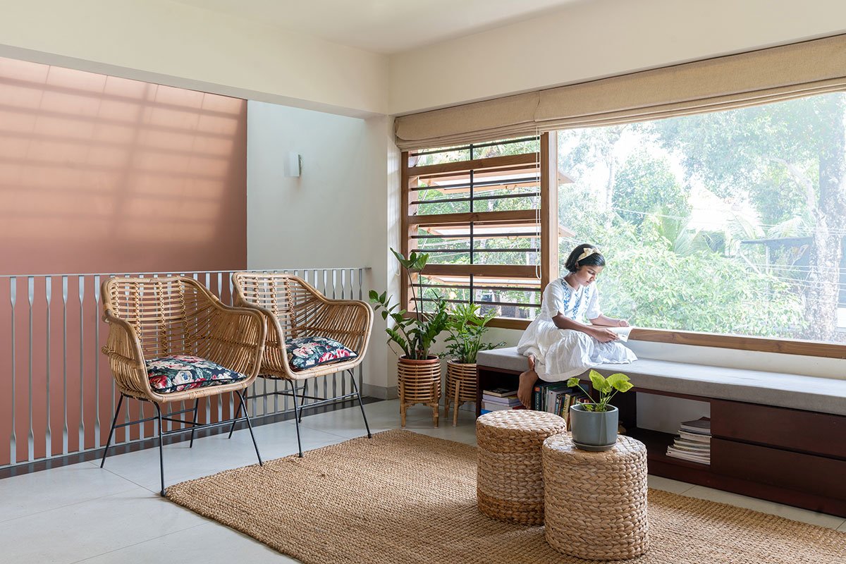 Two pocket courtyards are inserted between the entrance foyer and the dining room. These are designed as spillover spaces with the necessary privacy for the inmates and guests. The family area and the reading room are zoned away from the highway. Indoor plants, rattan weaves, cane furniture, and coir furnishing are extensions of the tropical features of the design concept. The furnishings and colors were hand-picked to complement the tropical narrative.