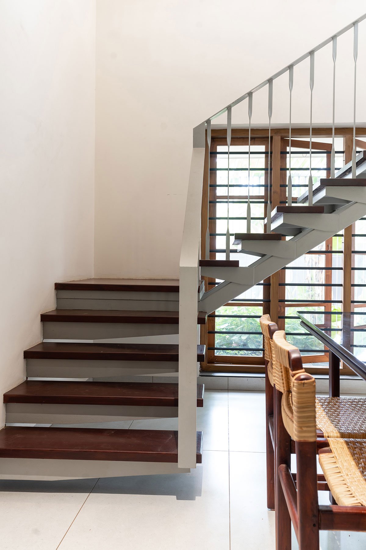 The landscape inserts, while announcing the point of arrival, also aid in buffering and ensuring privacy within the open spaces of the house. It enhances visual appeal, regulates temperature, and reduces noise while being a visual barrier from the adjoining highway. It also opened the possibility of designing an open plan with prominence for cross ventilation and natural lighting, which is inevitable considering the humidity of the context.