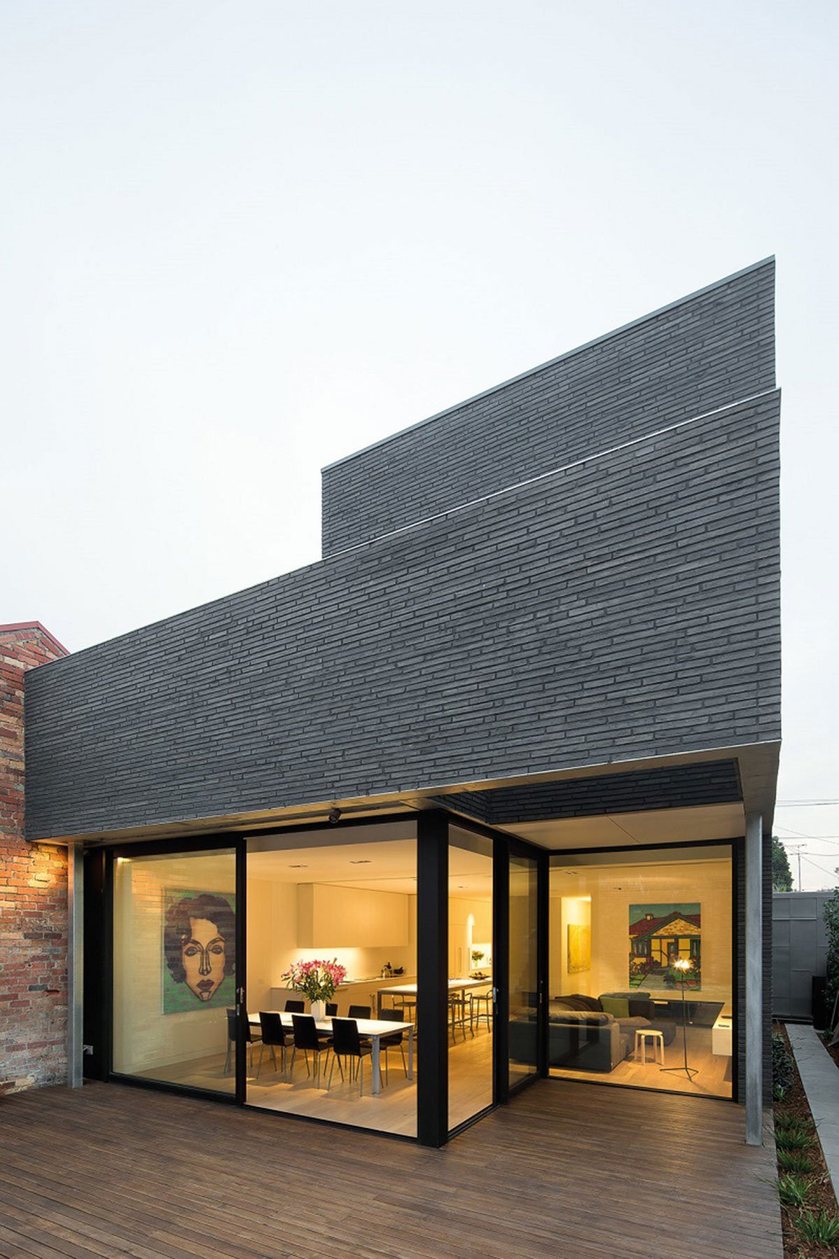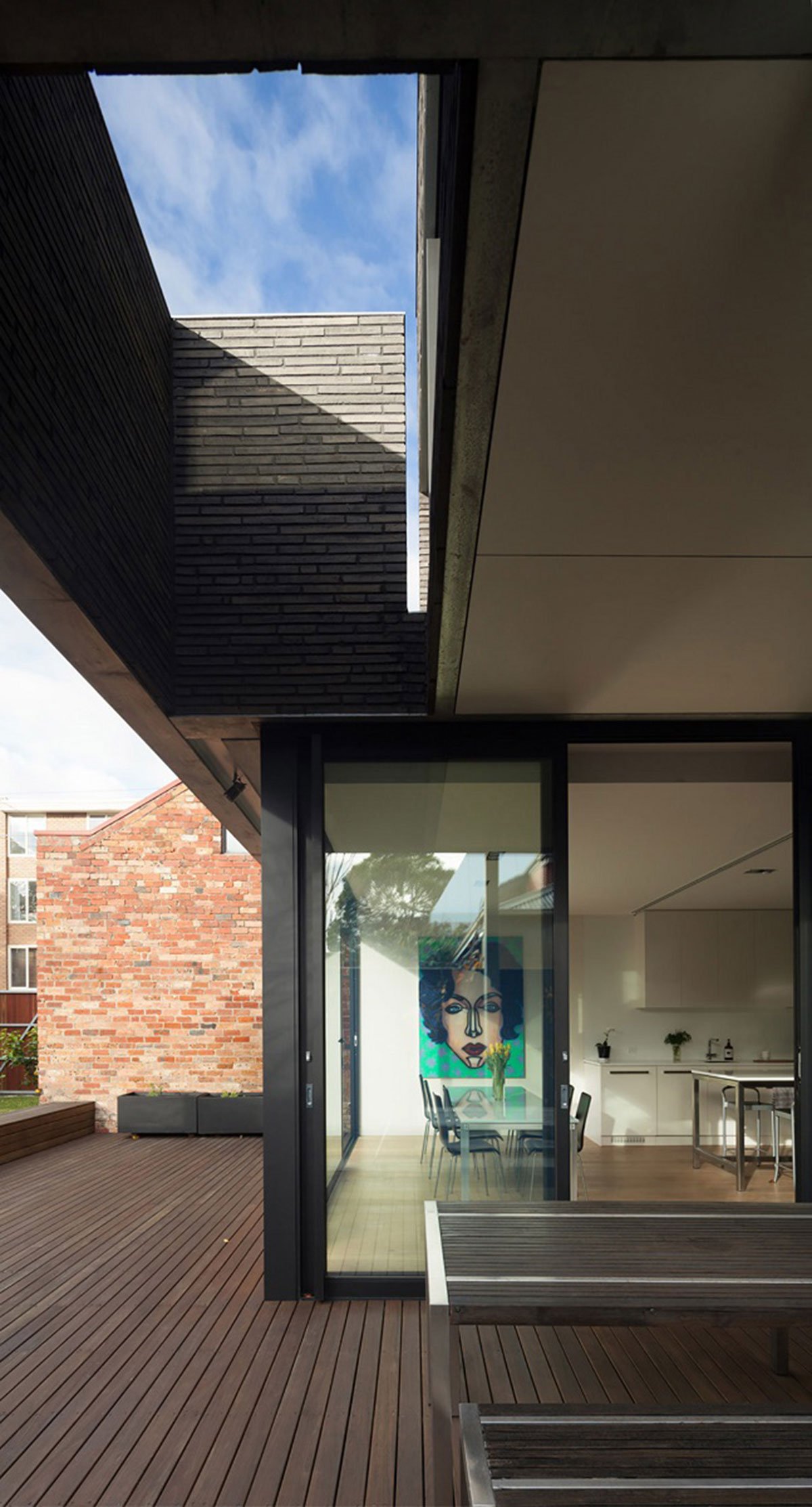 Excerpt: Alexandra Street House, designed by Robert Simeoni Architects, reads as a strong, heavy form broken down through a series of shifts and slippages. Hints of almost carved, sheltered spaces behind the building’s skin are evident where these slippages occur, resulting in an introverted dwelling that reveals itself only once inside. High solid balustrades afford visual and acoustic protection. At the same time, deeply recessed windows and integrated balconies help the house to read as a solid form.