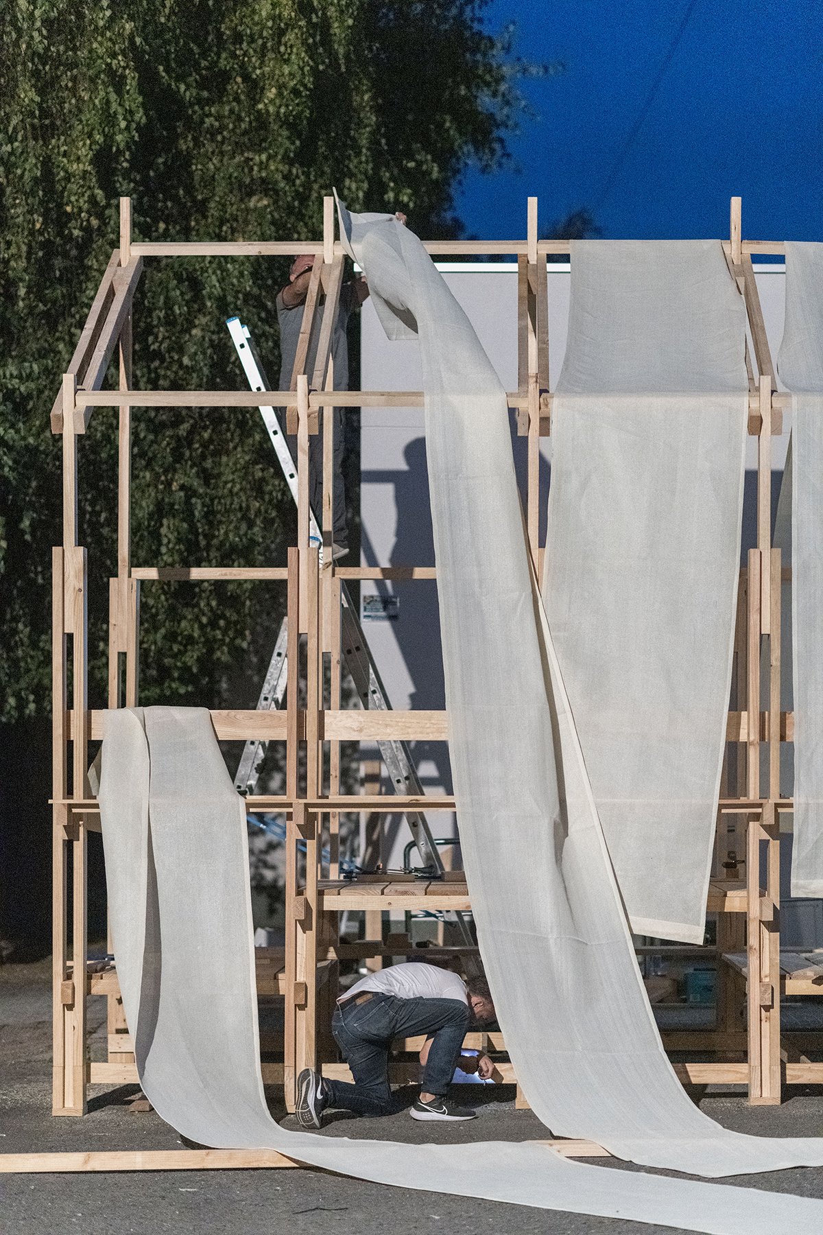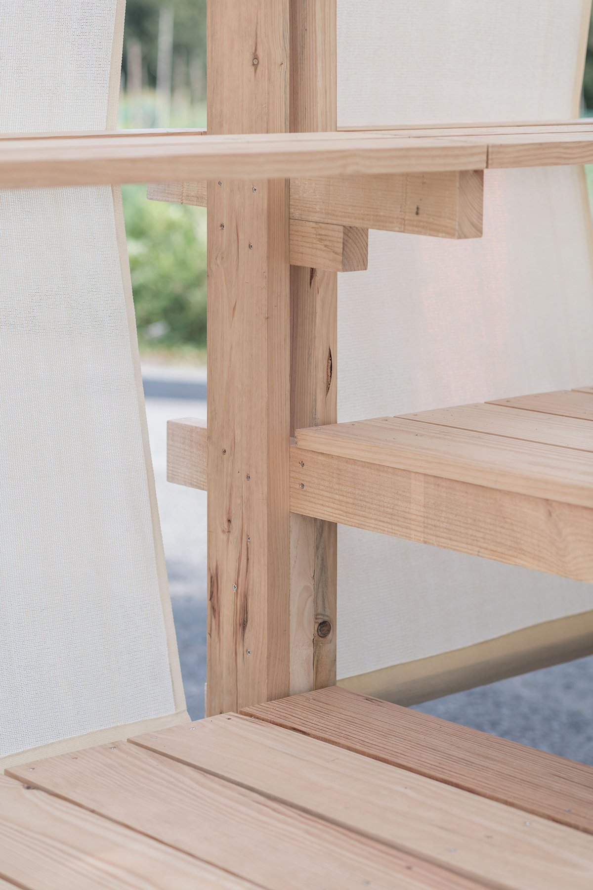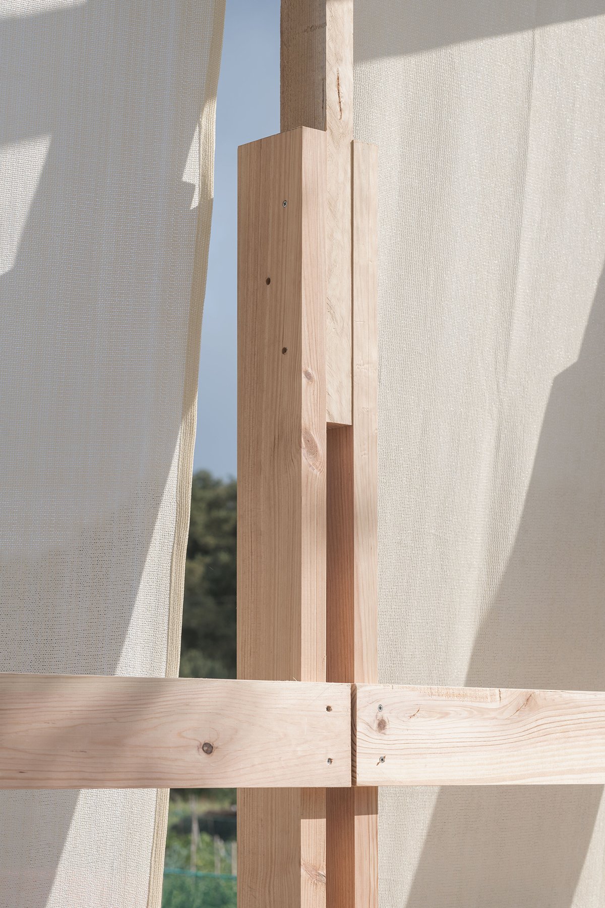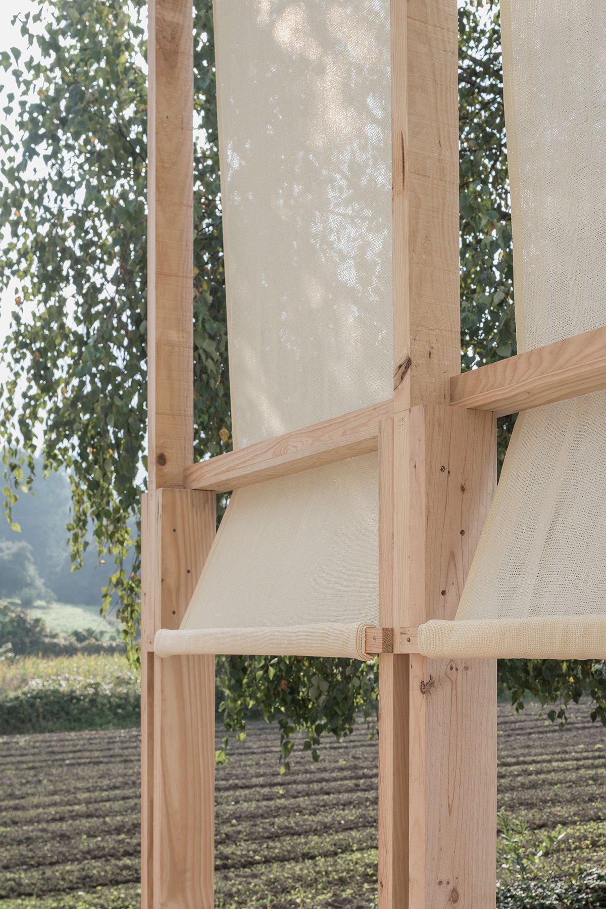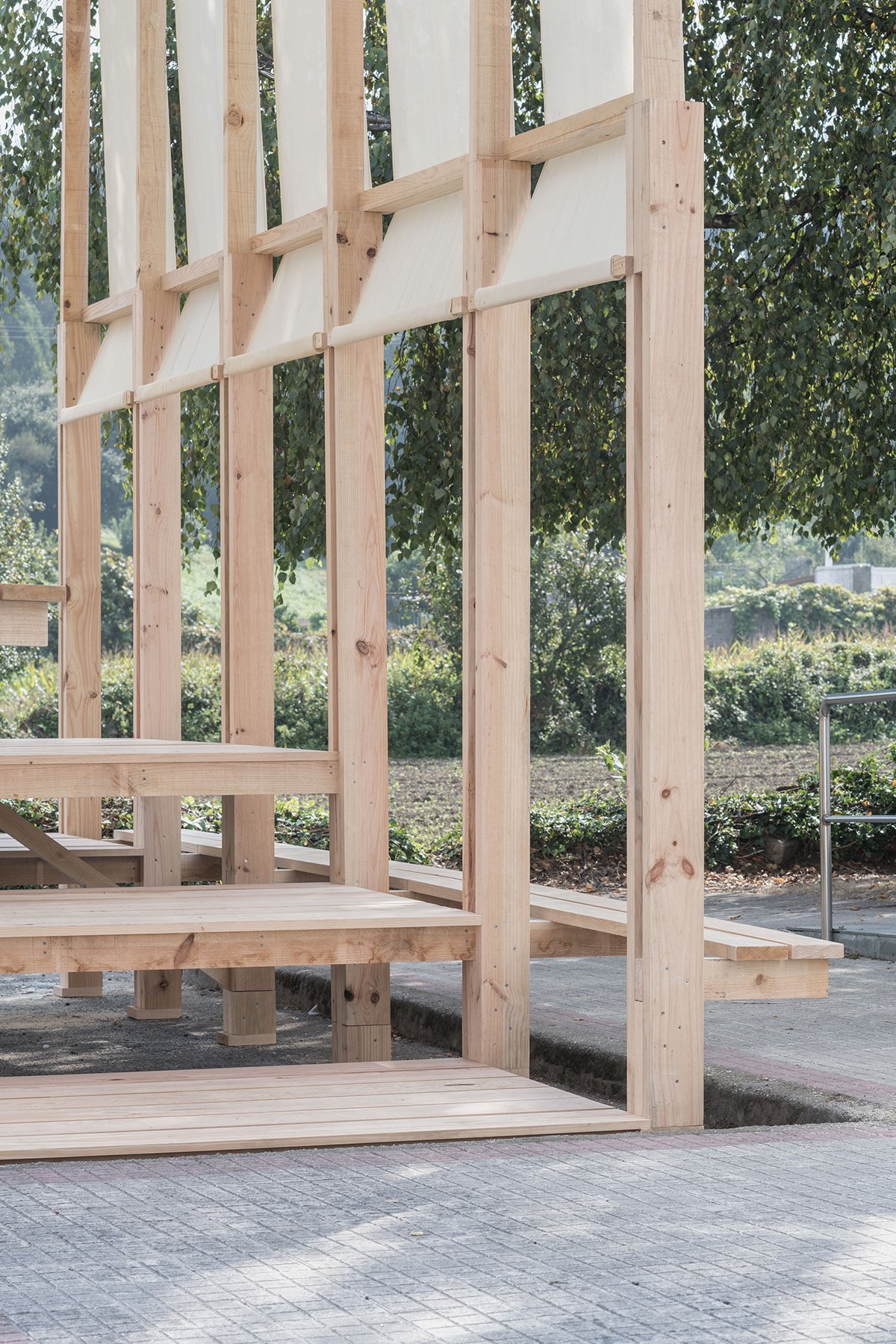 Excerpt: Alpendre by CESUGA School of Architecture and Erazo Pugliese is a modular wooden installation that acts as an architectural threshold between the civic center of Feáns and its surrounding landscape. Combining wood and translucent fabrics, it creates a shared, semi-sheltered space that highlights the material’s expressive potential. The project explores dialogue between urban, industrial, and rural landscapes while promoting wood as a building material.