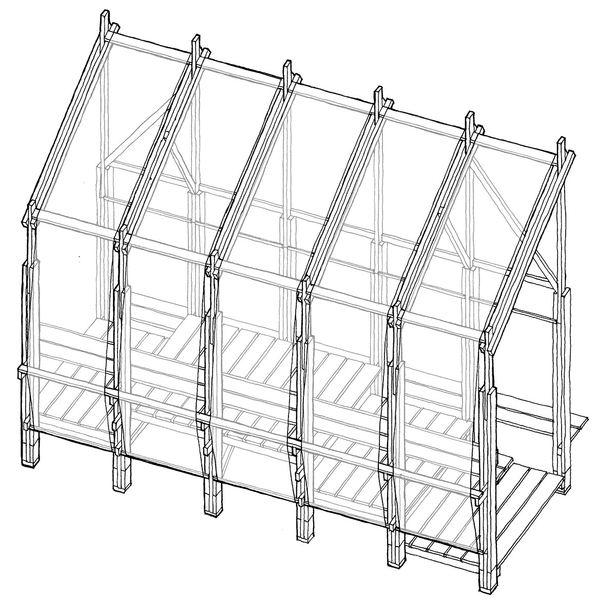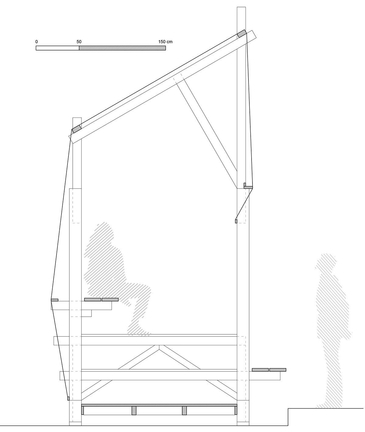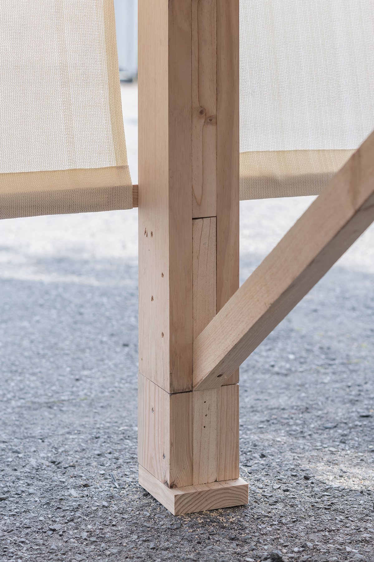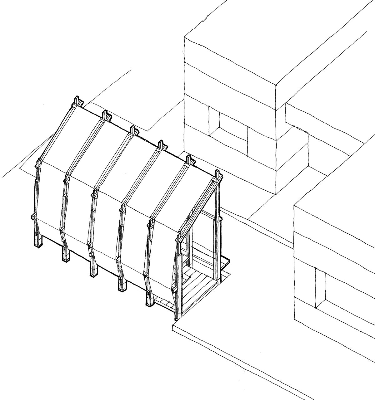 The final installation combined various proposals into a modular structure. Six repeated frames rise to the building’s façade height, covered with translucent fabrics—predominantly on the north façade and roof, and partially on the south. The design emphasizes fabric presence on the north side, highlighting the institution from afar, while showcasing the wooden structure facing the building’s façade. This creates a shared interior space complementing the civic center’s access area. Between these frames, platforms at different levels provide seating, shade, and a slightly elevated viewpoint overlooking the surrounding fields.