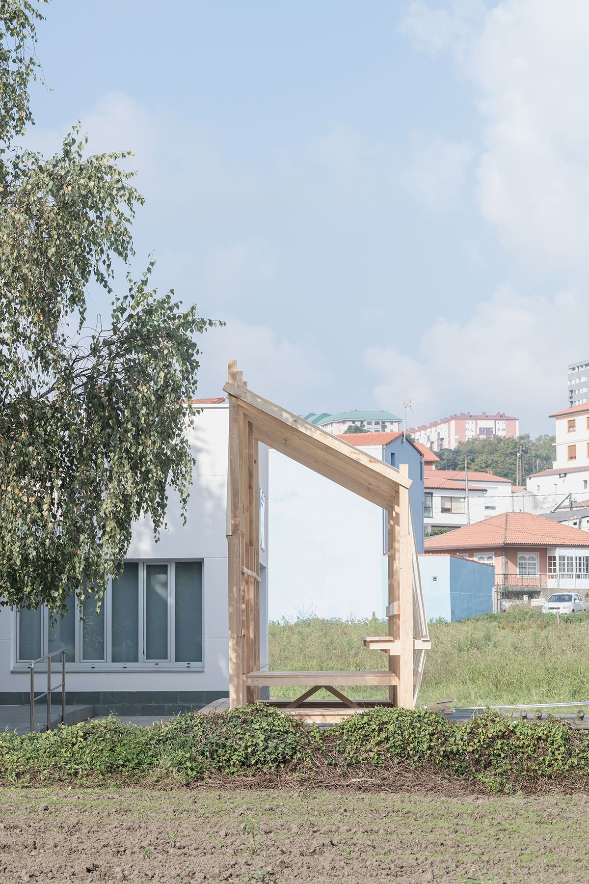 By the workshop’s end, we had created a temporary installation—an experimental prototype standing directly on the ground without foundations. This project explored a dialogue between A Coruña’s characteristic landscapes: urban, industrial, and rural. It sought to mediate between the neighbors and their civic center, and between an architecture disconnected from its geography and a new artifact aiming to establish functional or metaphorical relationships with the region’s architectural identity.