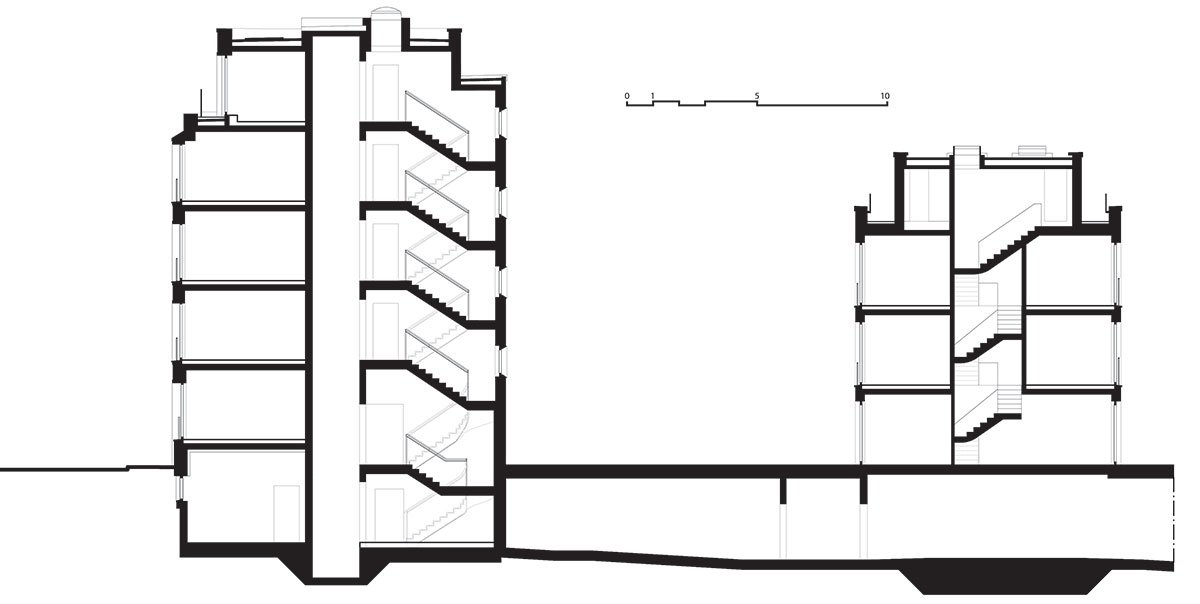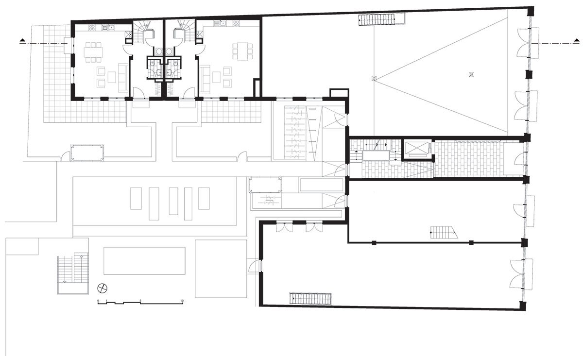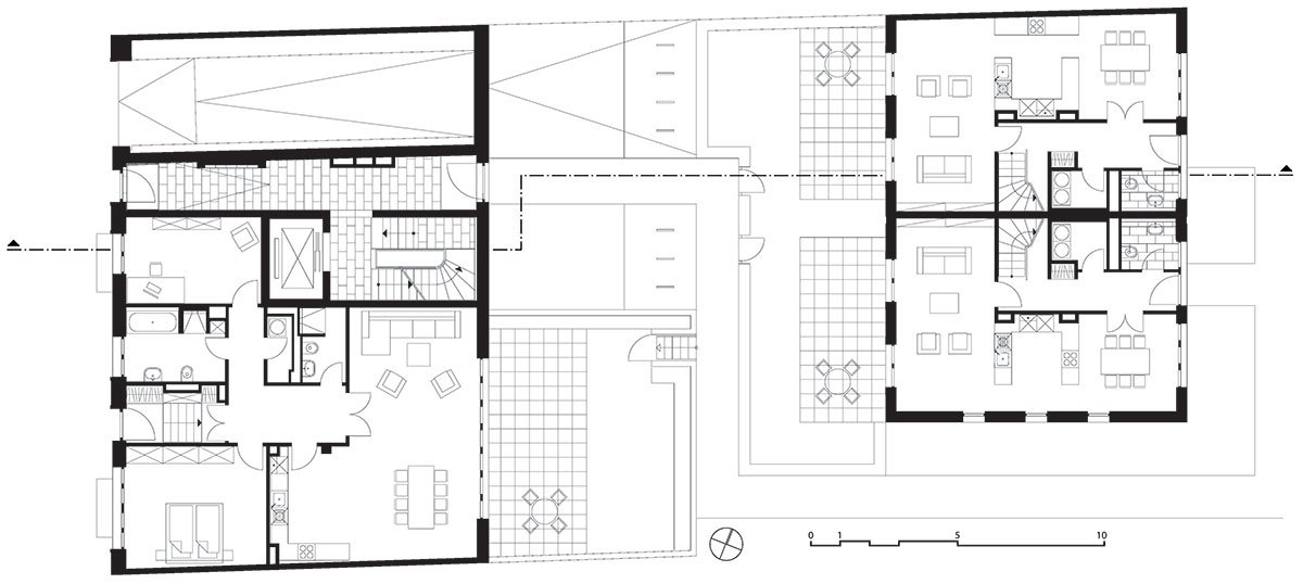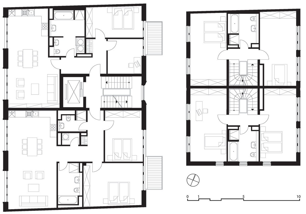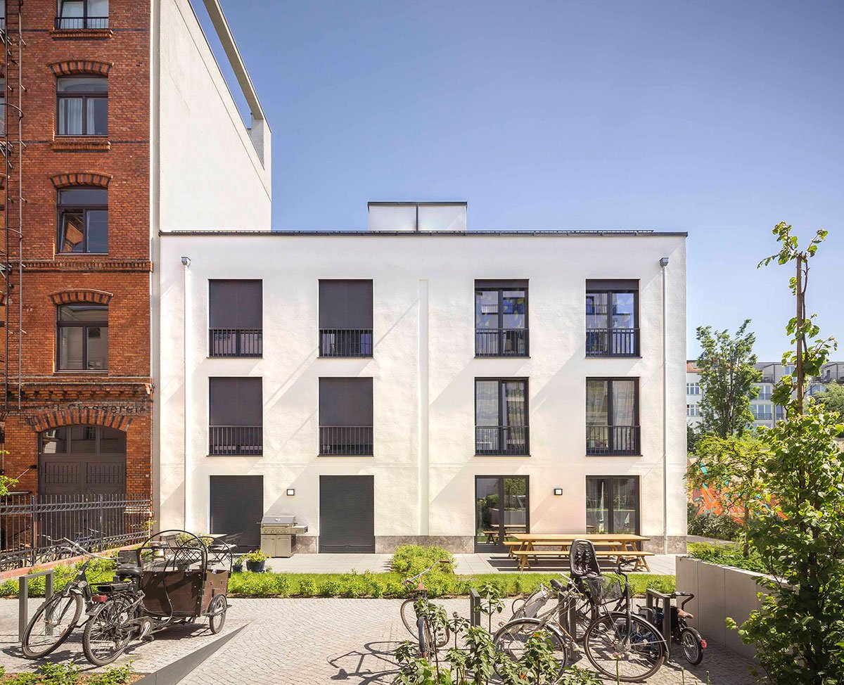 Lively street sounds don’t really reach the green, quiet inner courtyard. Four townhouses are located here in pairs. Two houses dock the main building at the Alte Schoenhauser Strasse and further two houses dock the fire wall of an existing building. The garden is open to all inhabitants. Additionally the townhouses have private terraces. In total the buildings have 26 rental apartments, each townhouse is one apartment.
